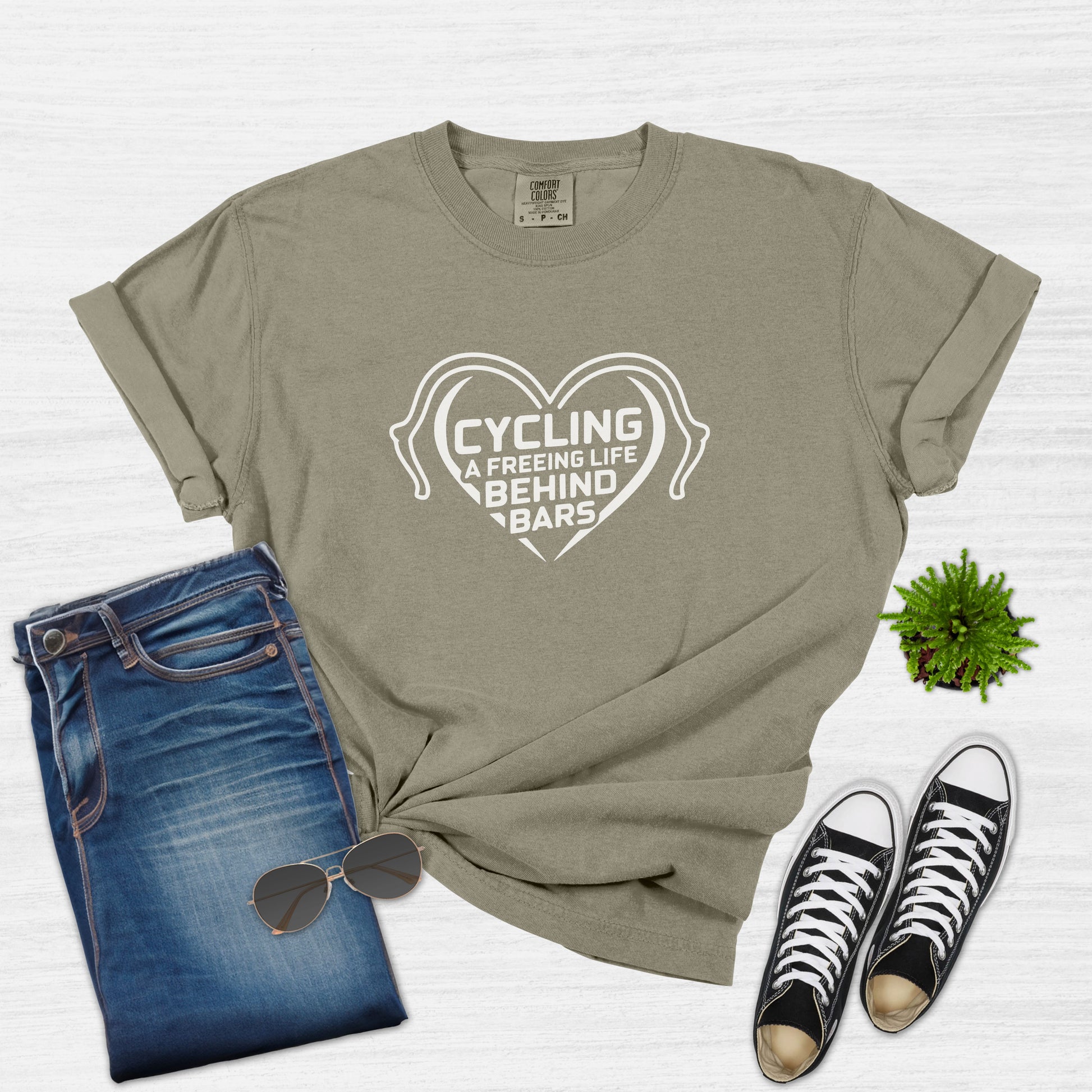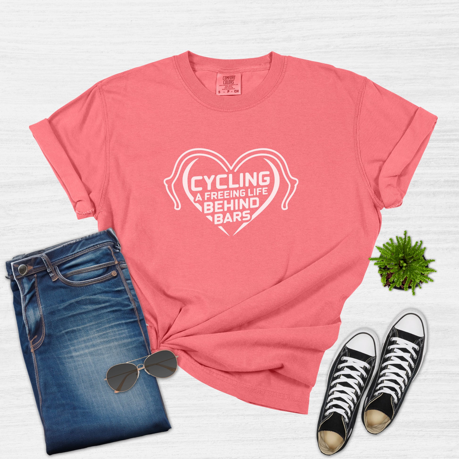 Capture the spirit of freedom and love for cycling with this funny and stylish 'Cycling - A Freeing Life Behind Bars' T-Shirt. Perfect for any woman who cherishes her bike rides, this graphic tee features a unique heartbeat design interwoven with a bicycle handlebar, conveying passion and liberation through cycling. Made from comfortable and durable material, it's suitable for casual outings or cycling adventures. Choose from a variety of cool colors to suit your style, or gift it for birthdays, Christmas, or just because to a cycling-loving wife or friend.