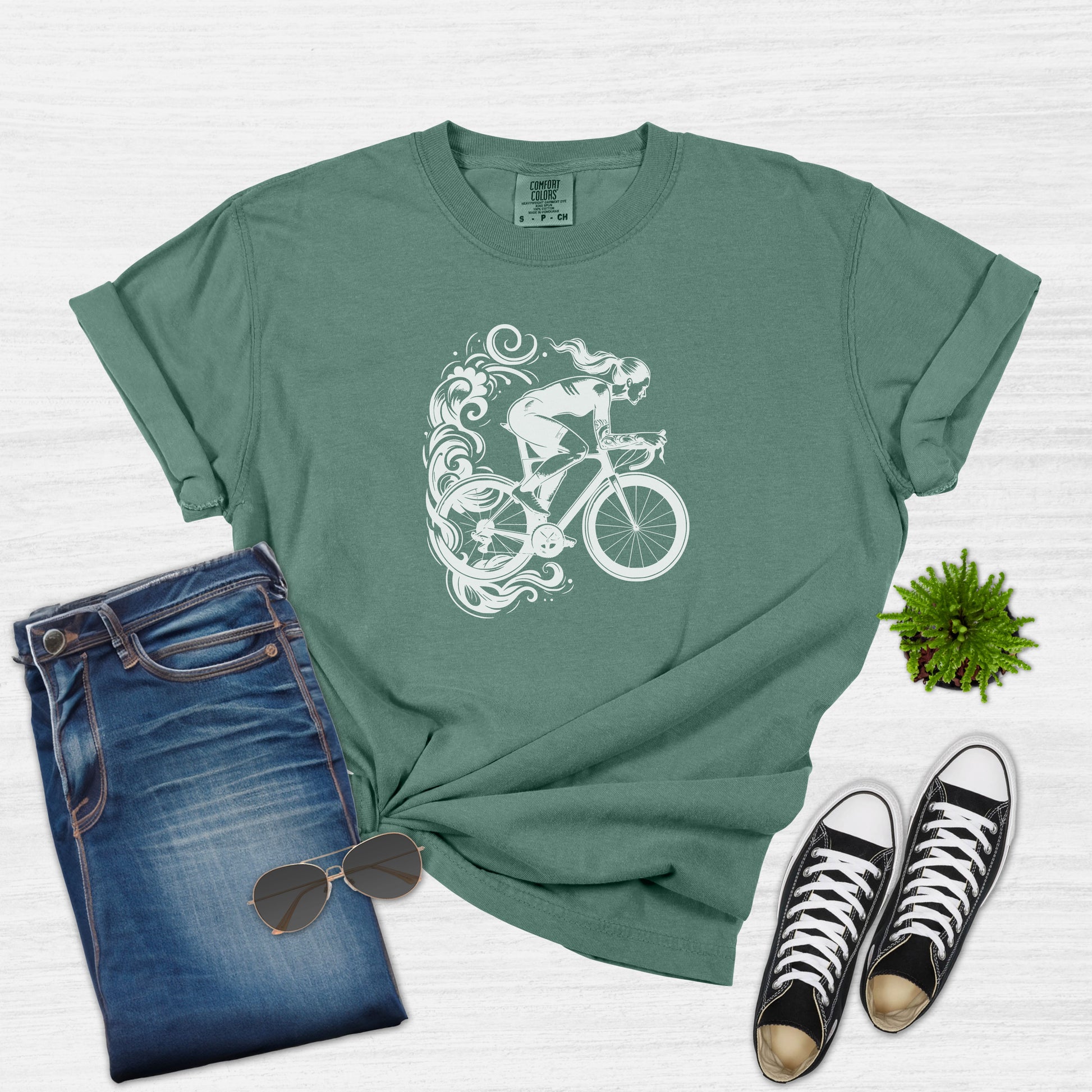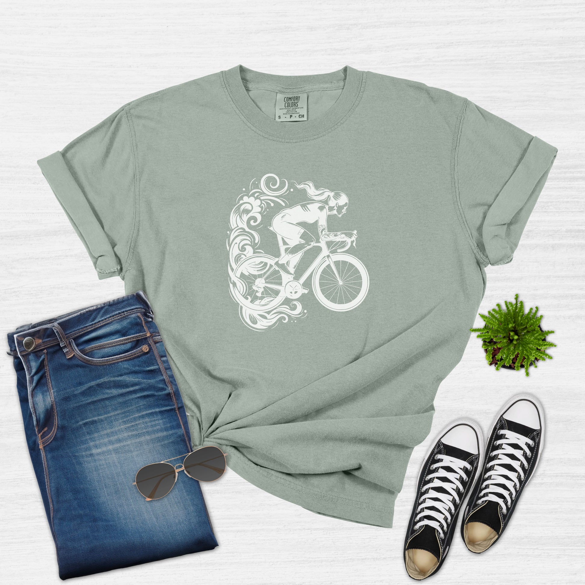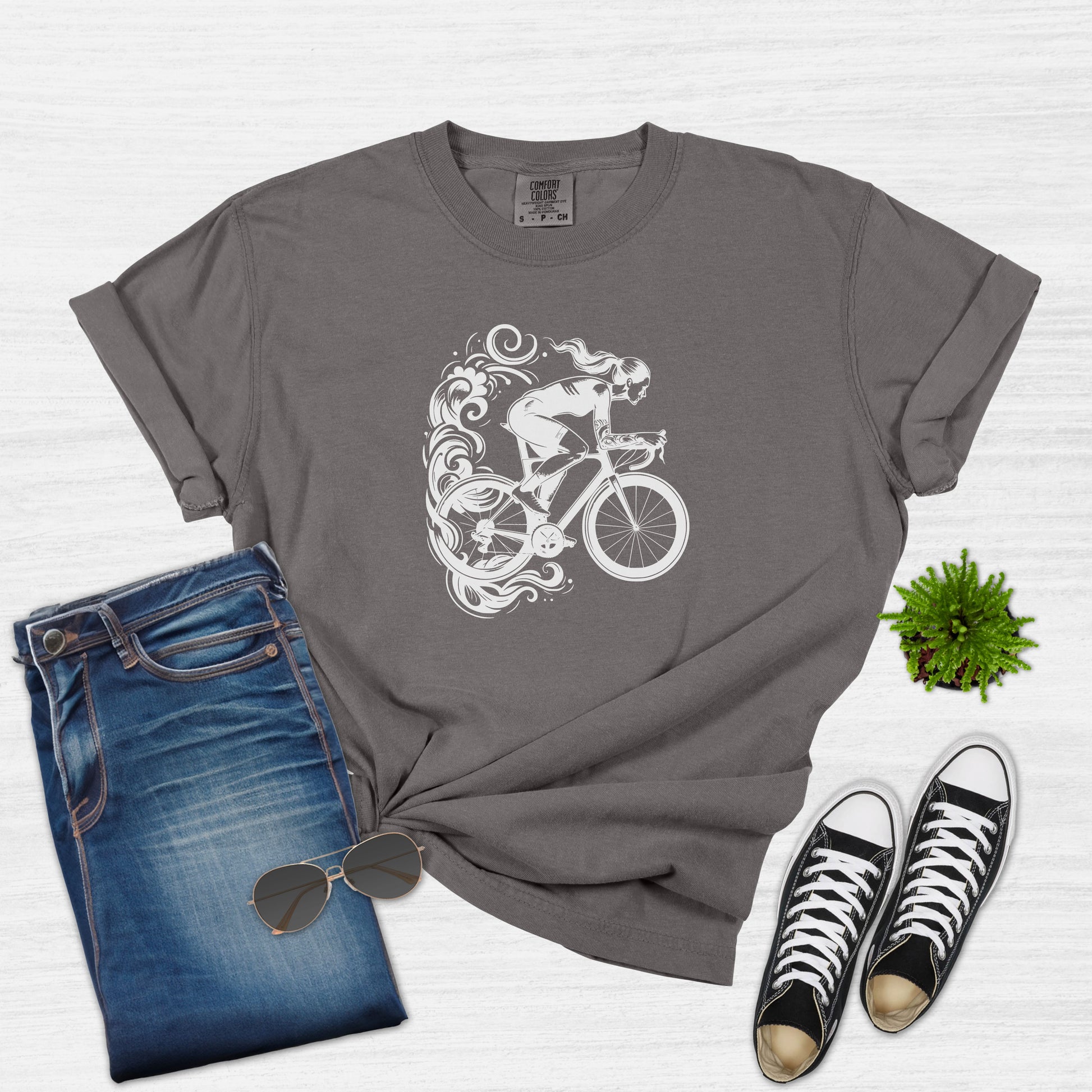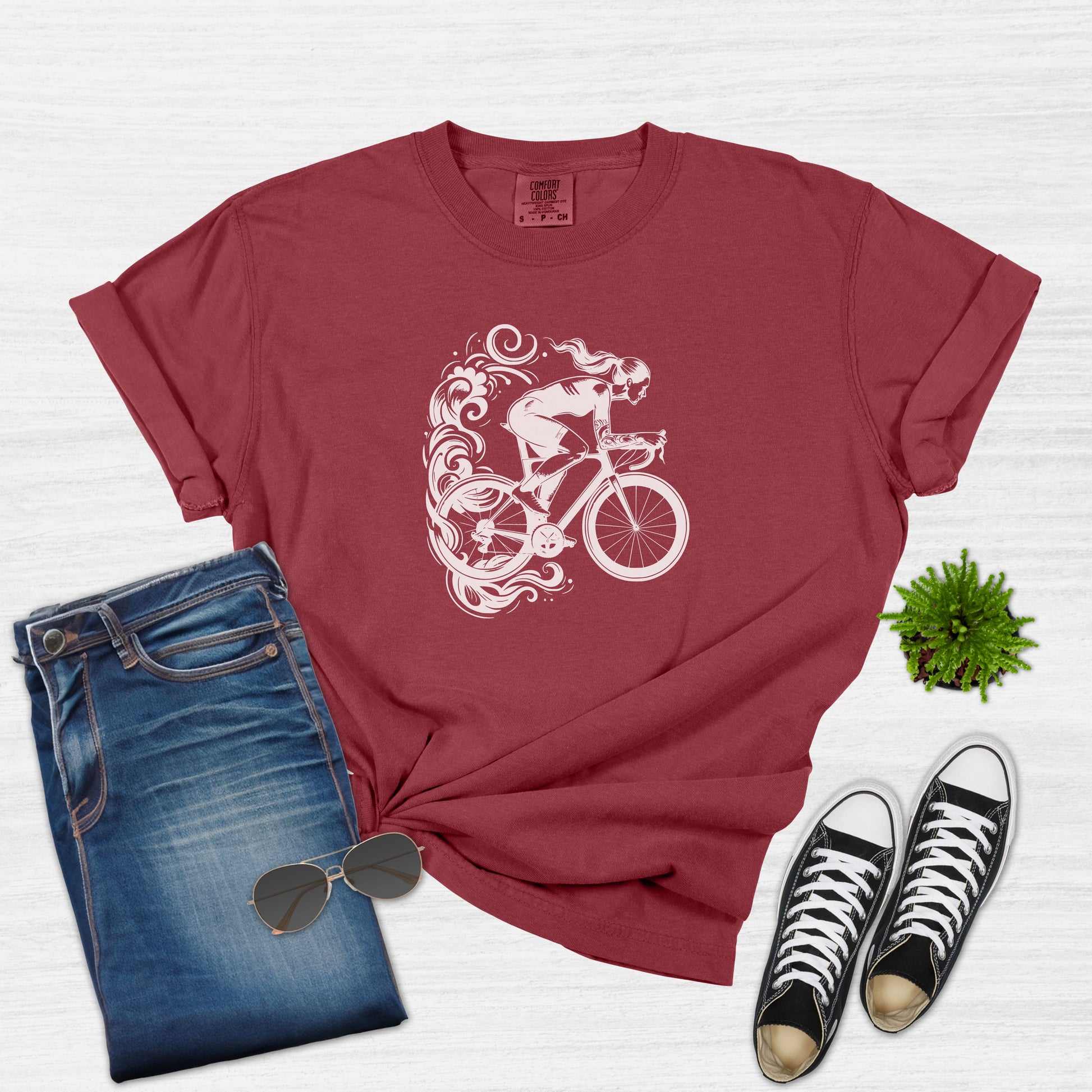 Abraza tu pasión por el ciclismo con esta camiseta bellamente diseñada que presenta a una ciclista elegante rodeada de remolinos artísticos . Esta camiseta es perfecta para cualquier mujer a la que le encanta montar en bicicleta, lo que la convierte en un regalo elegante y atento para su madre, esposa, hija o amiga. Ya sea que les guste el ciclismo informal o las carreras serias, esta camiseta será un éxito en Navidad, cumpleaños o el Día de la Madre. Diseñado para ofrecer comodidad y estilo, seguramente se convertirá en una valiosa incorporación al guardarropa de cualquier amante de las bicicletas.