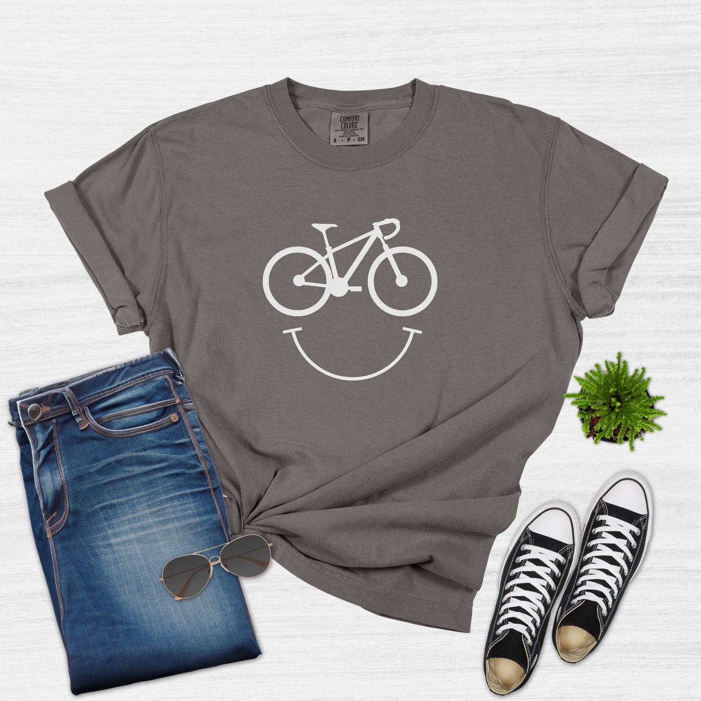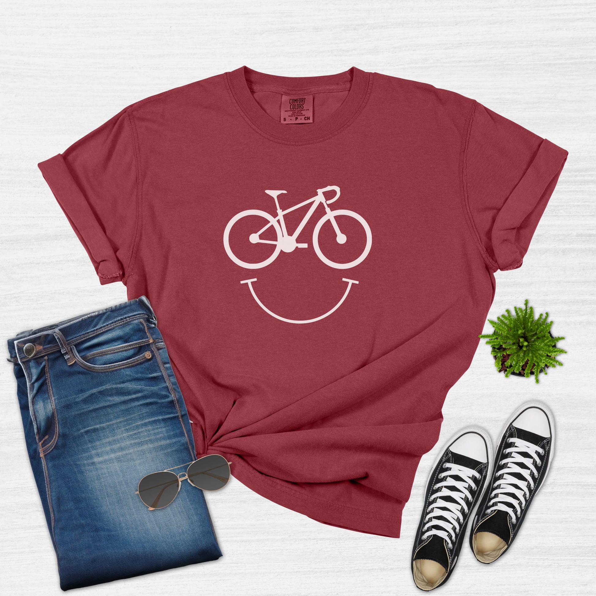This cute bicycle graphic tee is perfect for women who love cycling. Featuring a smiley face design made with a bike, it's a fun and stylish way to show your passion for biking. Makes a great gift idea for birthdays, Christmas, Mother's Day, milestones, or just because. Comfortable and trendy, this shirt will be a favorite in any cycling enthusiast's wardrobe.Surprise someone special with this unique and stylish tee that shows off their passion for cycling.