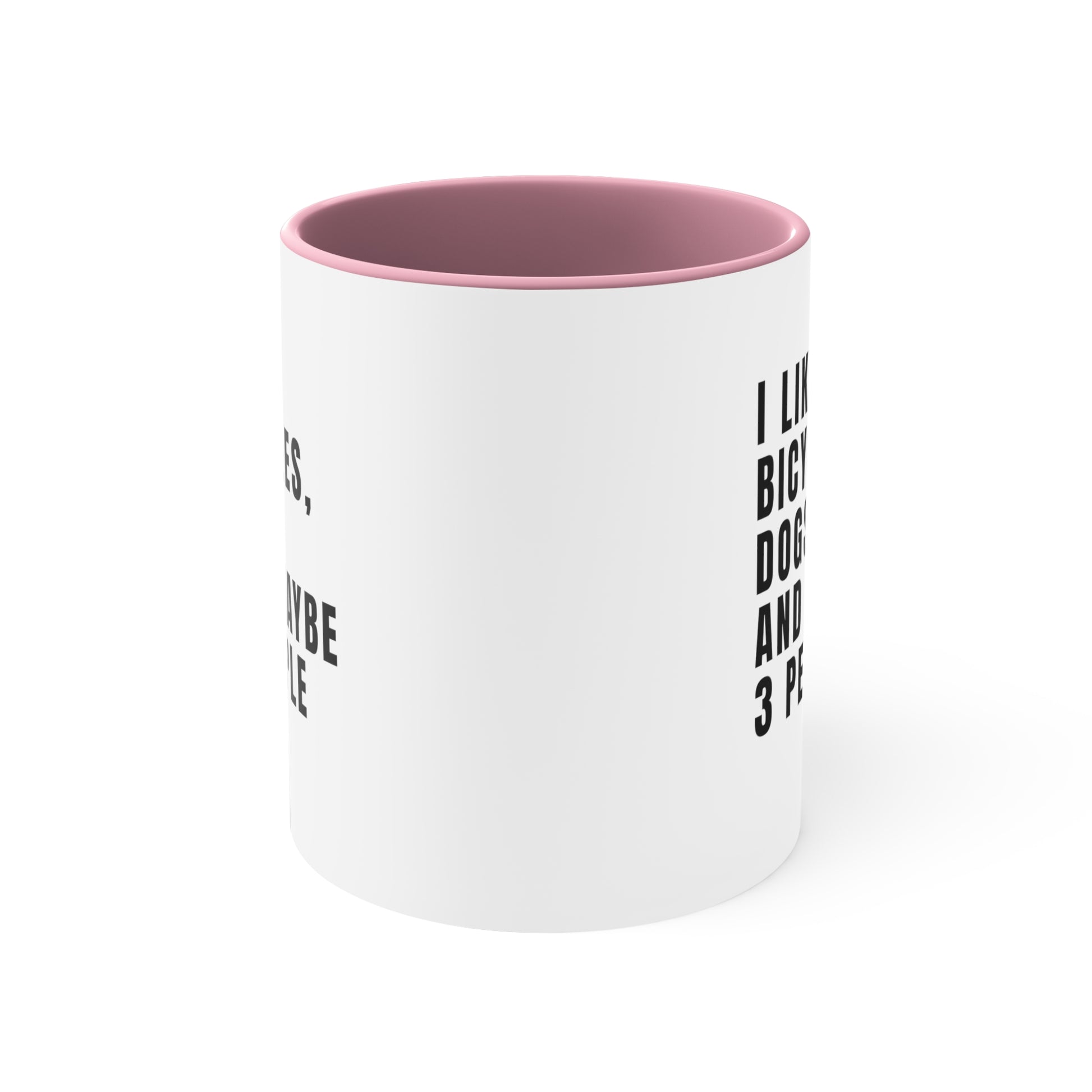 Date un capricho o alegra el día especial de alguien con nuestra taza de dos tonos: Me gustan las bicicletas, los perros y tal vez 3 personas . Con un cómodo asa en forma de C acentuada y un interior contrastante que añade carácter, esta taza de 11 oz ofrece un toque de color a tu rutina diaria. Es más que una simple taza: es una declaración de personalidad en tus manos.