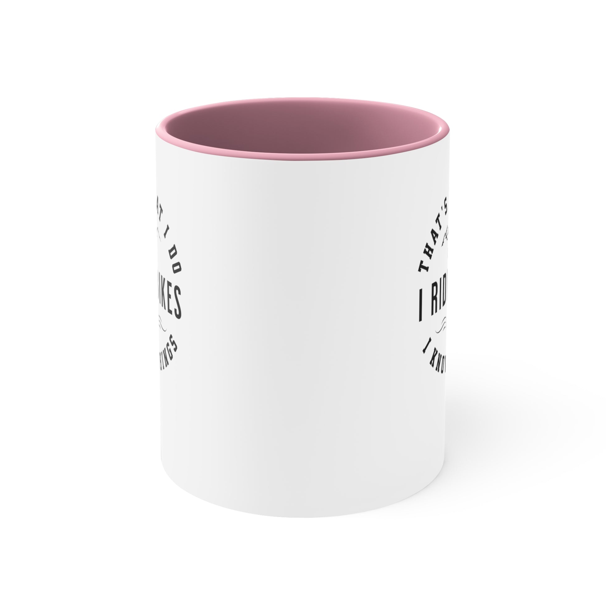 Date un capricho o alegra el día especial de alguien con nuestra taza de dos tonos, Eso es lo que hago, ando en bicicleta y sé cosas . Con un cómodo asa en forma de C acentuada y un interior contrastante que añade carácter, esta taza de 11 oz ofrece un toque de color a tu rutina diaria. Es más que una simple taza: es una declaración de personalidad en tus manos.