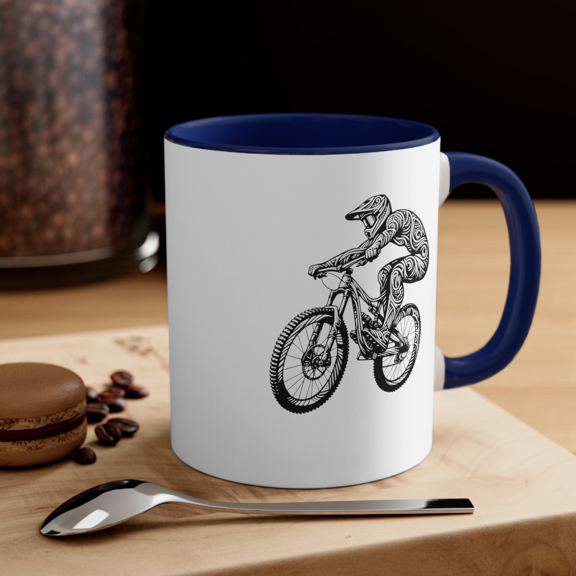 Date un capricho o alegra el día especial de alguien con nuestra taza Tribal Mountain Bike MTB de dos tonos. Con un cómodo asa en forma de C acentuada y un interior contrastante que añade carácter, esta taza de 11 oz ofrece un toque de color a tu rutina diaria. Es más que una simple taza: es una declaración de personalidad en tus manos.