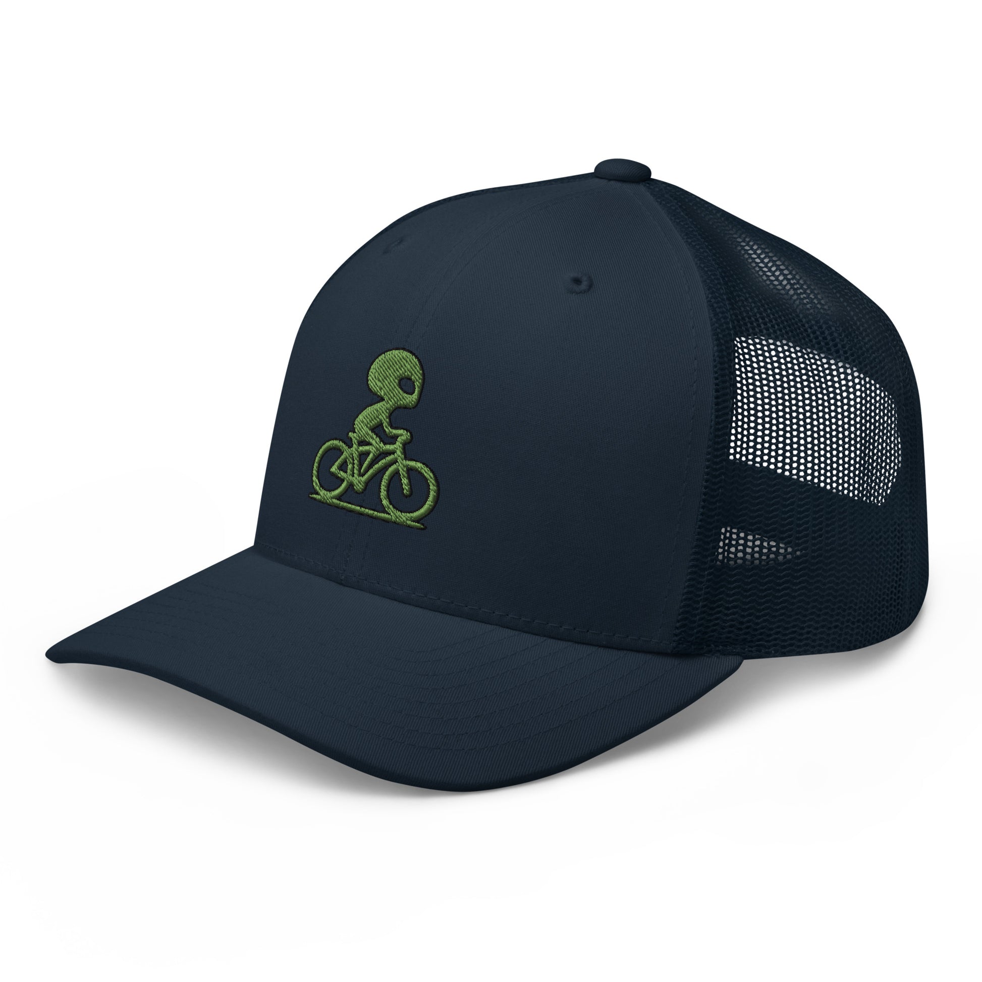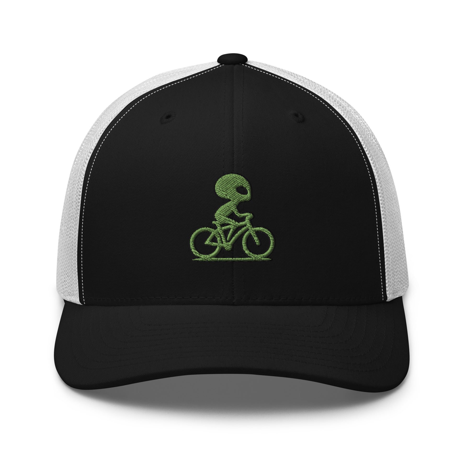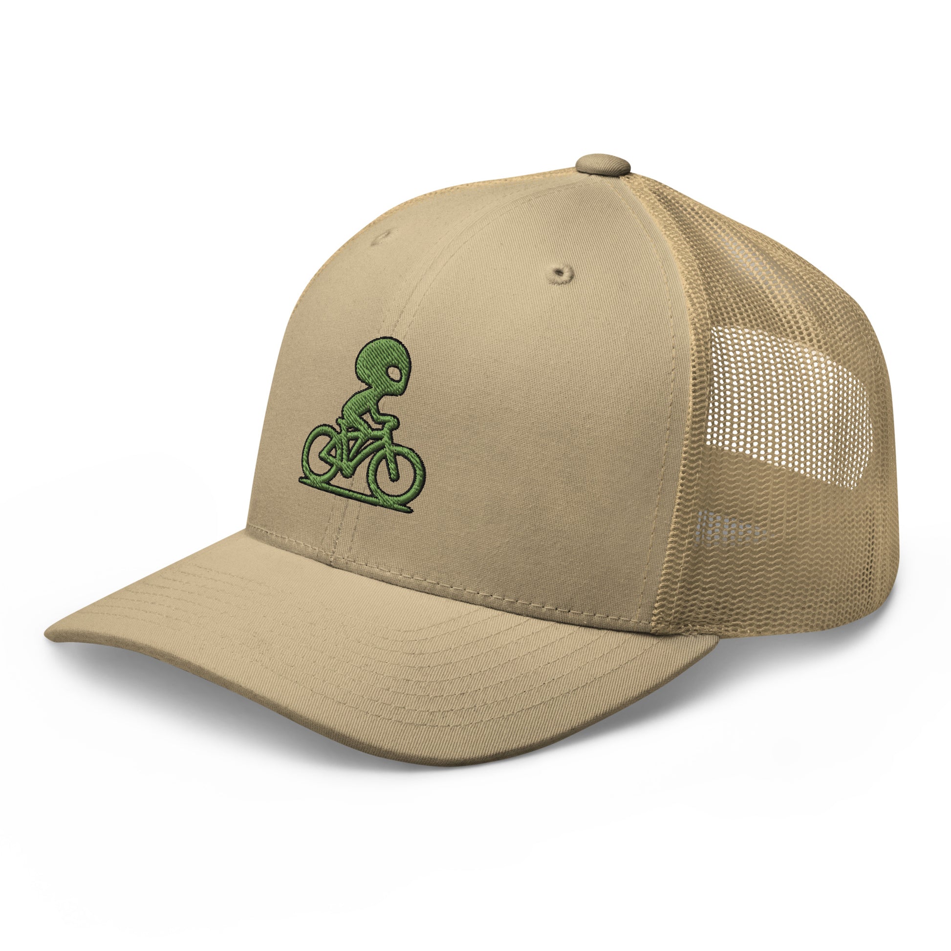 Elevate your sun-soaked adventures with our six-panel trucker hat, designed for ultimate comfort and timeless style. This cap combines classic aesthetics with modern features, making it a must-have for any sunny day. Perfect for cycling enthusiasts, it features a cool embroidered alien riding a bike.
