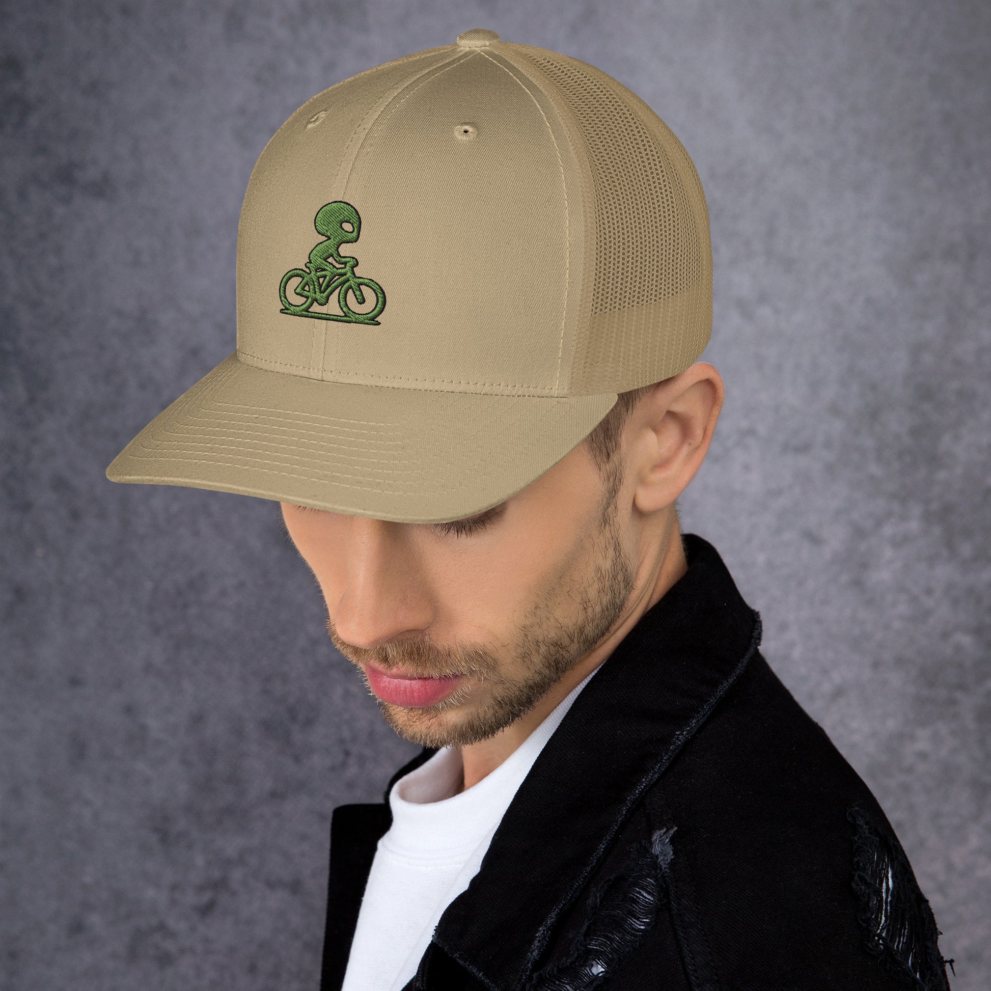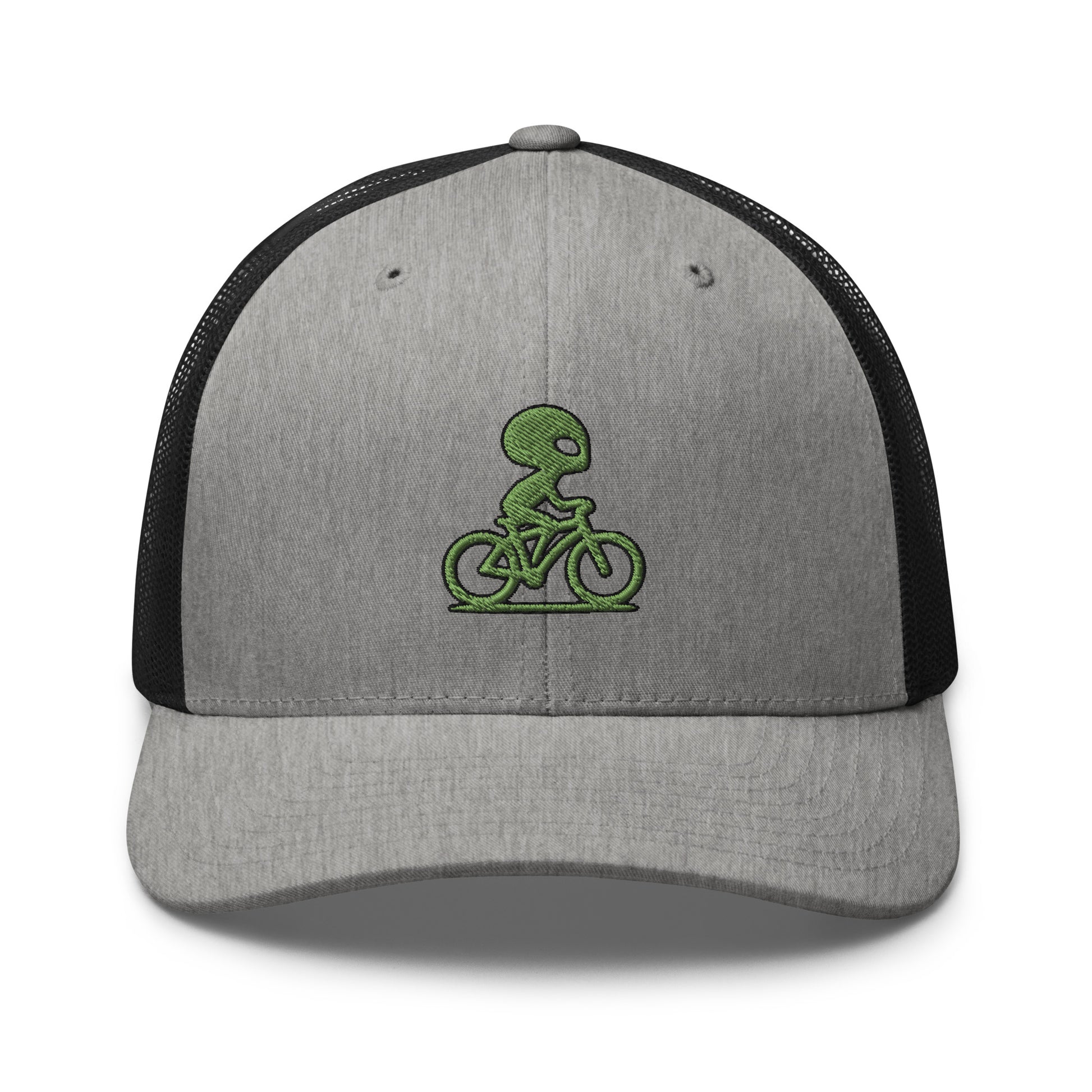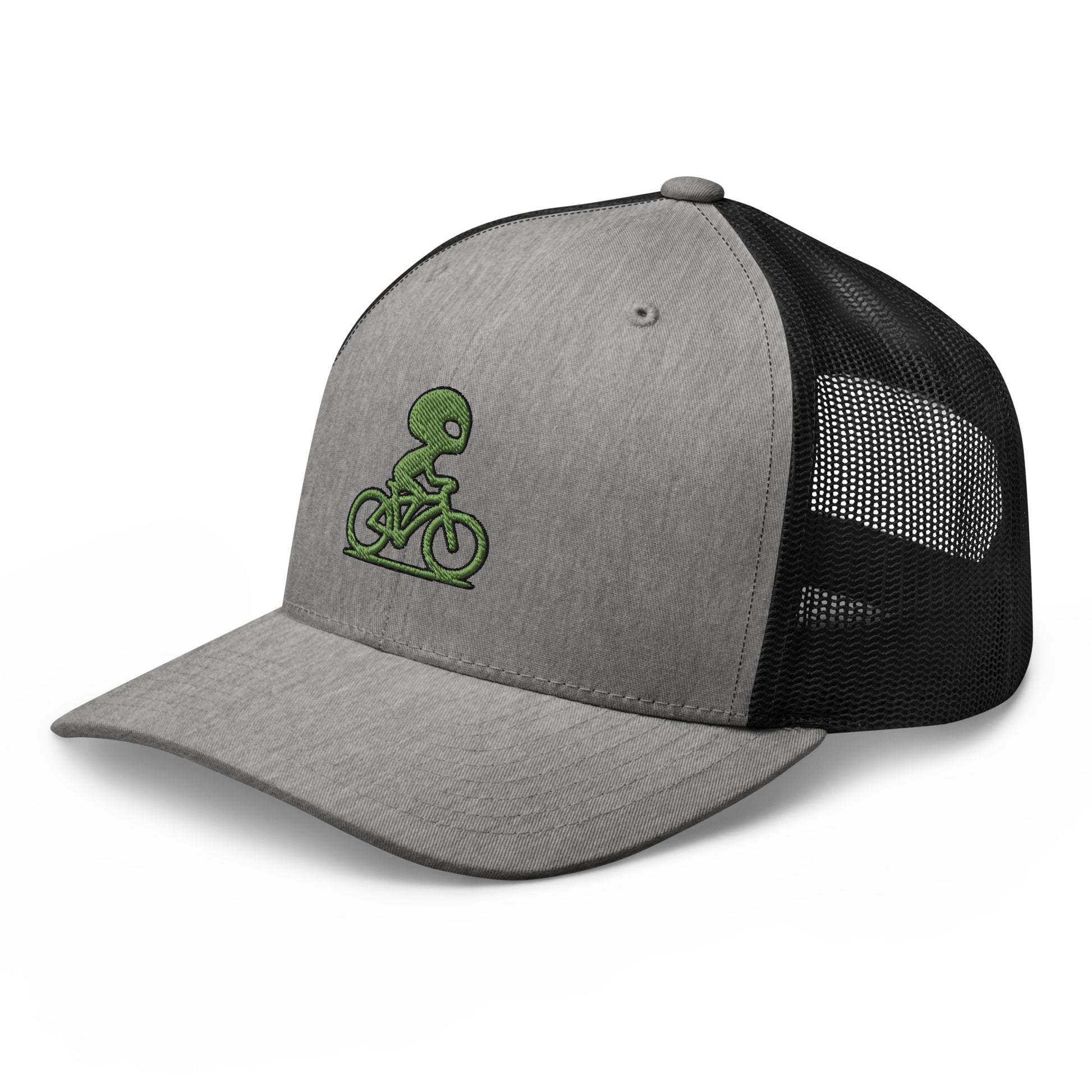 Elevate your sun-soaked adventures with our six-panel trucker hat, designed for ultimate comfort and timeless style. This cap combines classic aesthetics with modern features, making it a must-have for any sunny day. Perfect for cycling enthusiasts, it features a cool embroidered alien riding a bike.