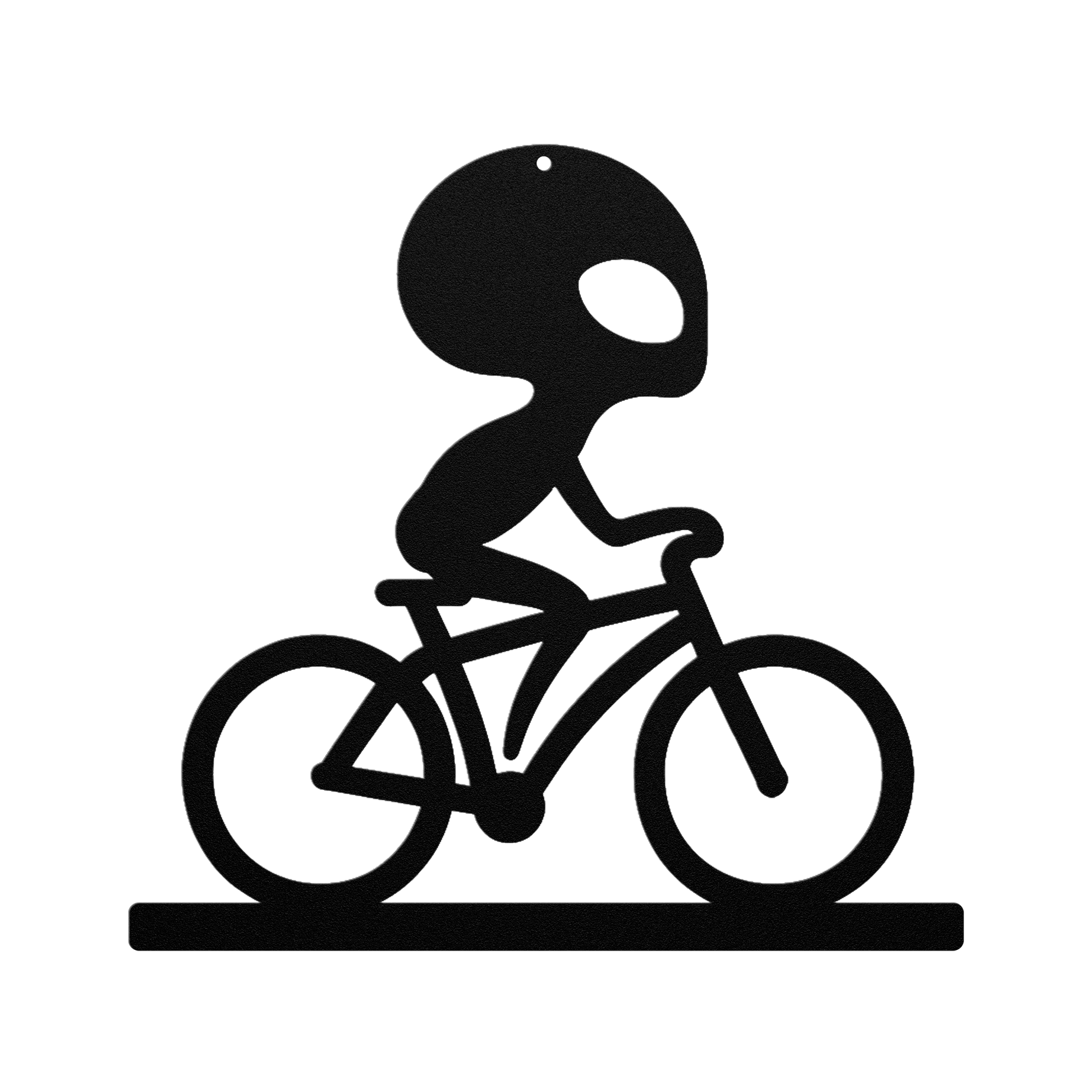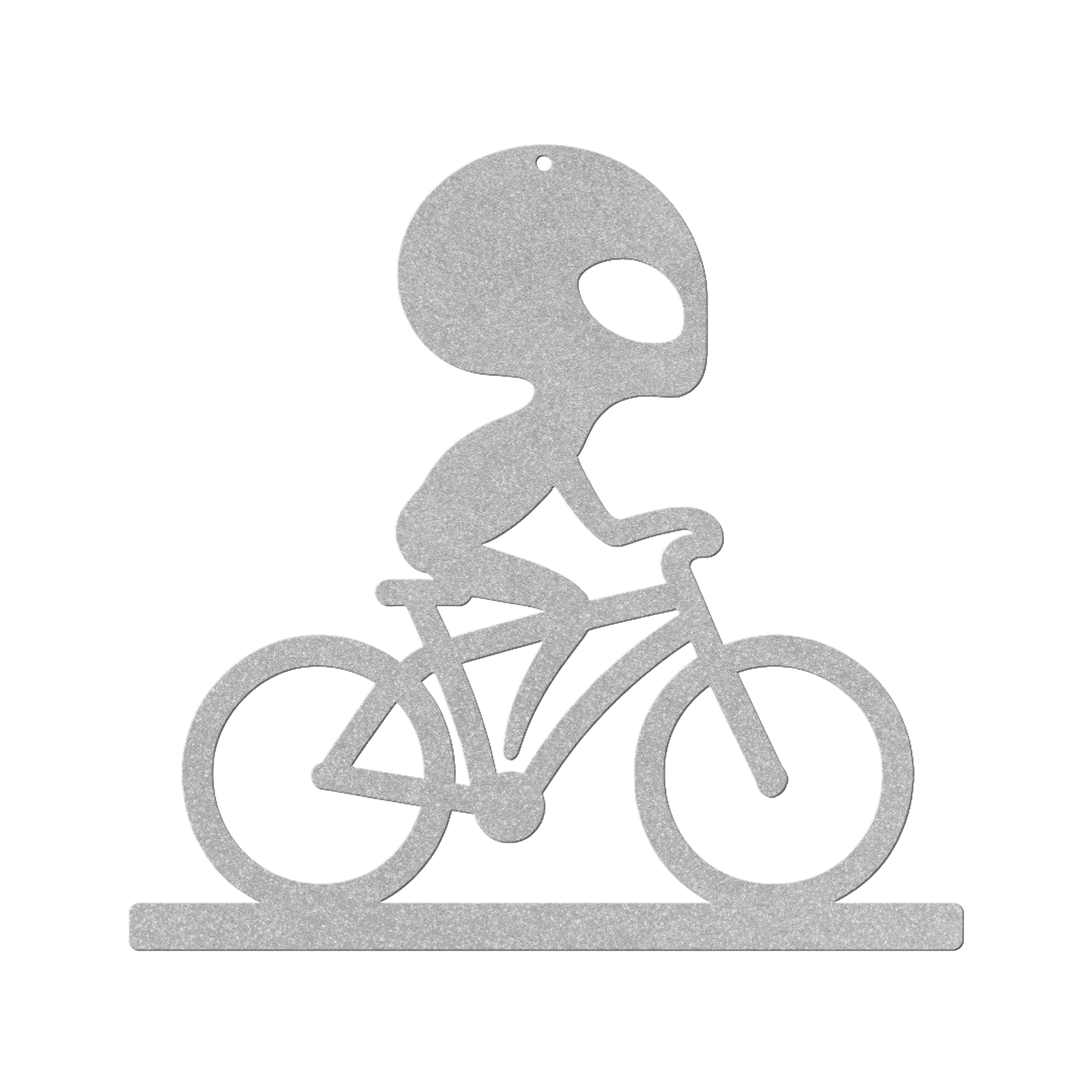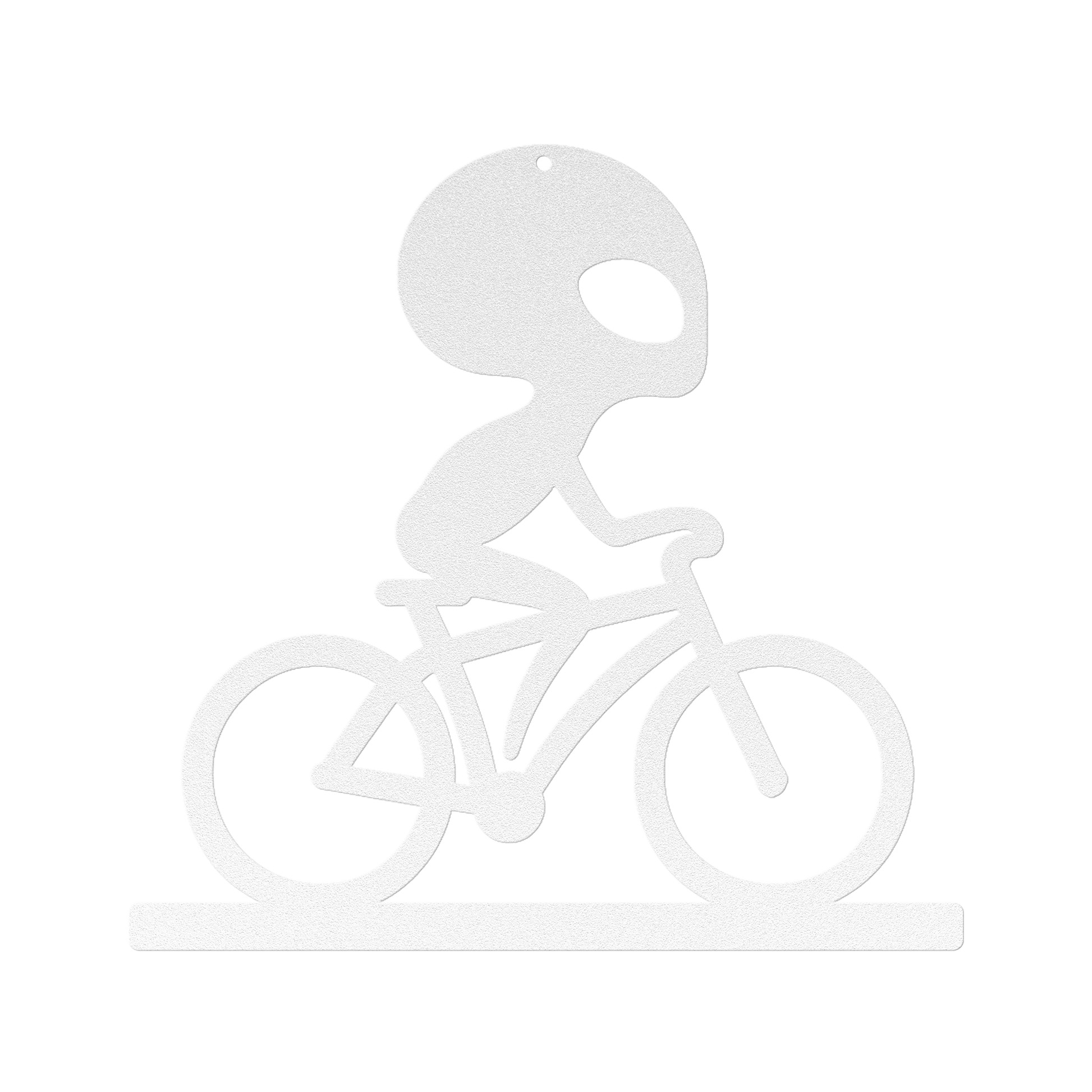 Elevate your home decor with Alien Cyclist Die-Cut Wall Metal Art. Made with 18 gauge steel and powder coated in your choice of 5 colors, this sign is built to withstand the elements for years of enjoyment. Add a touch of fun to your home, office, or favorite hangout spot. It's a great gift idea for any cycling enthusiast!