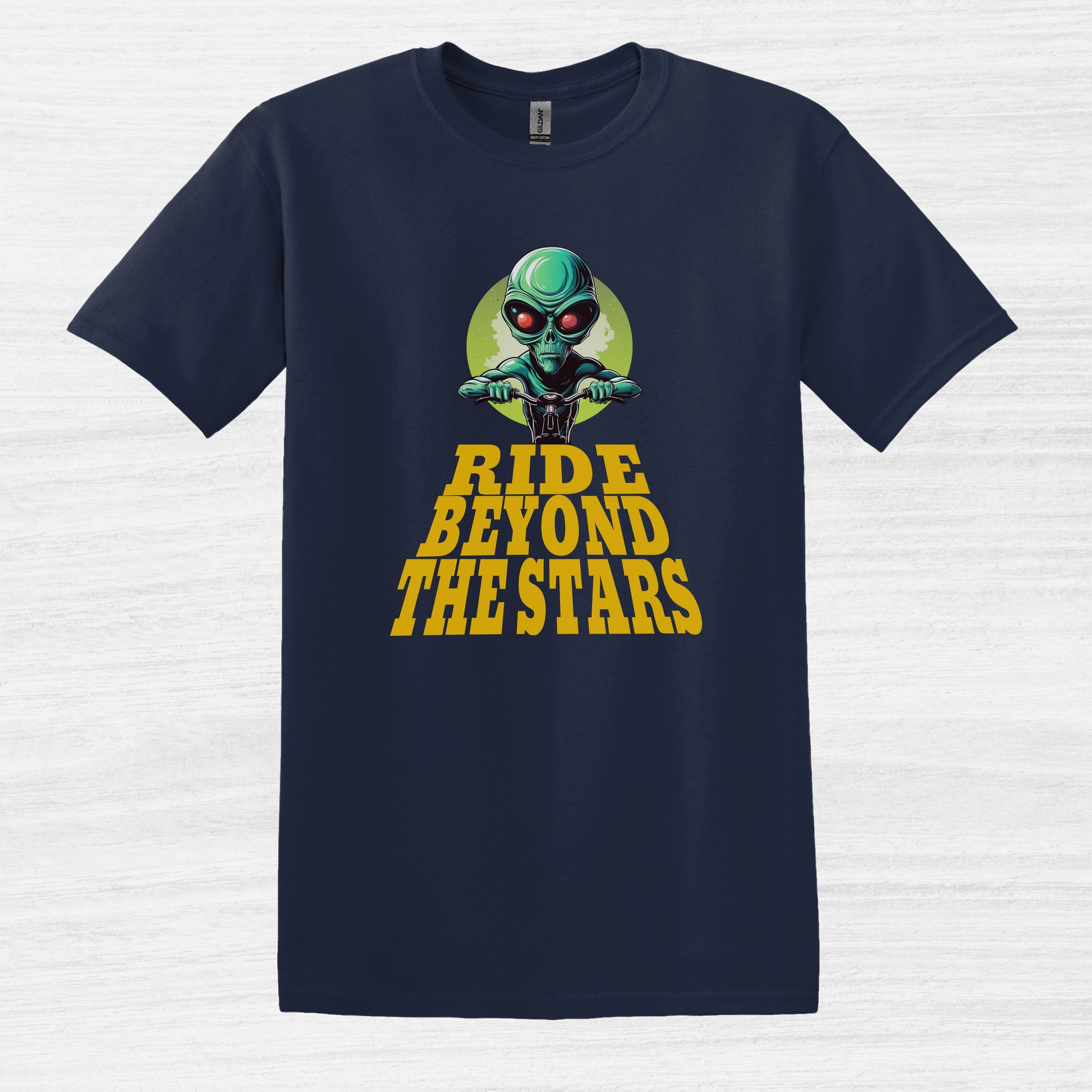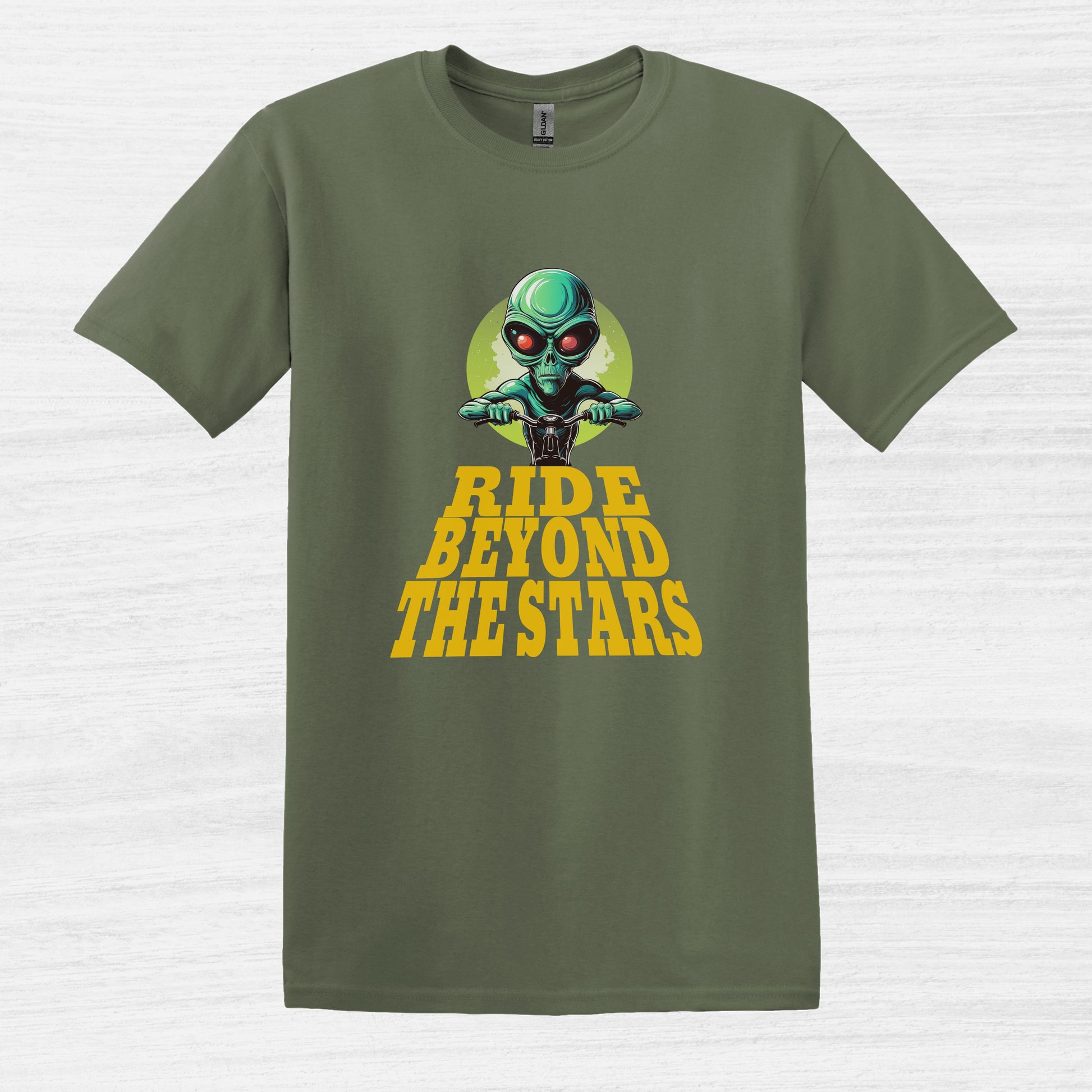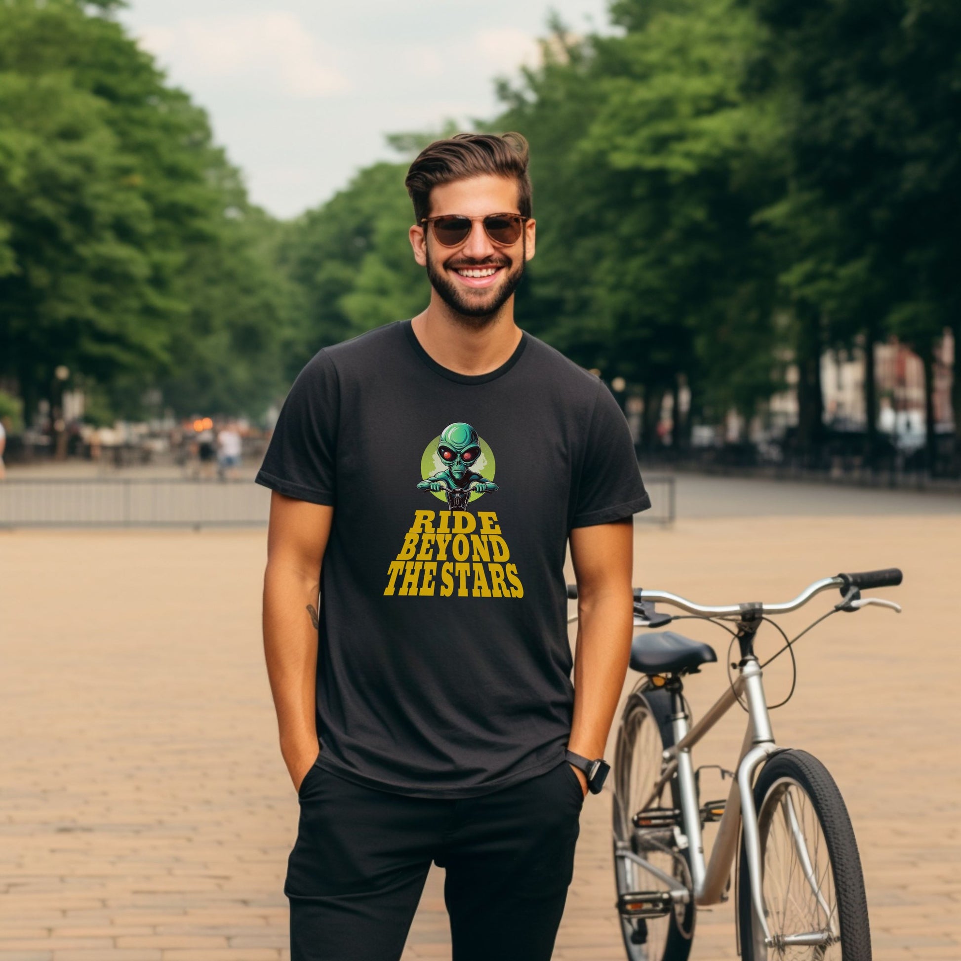 Hit the road with style in this cosmic adventure tee! Perfect for Mountain bike lovers and sci-fi fans alike, our "Ride Beyond The Stars" T-shirt features an eye-catching graphic of an alien speeding on his space bike. Made for those who dream of galaxies far away while cruising down the highway, this shirt is a unique blend of extraterrestrial and terrestrial cool. Whether you're looking for a Father's Day surprise, a special birthday present or just want to make your friend smile on a regular day, this shirt has you covered. So, grab one for yourself or gift it to the biker in your life who loves dad jokes, mom hugs, and friendship that's as vast as the universe!