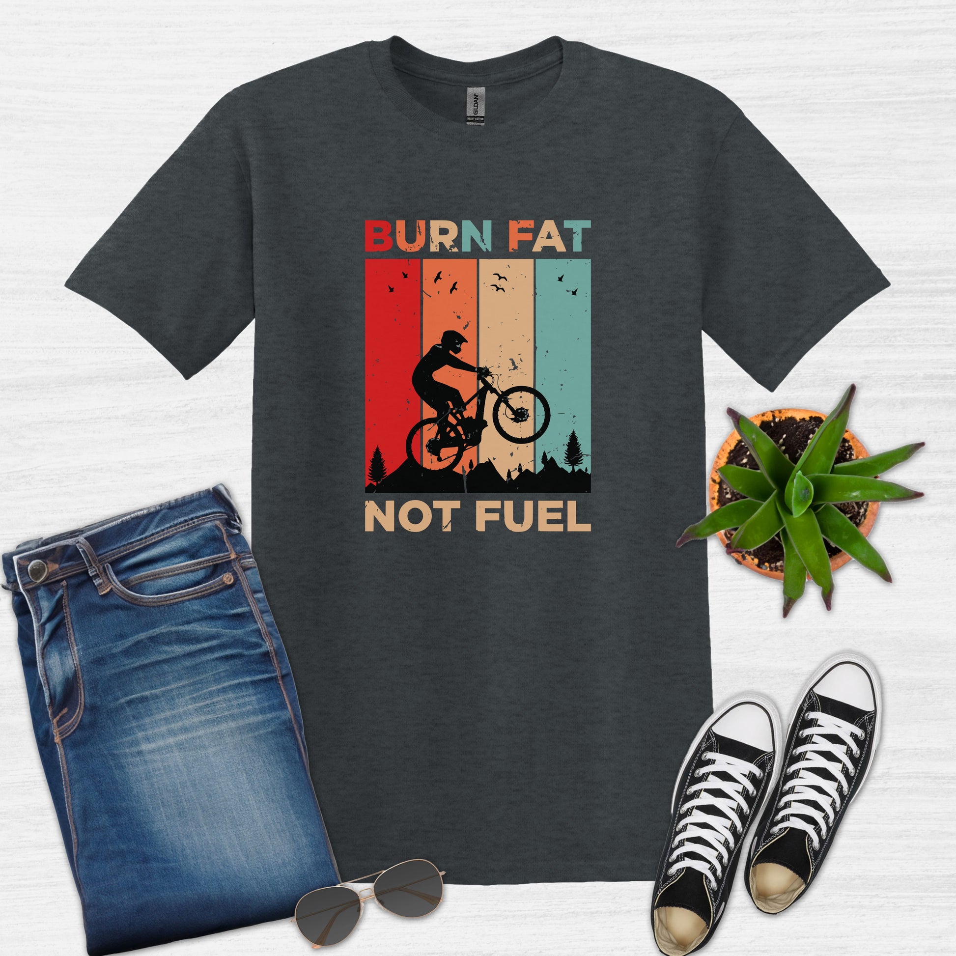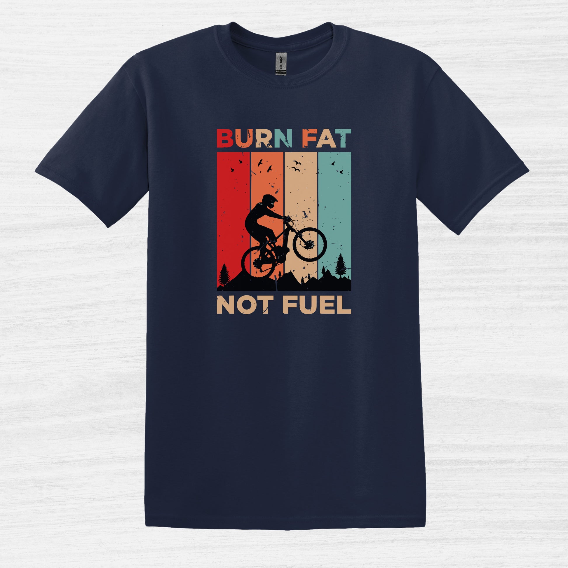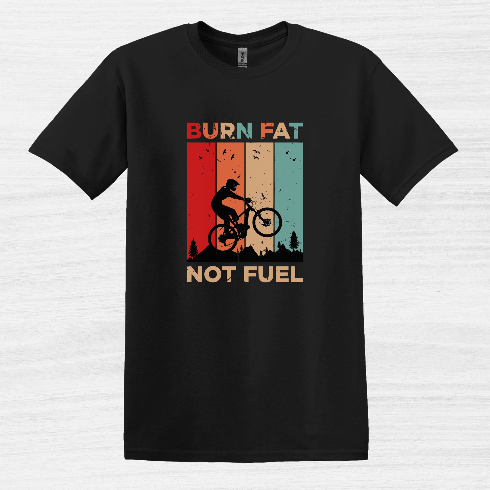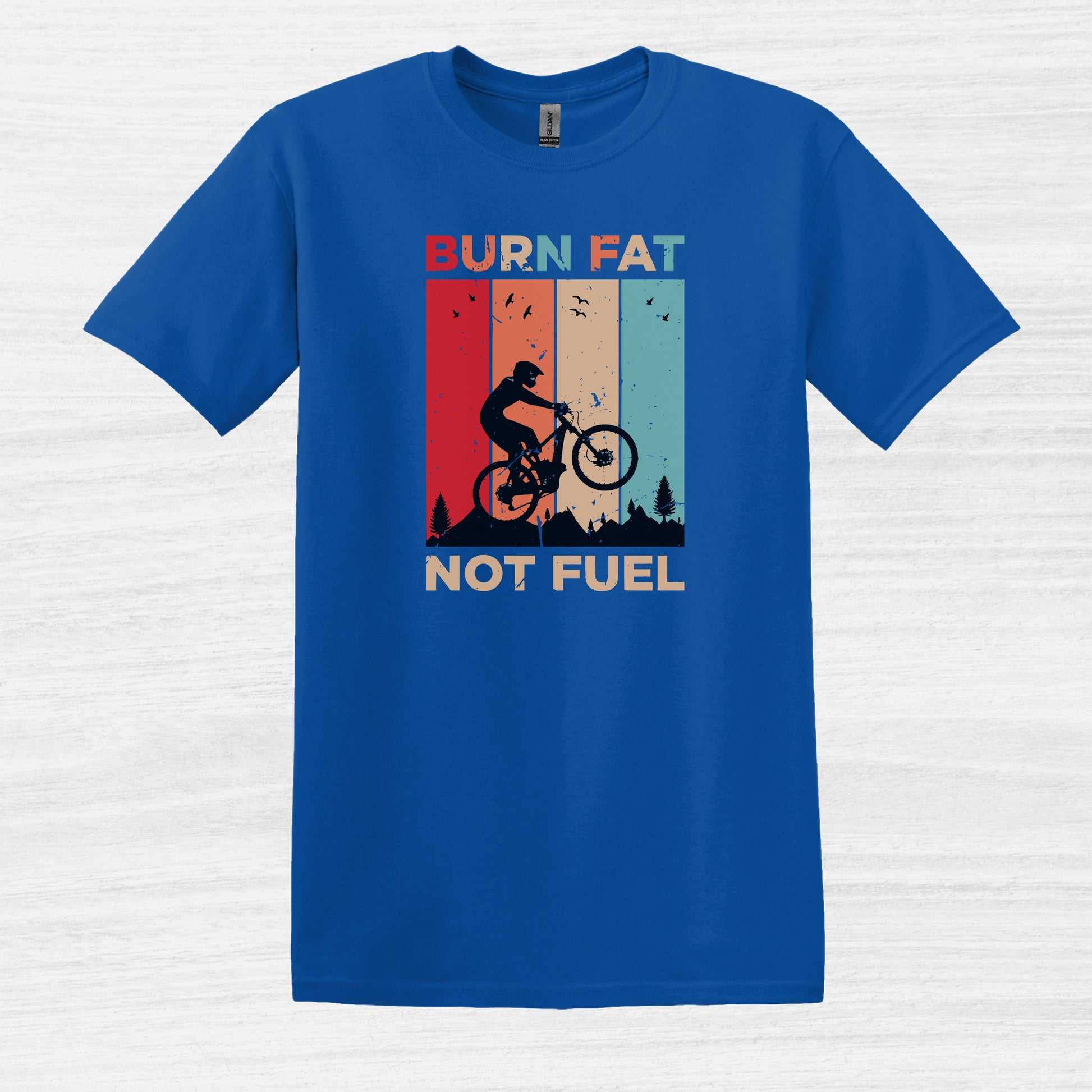 Ride in style with this vintage-inspired cycling t-shirt featuring the powerful message "Burn Fat Not Fuel Mountain Bike MTB T-Shirt." This unique tee is perfect for those who love biking and care about the environment. Made with breathable material, it's ideal for outdoor adventures or casual wear. A great gift for the eco-conscious cyclist in your life, it's suitable for various occasions including birthdays, Father's Day, or as a Christmas present. Express your passion for cycling and sustainability with this eye-catching design.