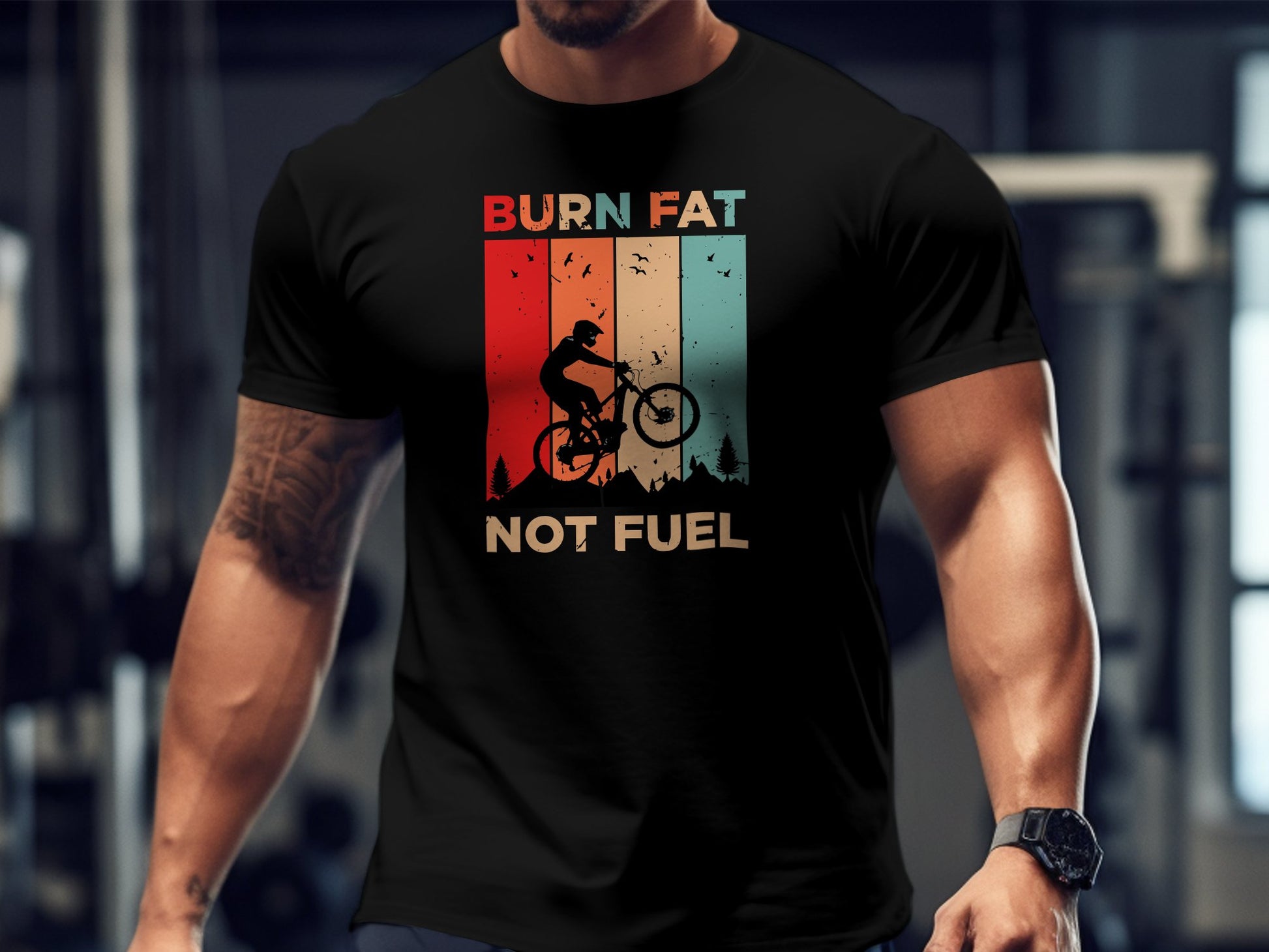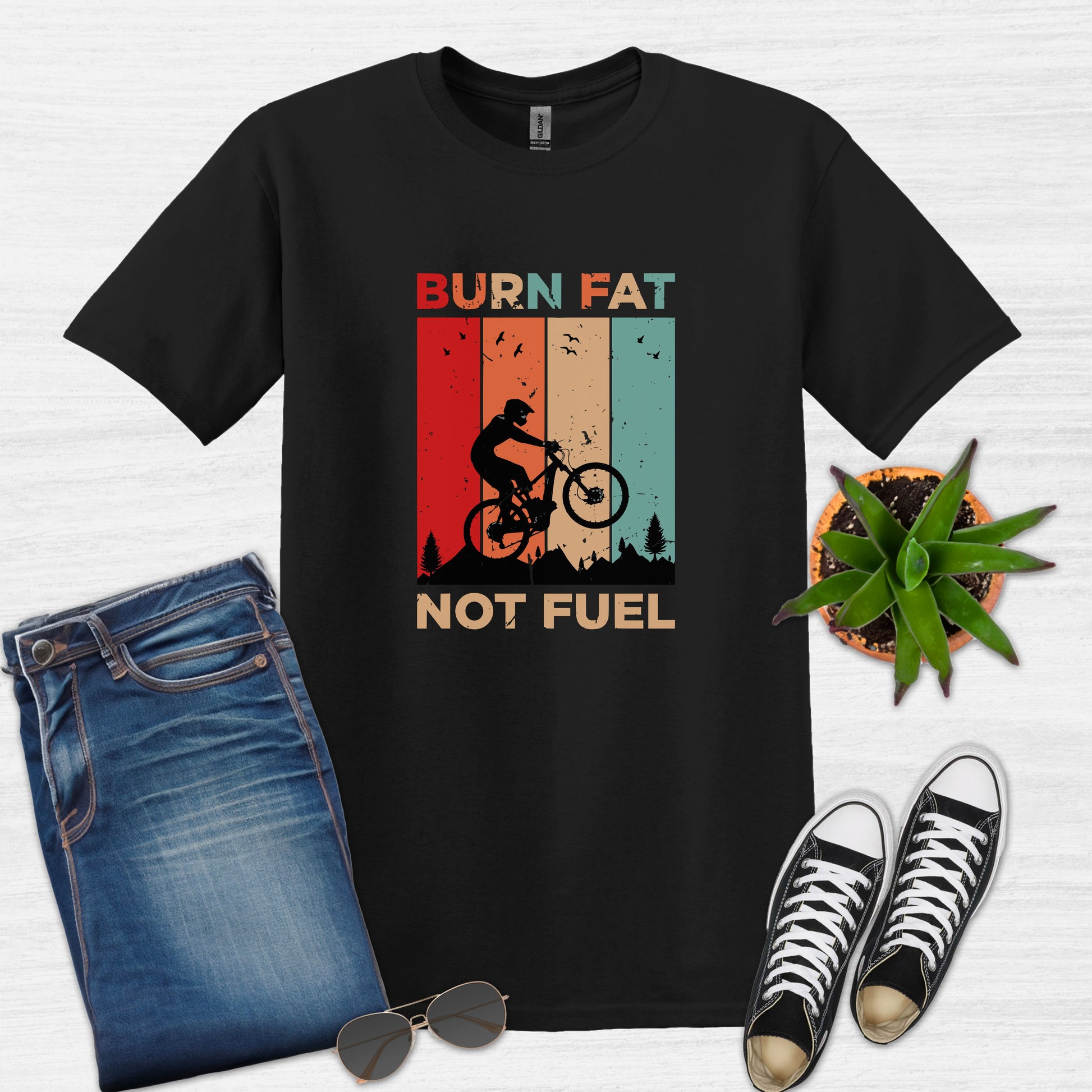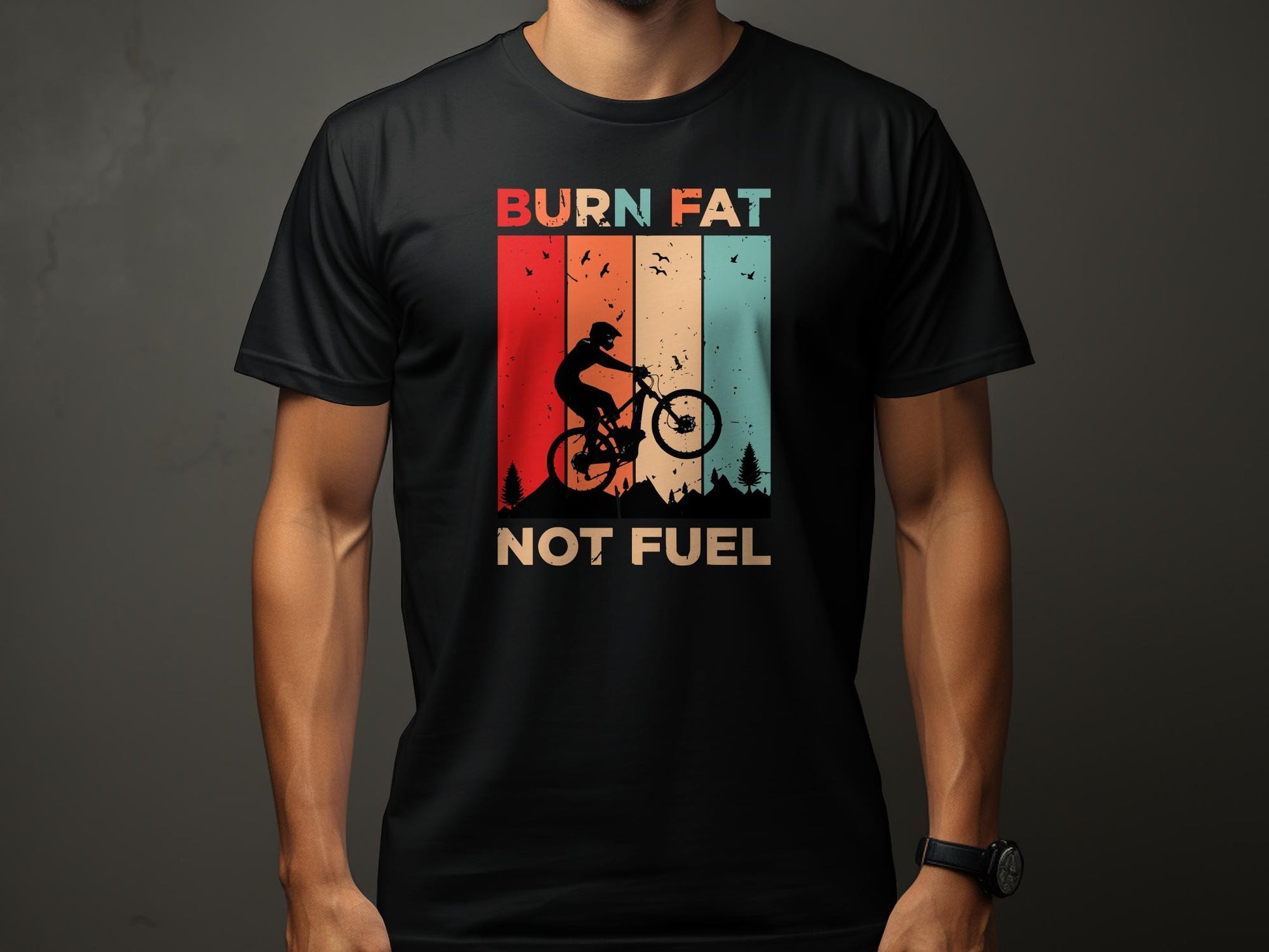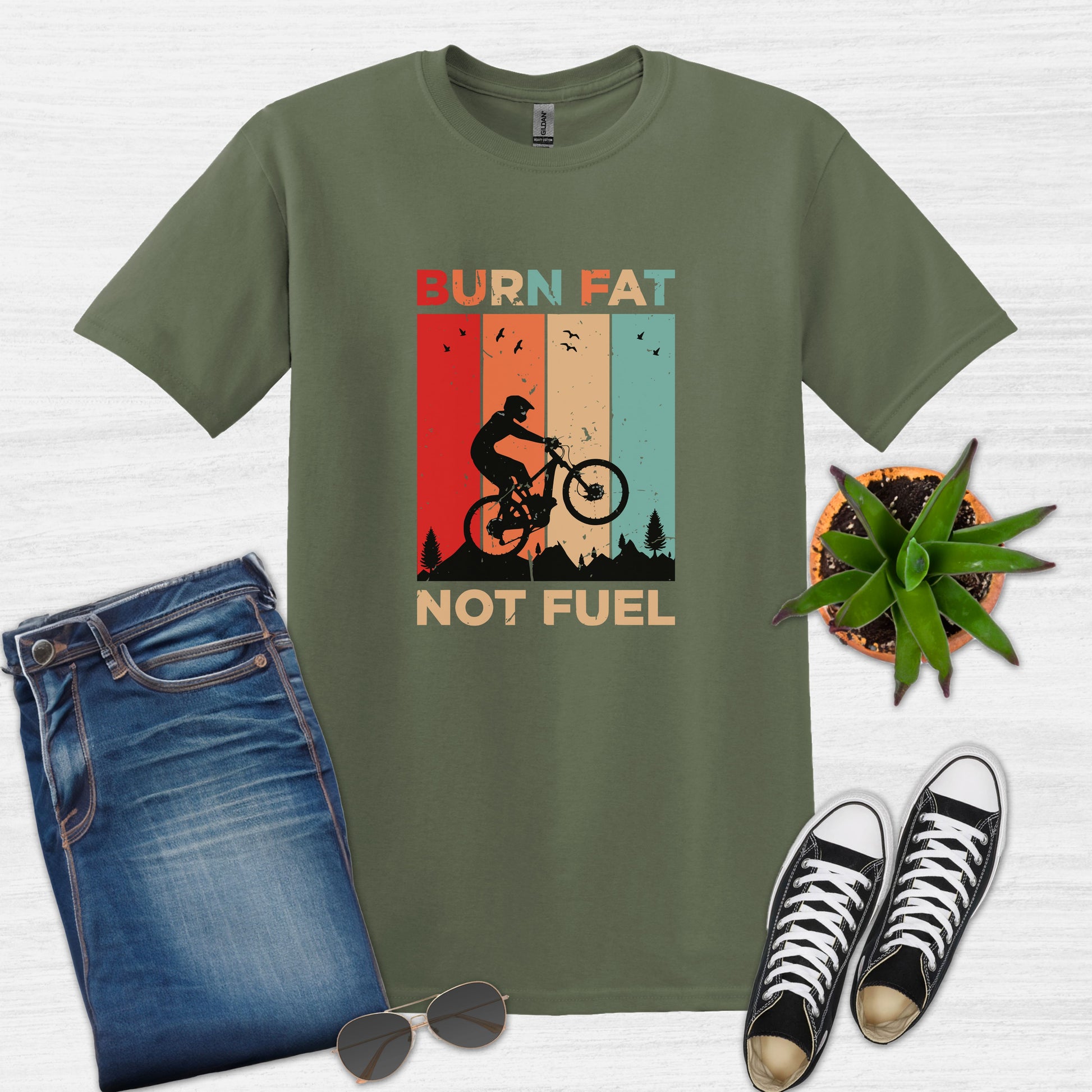 Ride in style with this vintage-inspired cycling t-shirt featuring the powerful message "Burn Fat Not Fuel Mountain Bike MTB T-Shirt." This unique tee is perfect for those who love biking and care about the environment. Made with breathable material, it's ideal for outdoor adventures or casual wear. A great gift for the eco-conscious cyclist in your life, it's suitable for various occasions including birthdays, Father's Day, or as a Christmas present. Express your passion for cycling and sustainability with this eye-catching design.