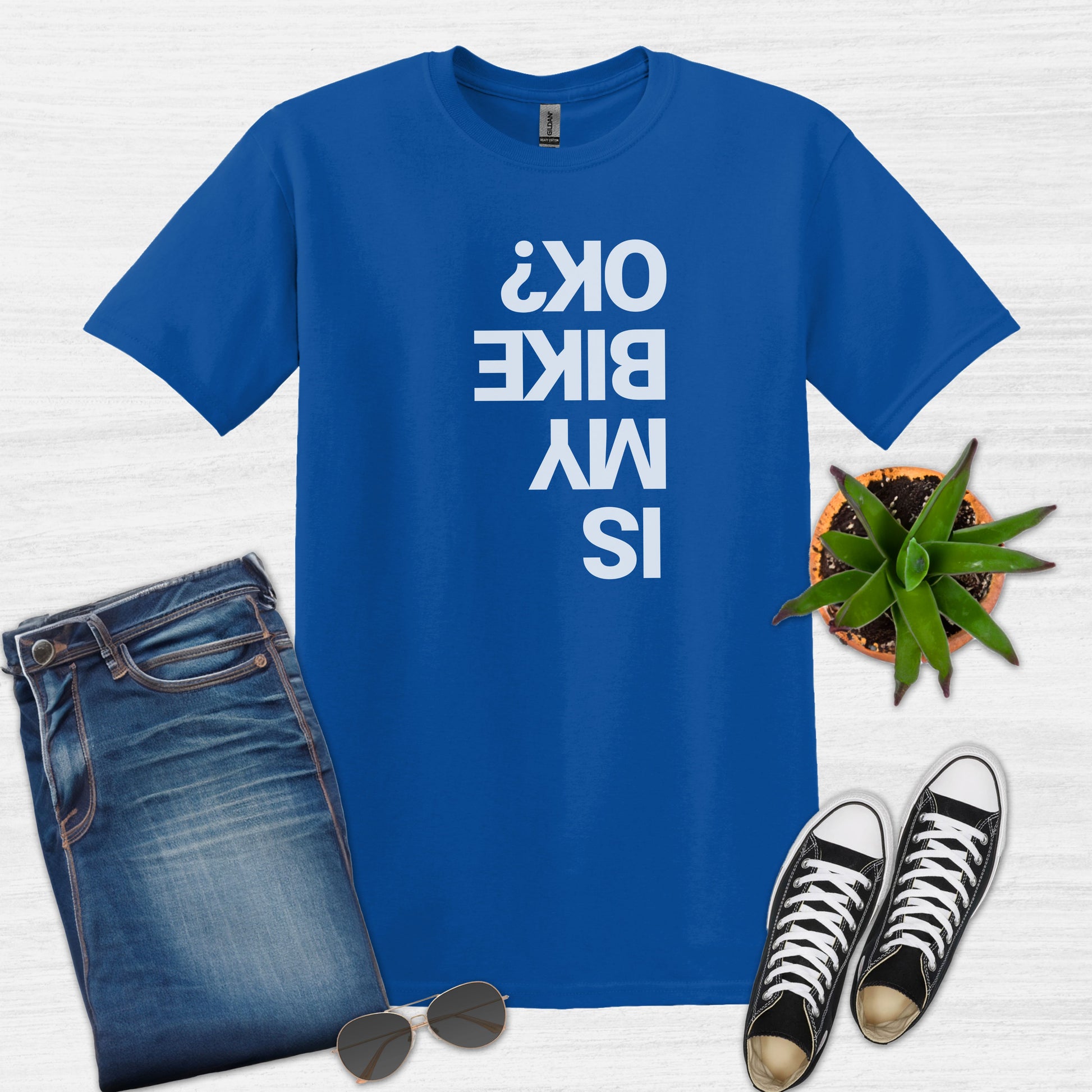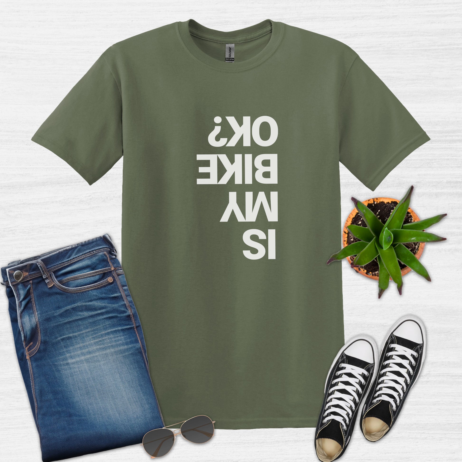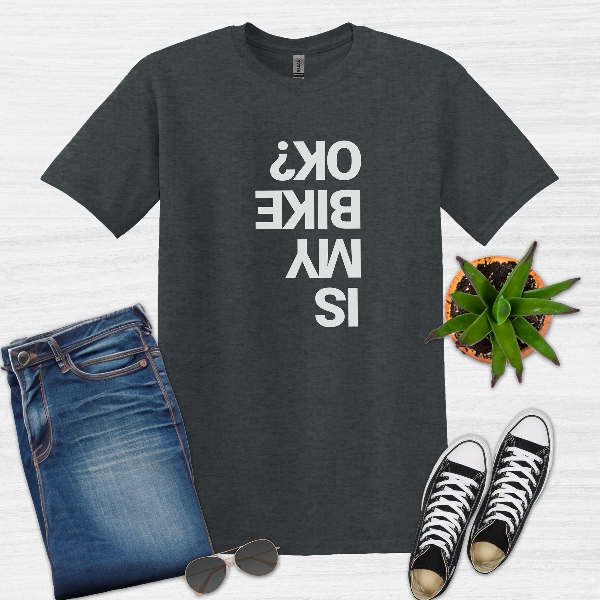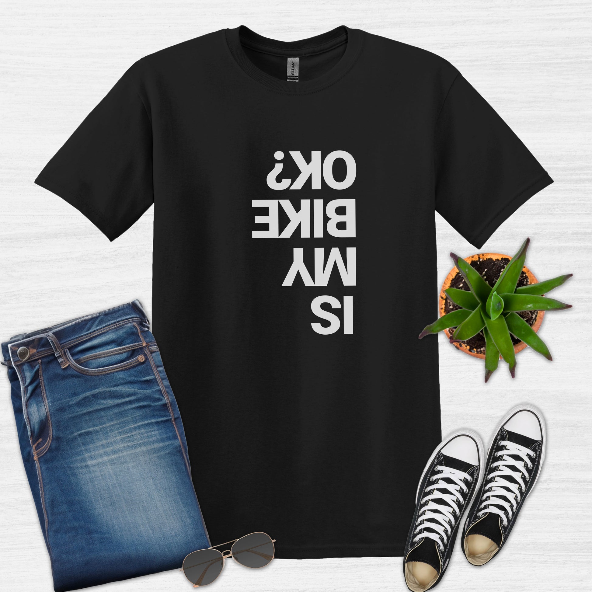 Stand out in the crowd with this trendy and fun Bicycle T-shirt featuring a bold, upside-down text design that reads "Is my Bike OK?." This stylish tee is perfect for those who have a unique sense of fashion and aren't afraid to show it. Made with high-quality cotton, this shirt offers both comfort and durability. Whether you're going out with friends or just chilling at home, this versatile top is the perfect go-to choice for any casual occasion. Celebrate birthdays, Christmas, Father's Day, Mother's Day, or any milestone with this unique cyclist tee. Grab one for yourself or as a gift, and let the good times roll!