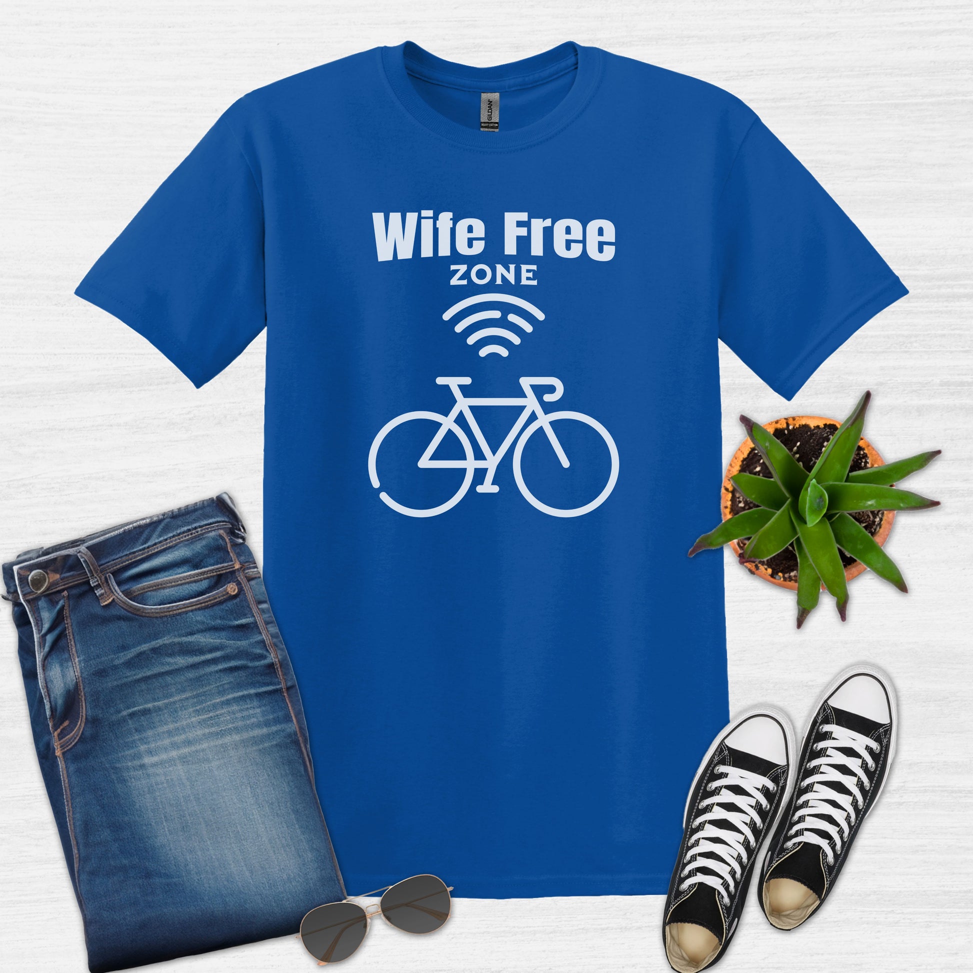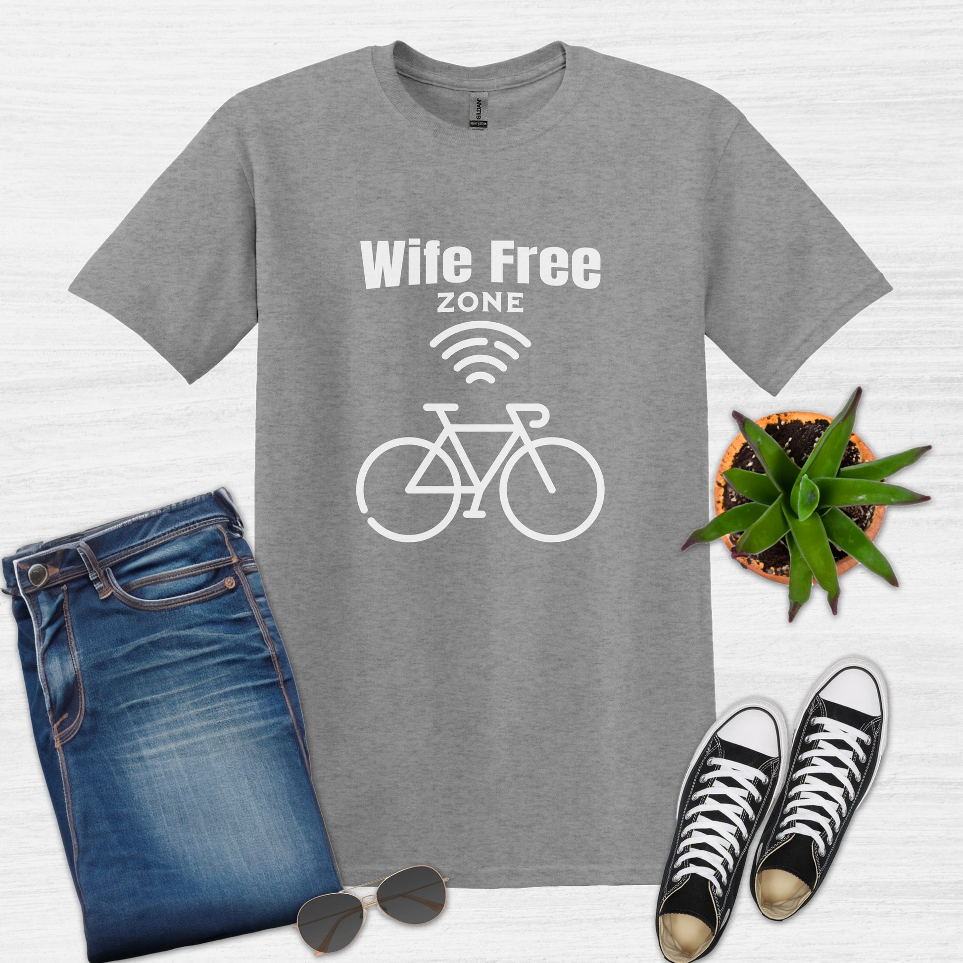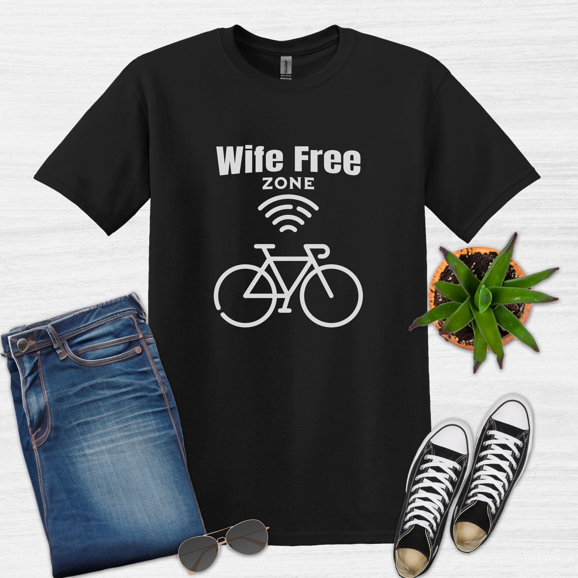 Get ready to hit the road with our humorous Wife Free Zone Bike t-shirt, perfect for the cycling enthusiast in your life! Crafted from soft, durable material, this shirt is a comfortable choice for any casual outing or bike ride. Featuring a bold graphic of a bicycle with a playful "Wife Free Zone" text and Wi-Fi symbol, it's sure to bring a smile and a laugh to friends and fellow cyclists. Whether you're looking for a fun gift for your husband, dad, or any bike-loving friend, this tee is a great way to show your appreciation for their hobby. Not just a gift, but a statement piece that's both stylish and witty!