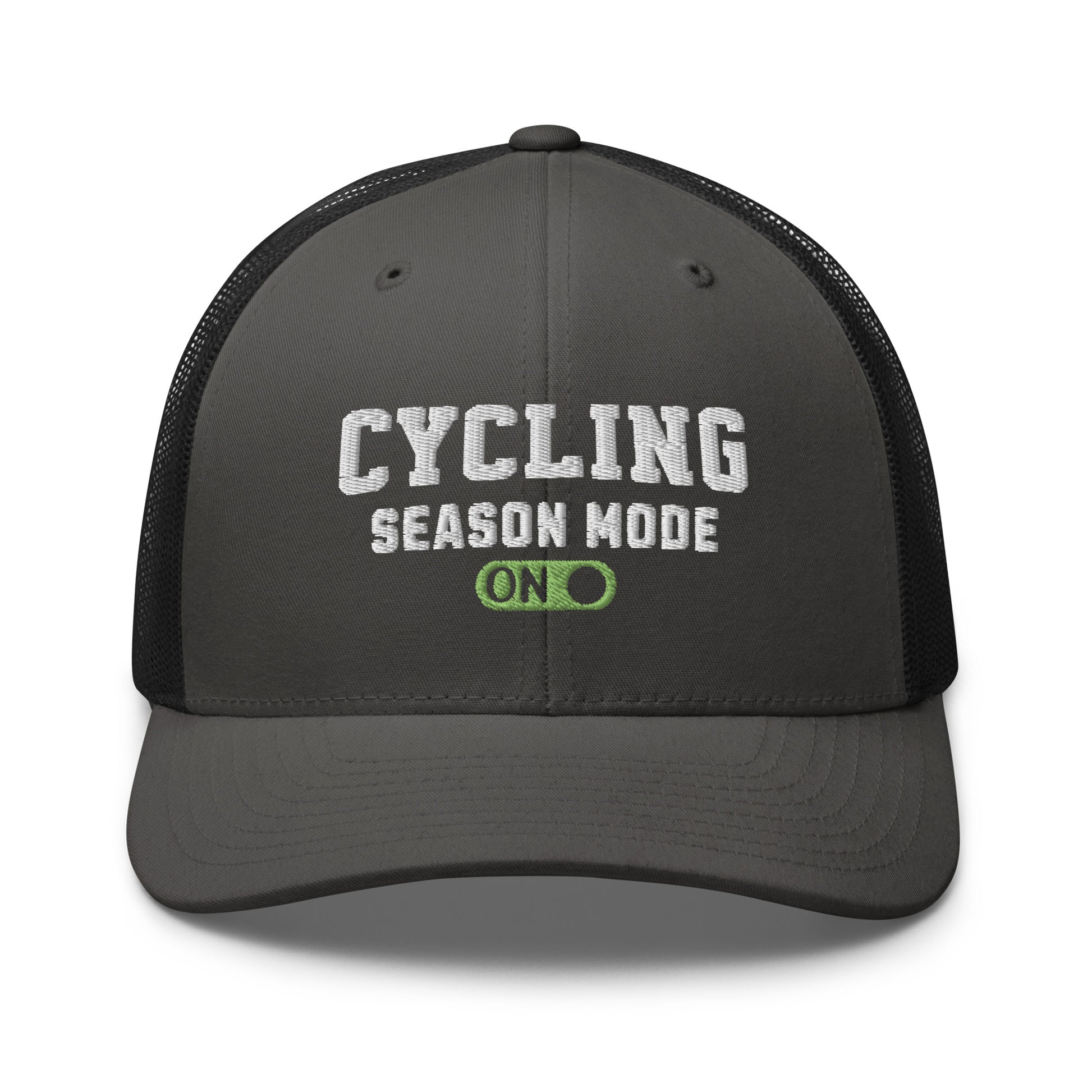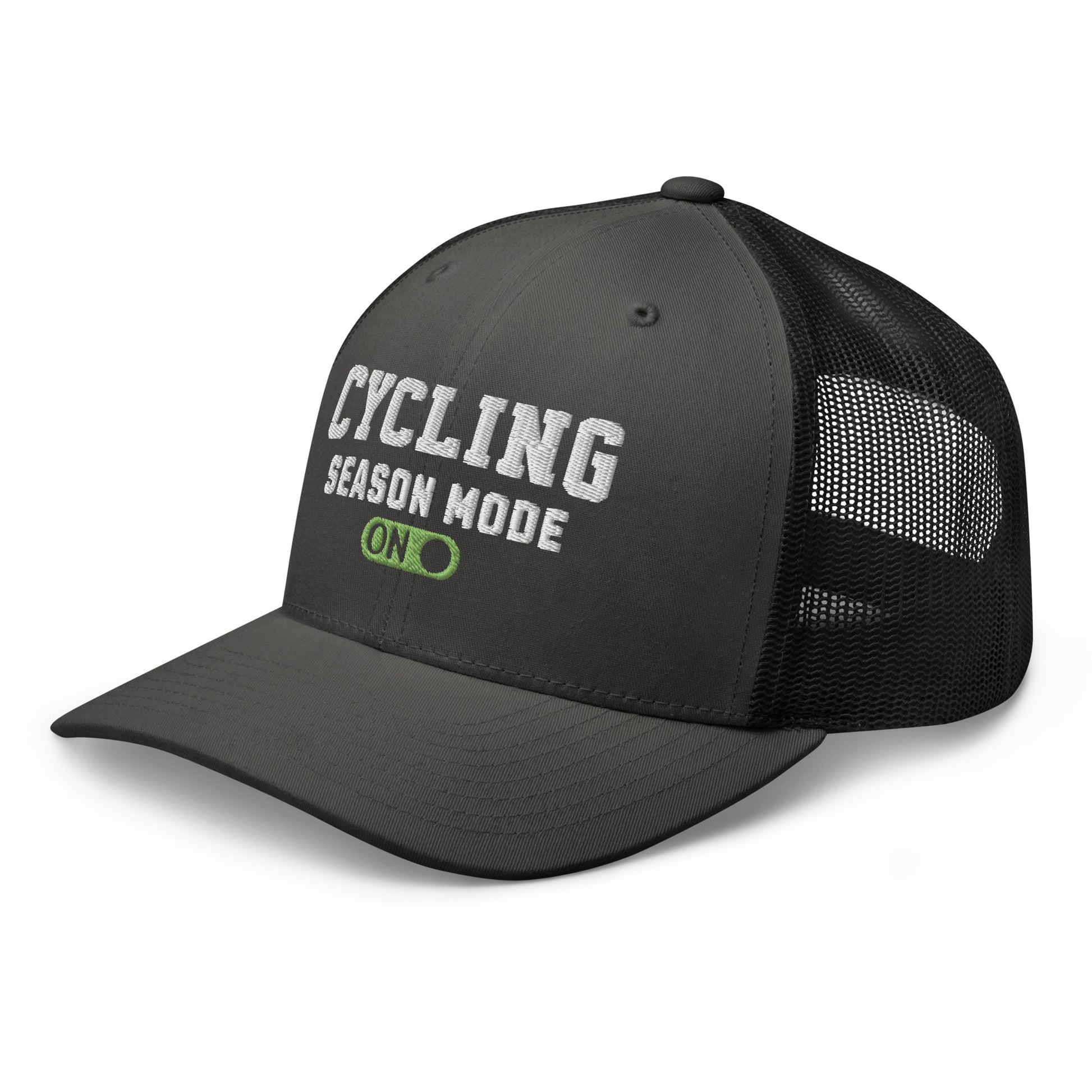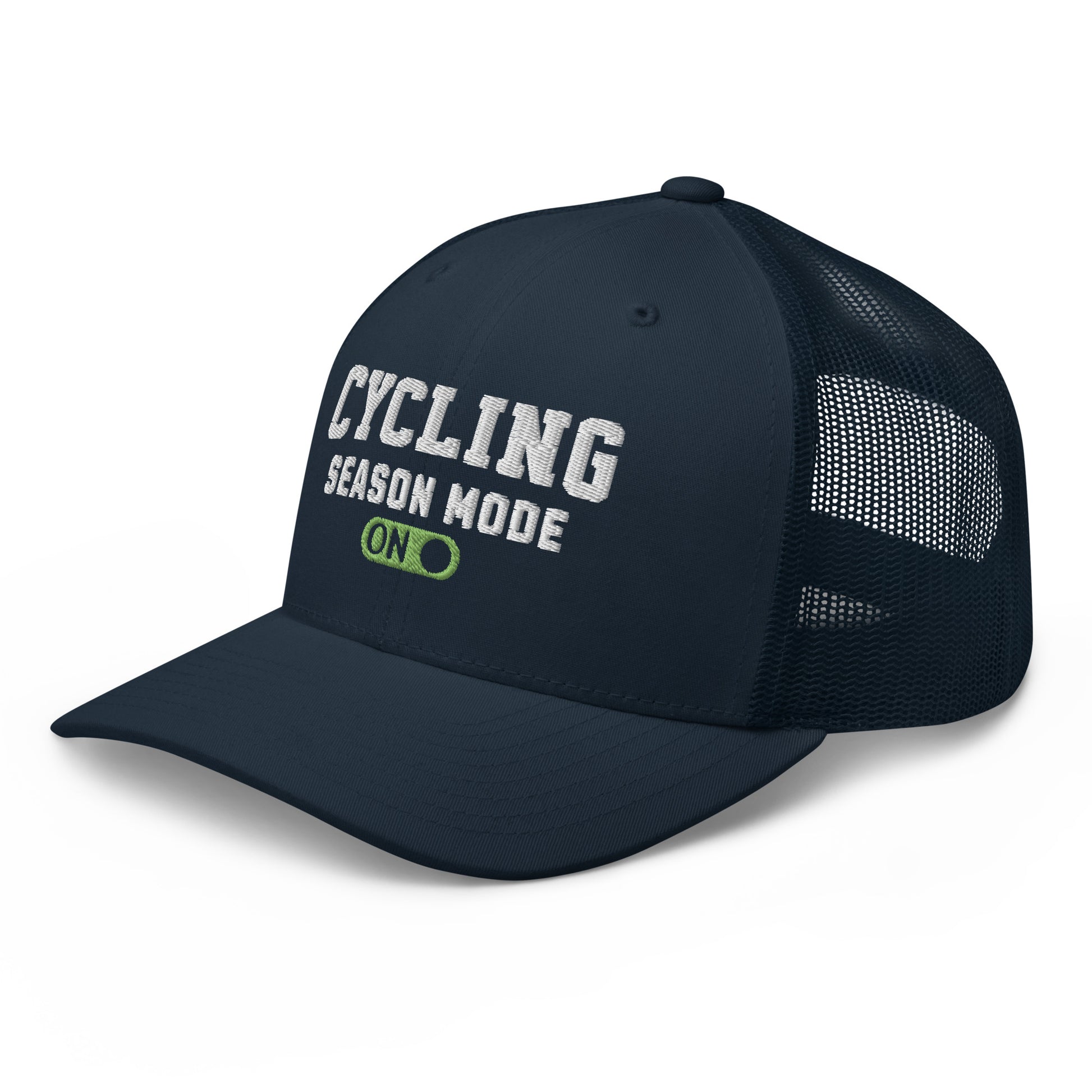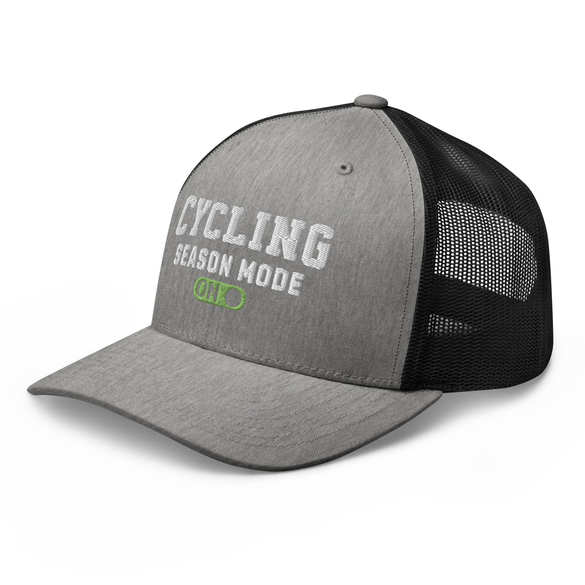 Elevate your sun-soaked adventures with our six-panel trucker hat, designed for ultimate comfort and timeless style. This cap combines classic aesthetics with modern features, making it a must-have for any sunny day. Perfect for cycling enthusiasts, it features an embroidered text "Cycling Season Mode ON" that celebrate your passion.