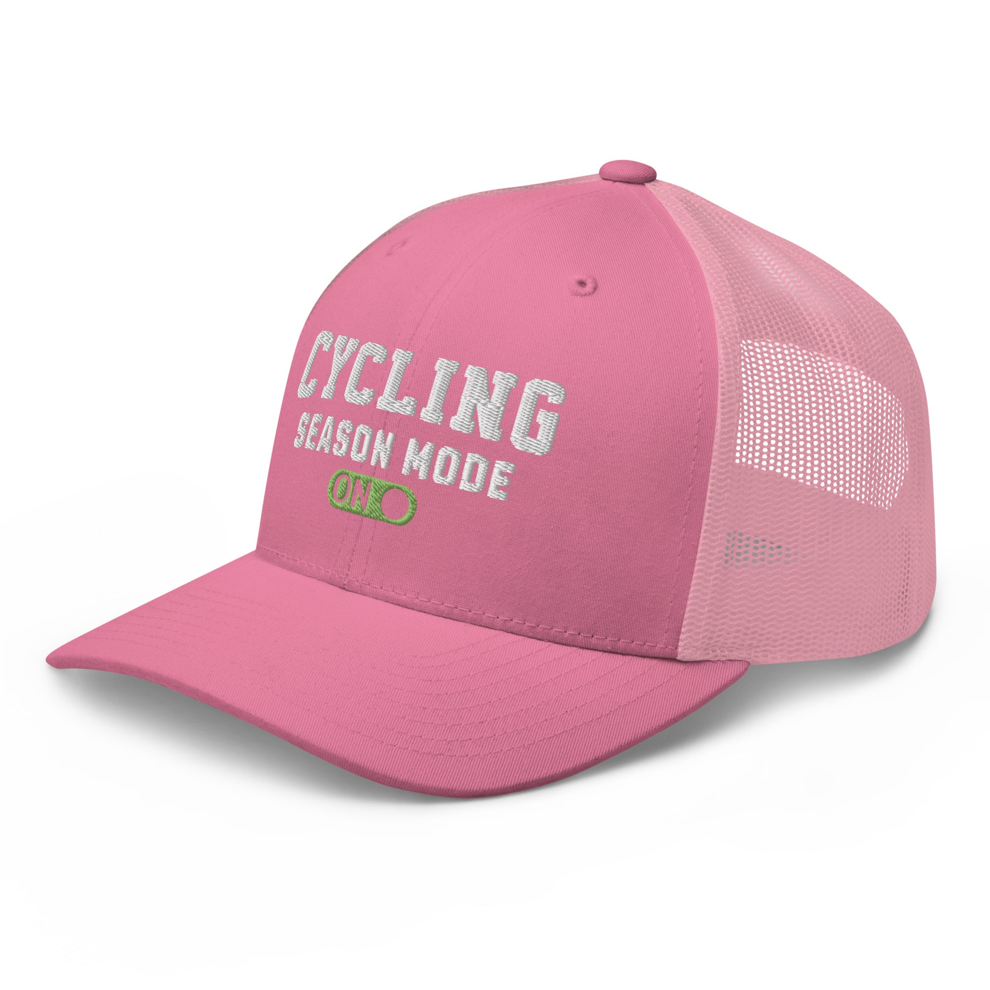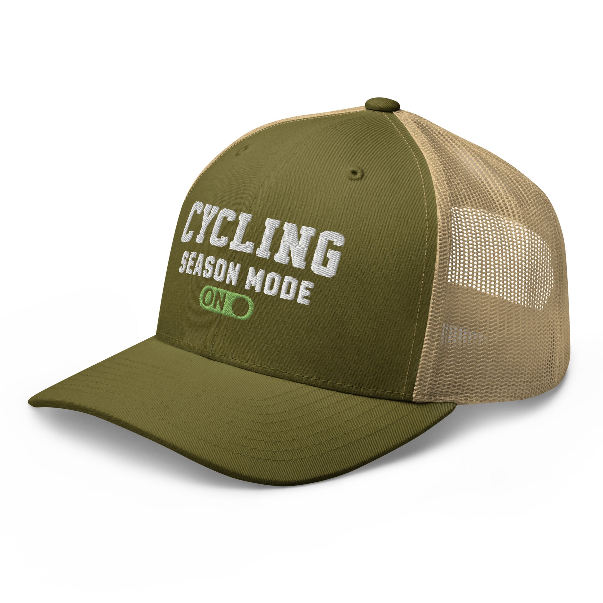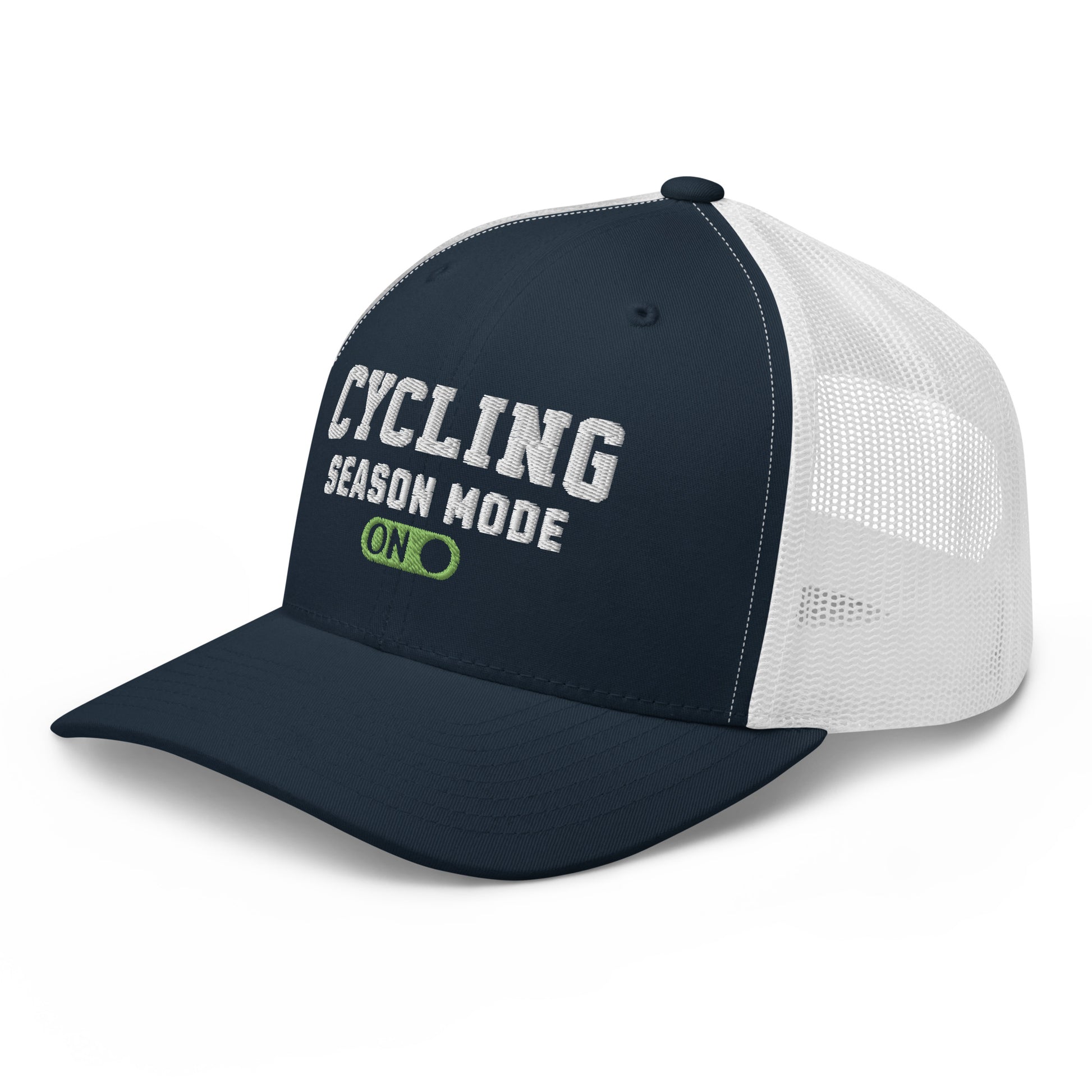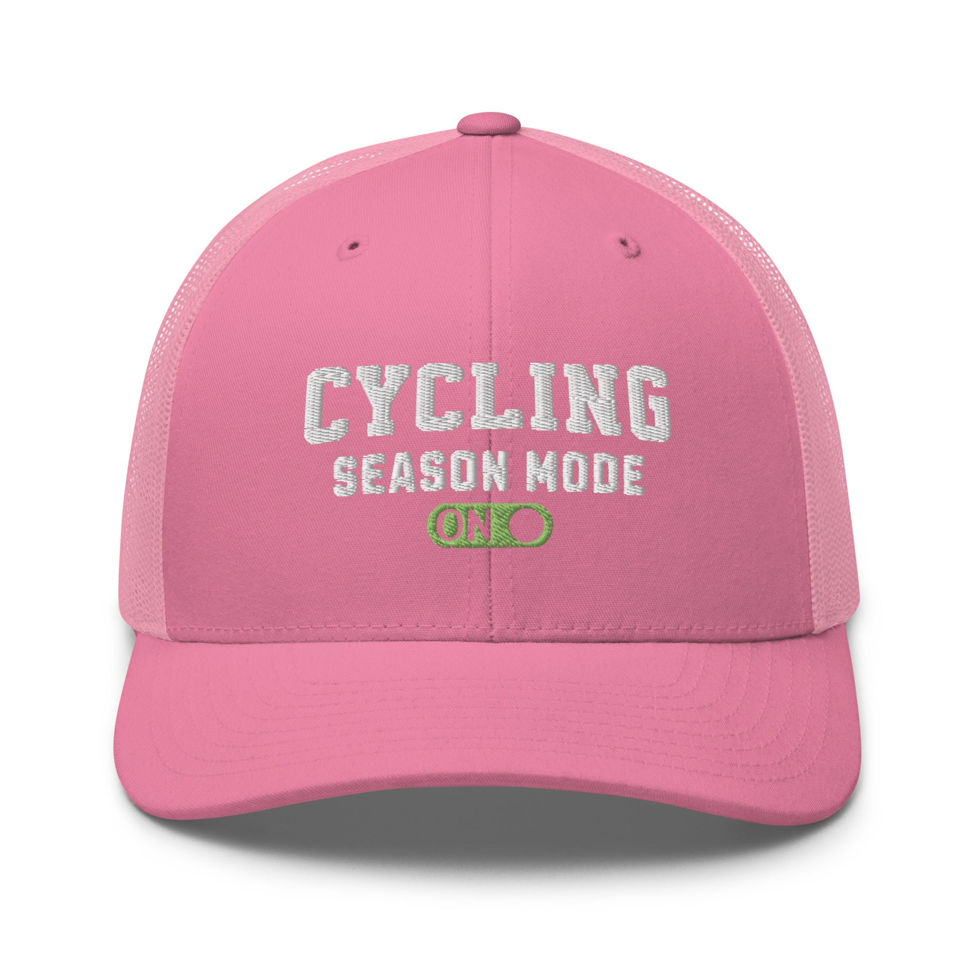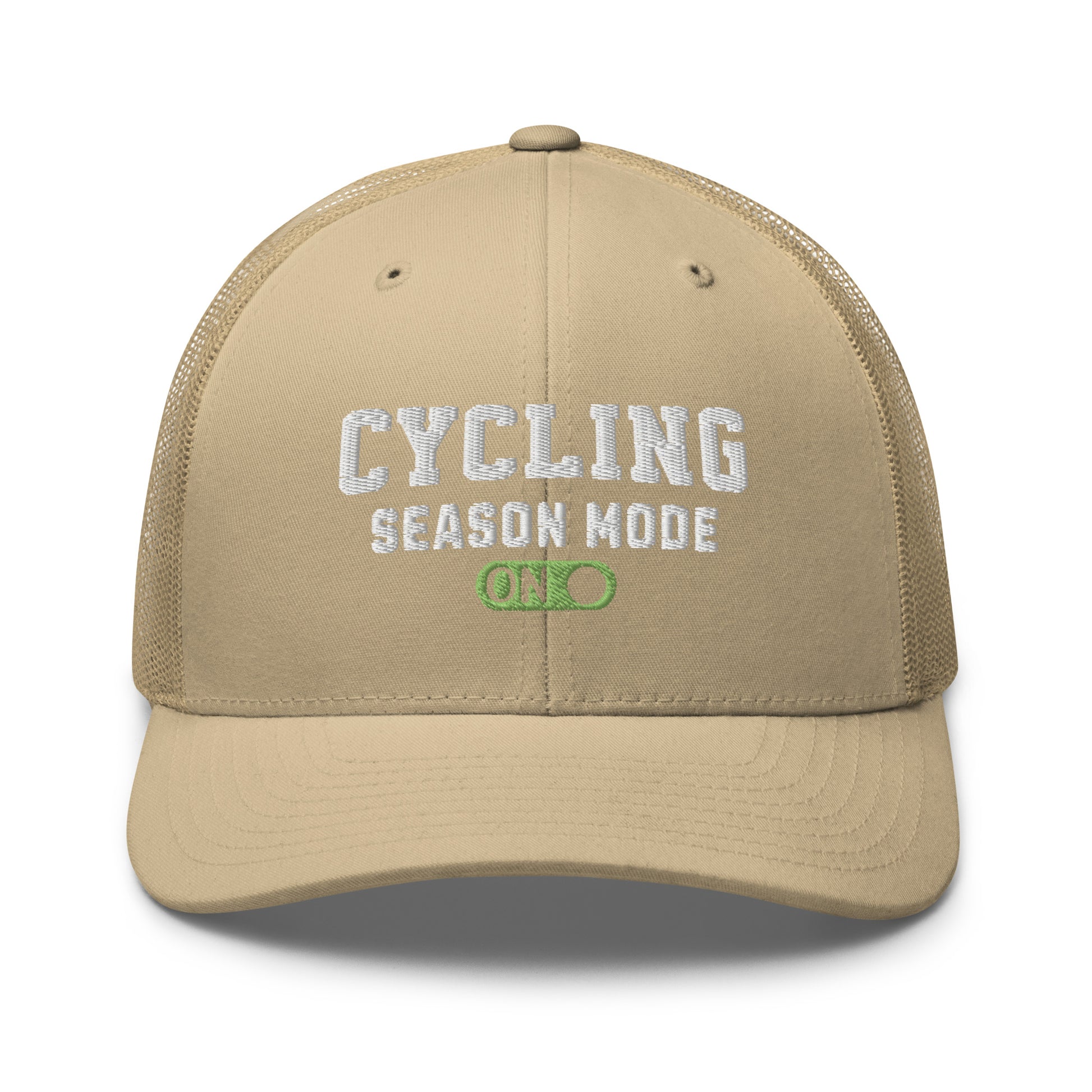 Elevate your sun-soaked adventures with our six-panel trucker hat, designed for ultimate comfort and timeless style. This cap combines classic aesthetics with modern features, making it a must-have for any sunny day. Perfect for cycling enthusiasts, it features an embroidered text "Cycling Season Mode ON" that celebrate your passion.