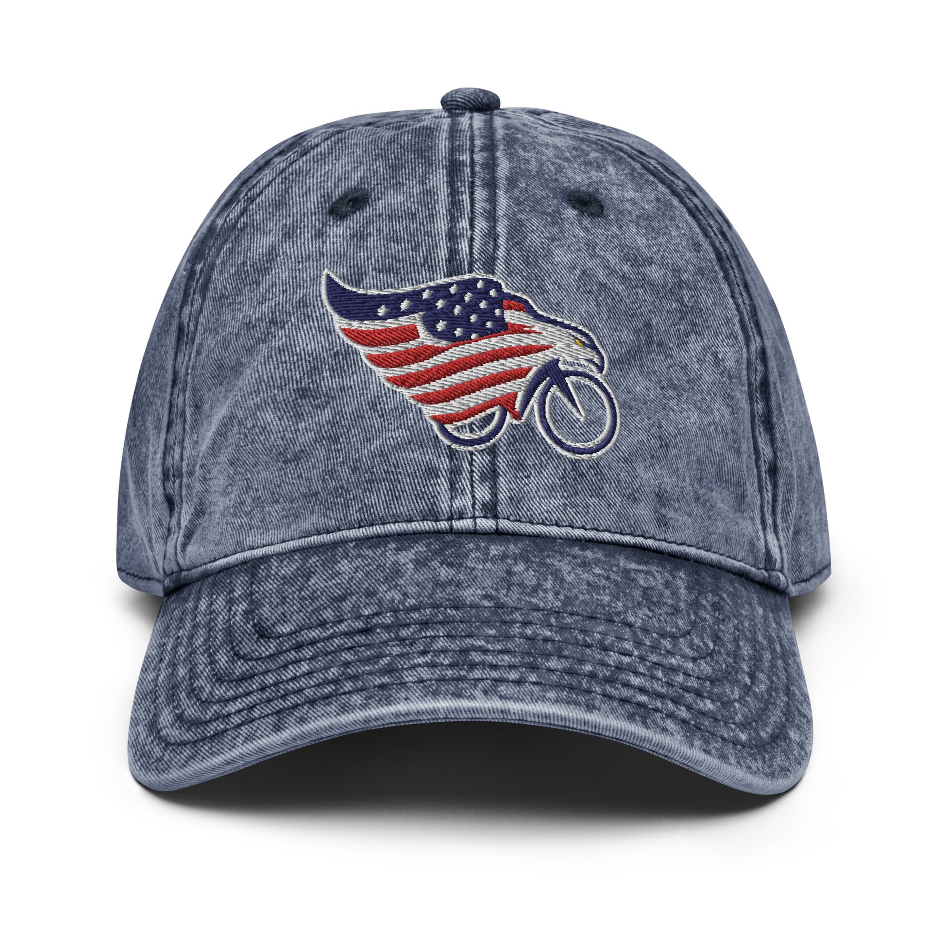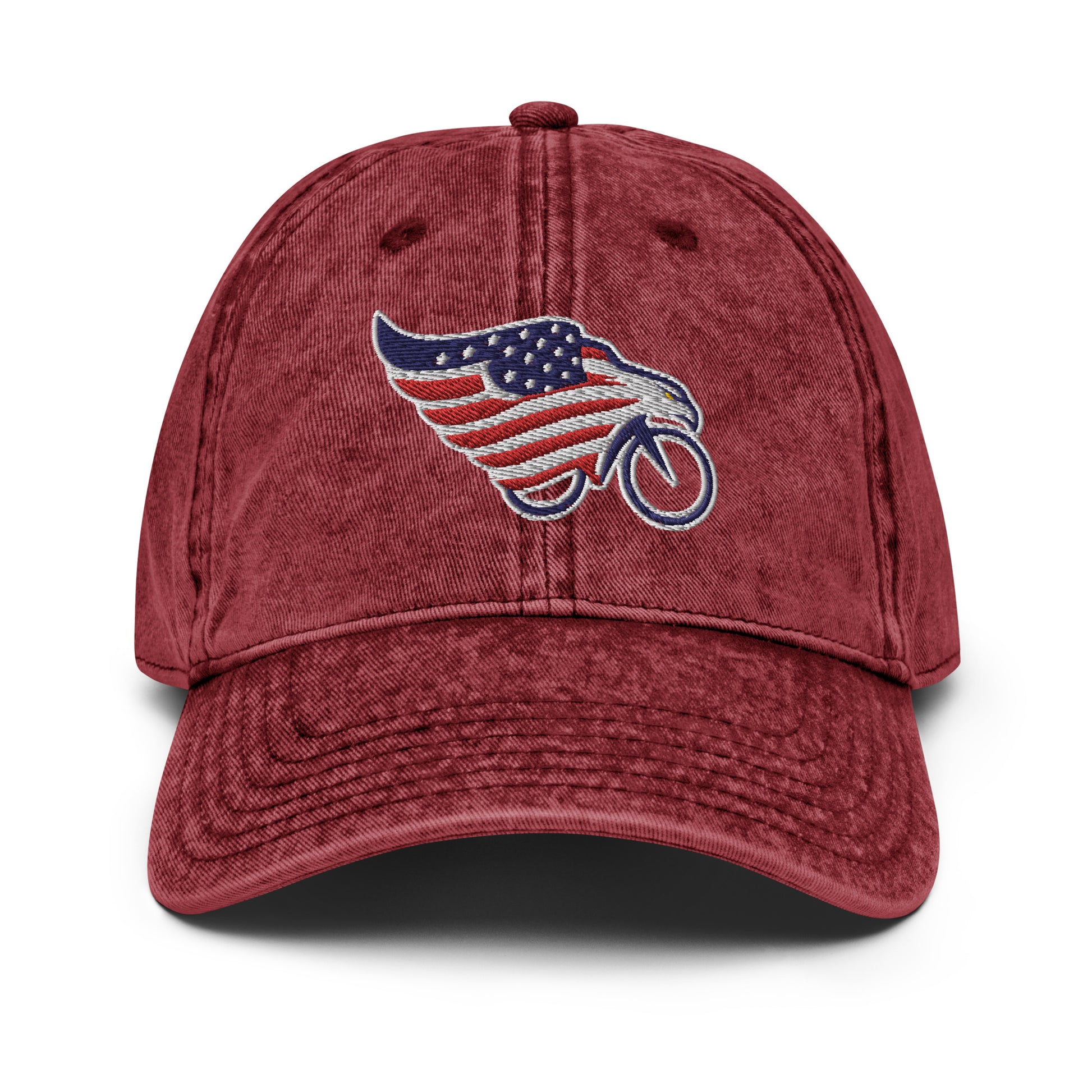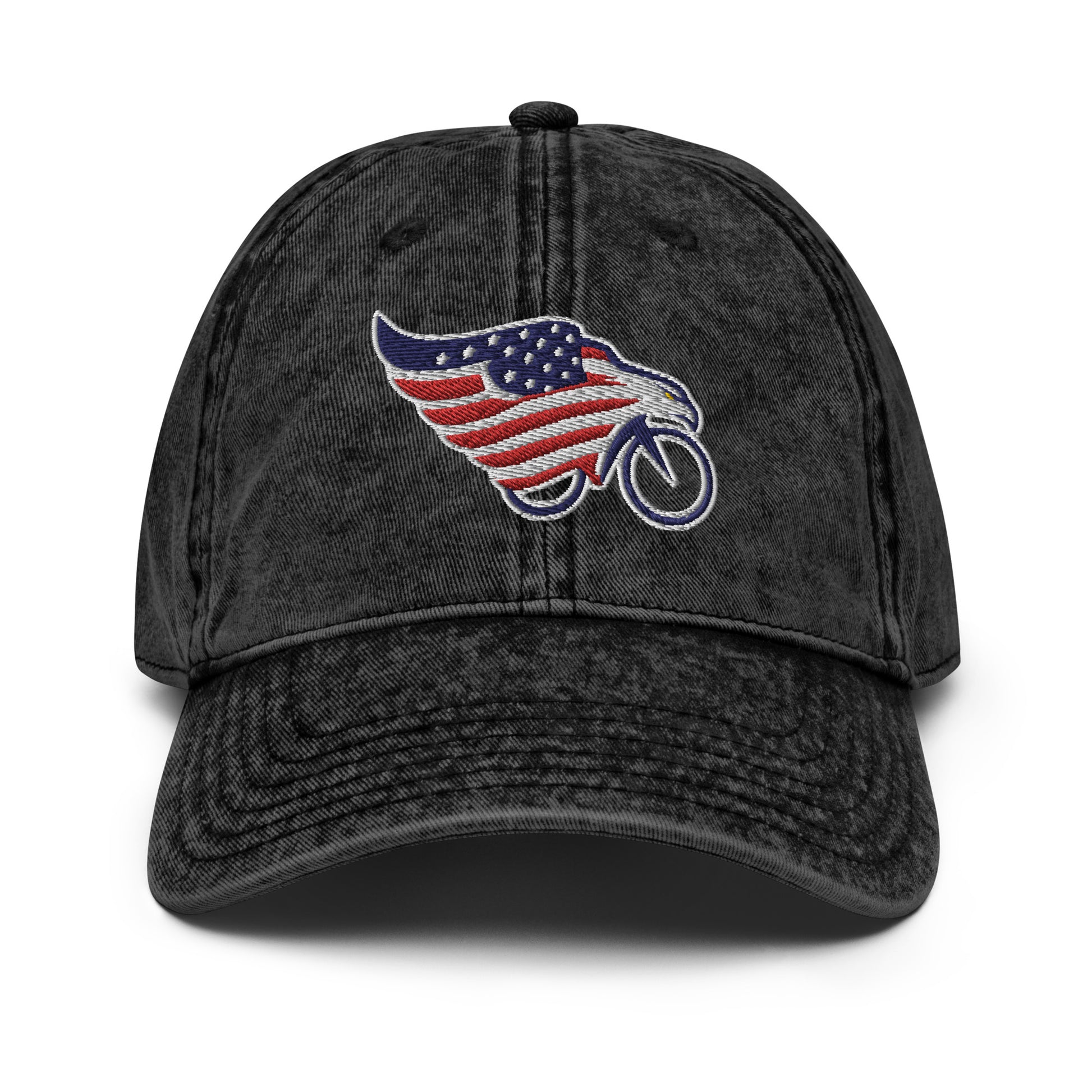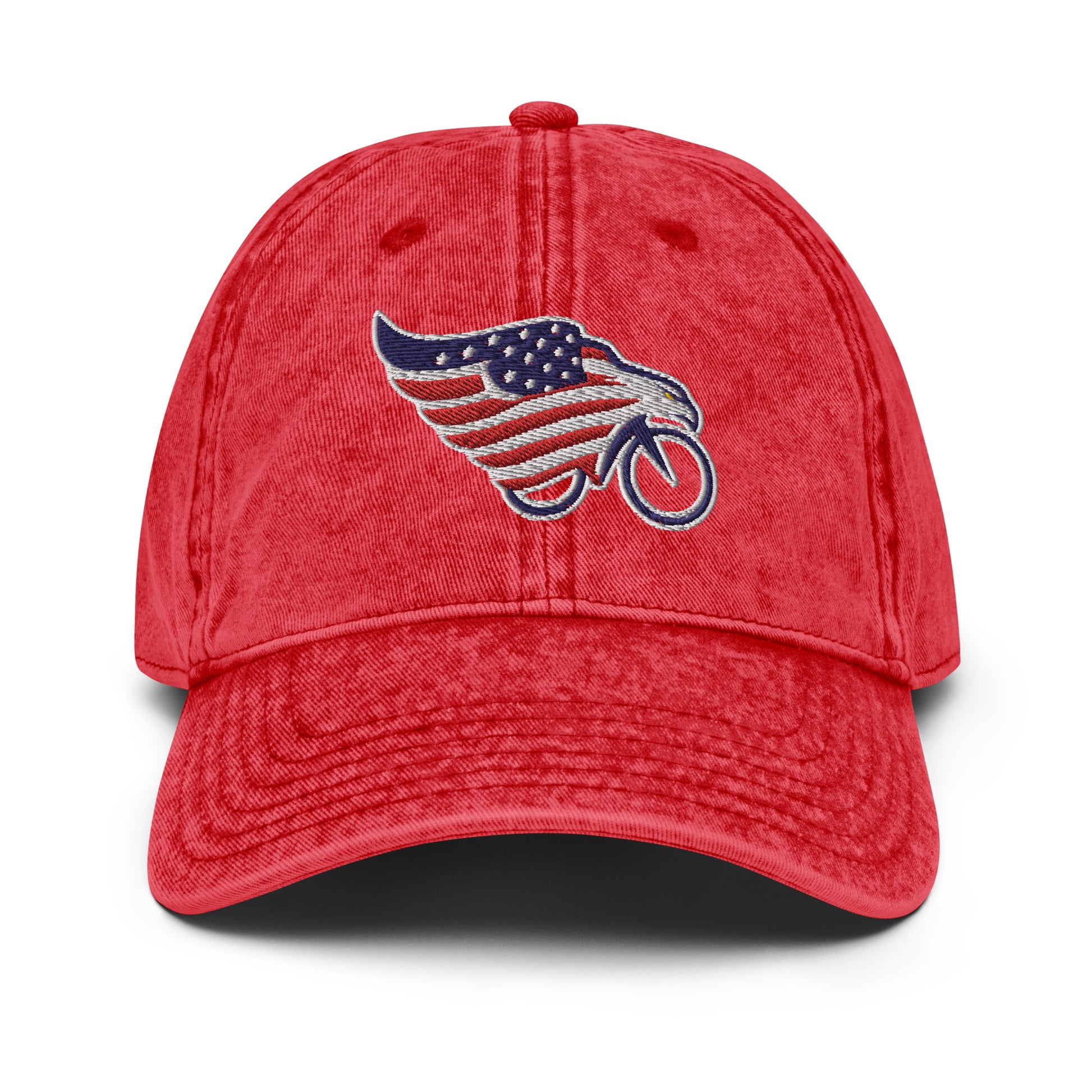 Add a touch of timeless style to your wardrobe with our vintage cotton twill hat. Perfect for cycling enthusiasts, this hat features an eagle made with the American flag and a bicycle. The design is embroidered, and it's a great way to show your passion for cycling and your love for the USA.