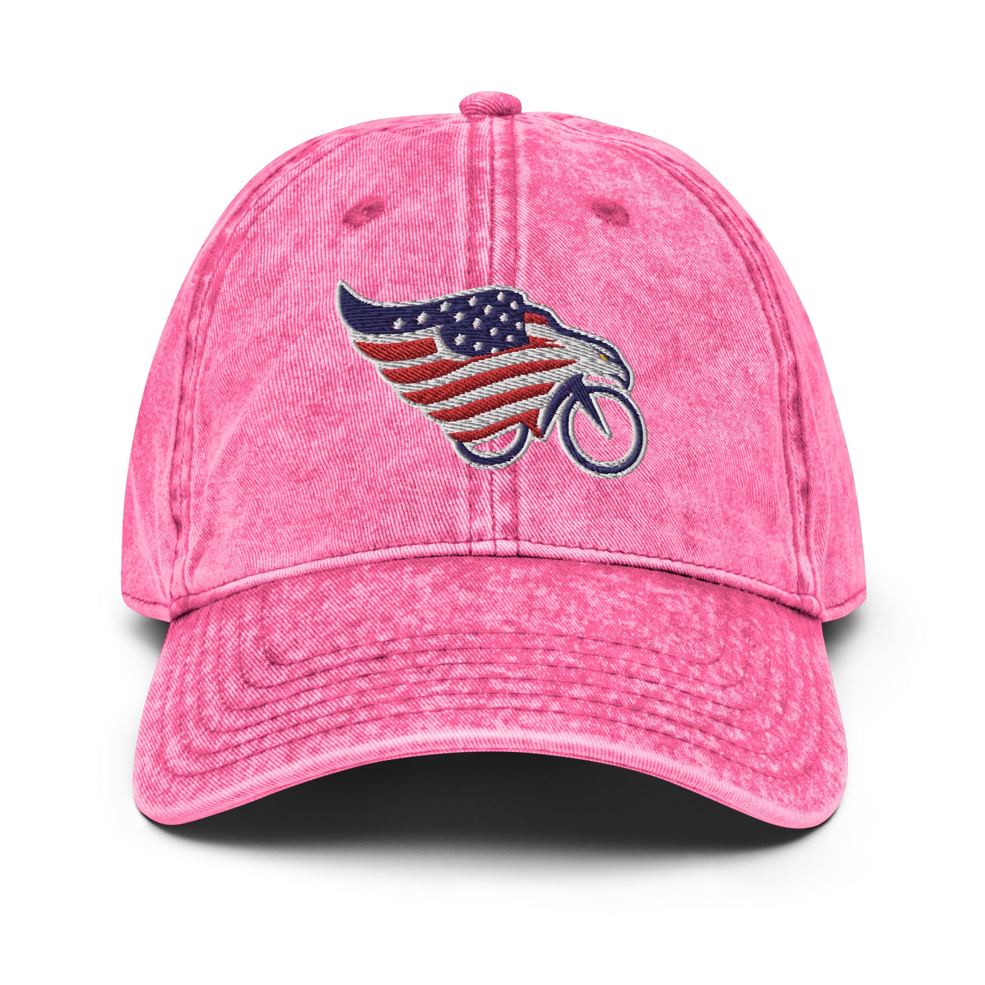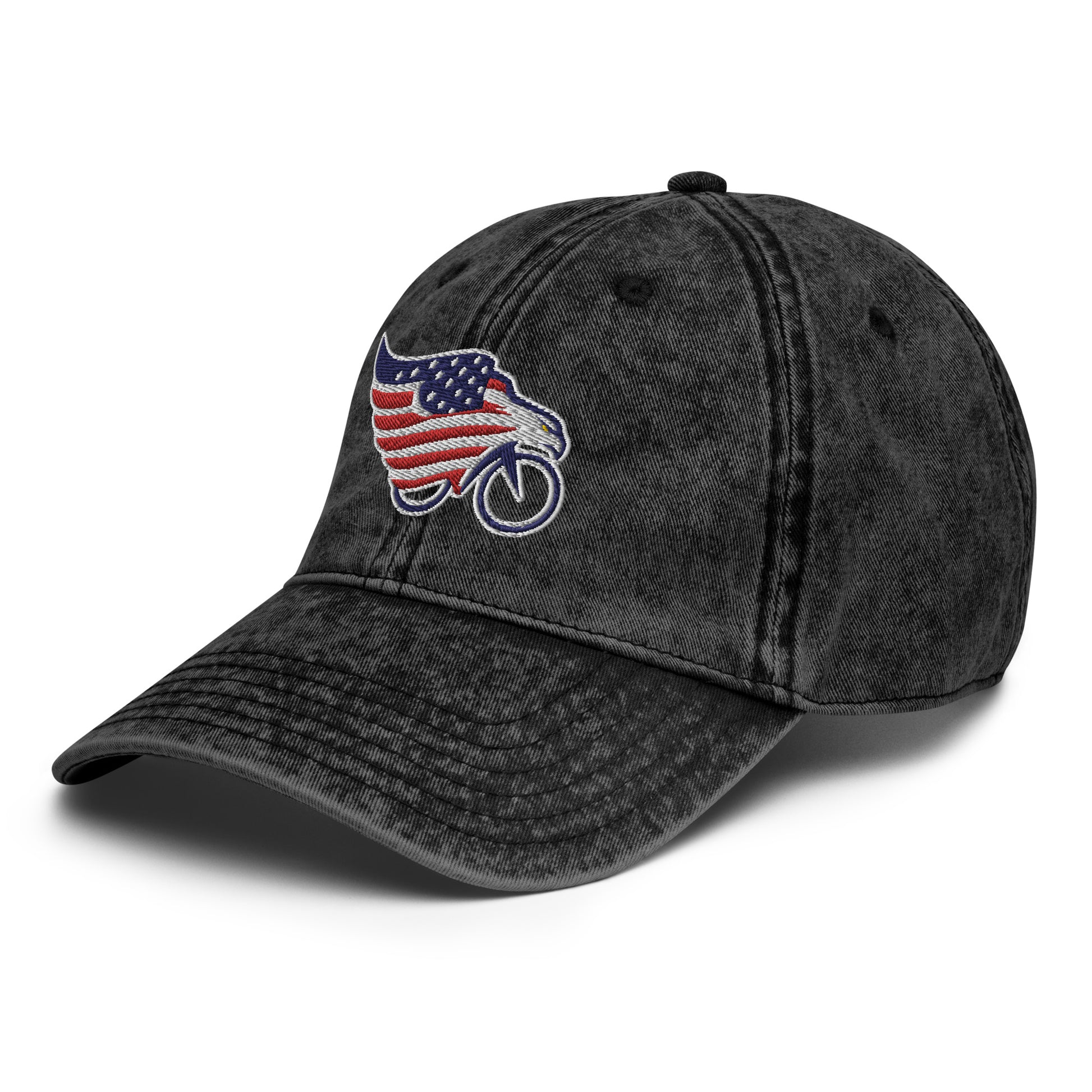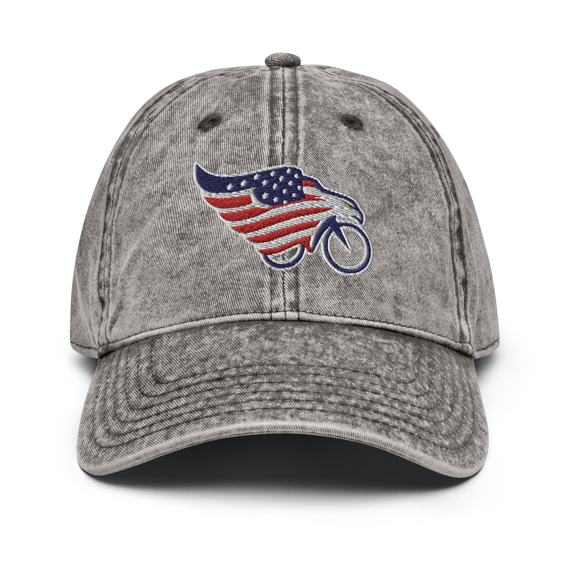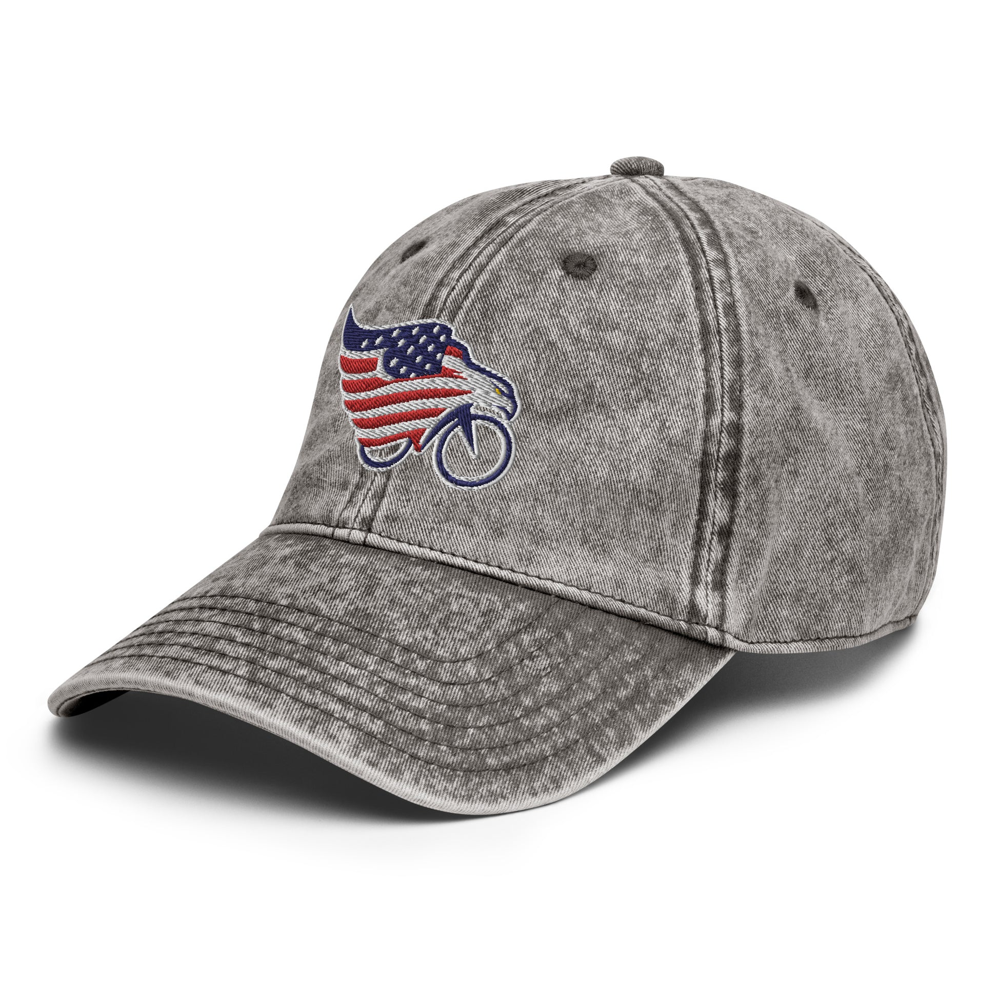Add a touch of timeless style to your wardrobe with our vintage cotton twill hat. Perfect for cycling enthusiasts, this hat features an eagle made with the American flag and a bicycle. The design is embroidered, and it's a great way to show your passion for cycling and your love for the USA.