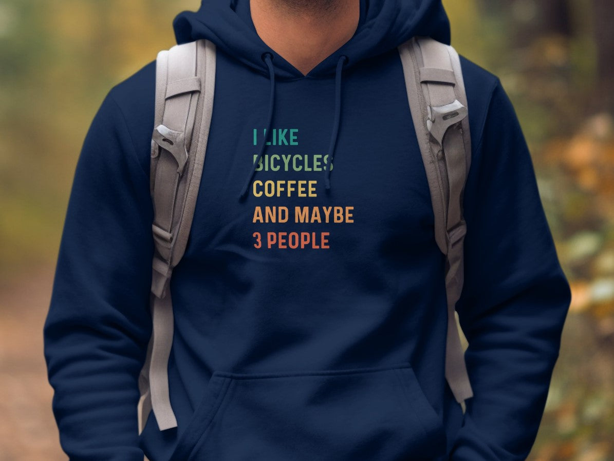 This cozy and humorous unisex hoodie features the quirky phrase "I Like Bicycles Coffee and Maybe 3 People", making it a perfect addition to any bike enthusiast's wardrobe or as a gift for the cyclist with a sense of humor in your life. Crafted for comfort, this hoodie is made from soft, quality material ensuring a fit true to size, ideal for those casual rides, coffee shop stops, or just lounging at home. It's an excellent gift idea for birthdays, holidays, or any occasion to make a cyclist smile. Add this unique and comfy pullover to your collection and show off your love for bikes, coffee, and selective company!