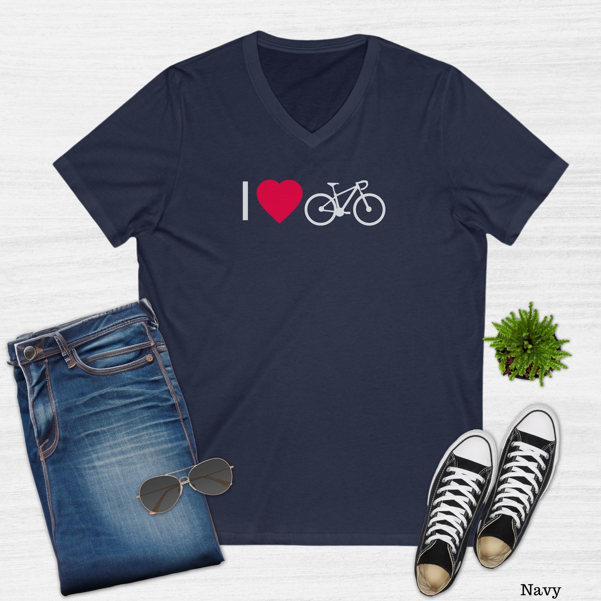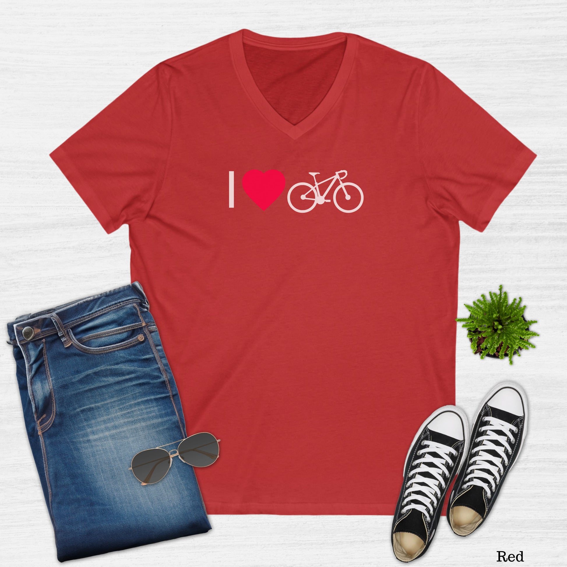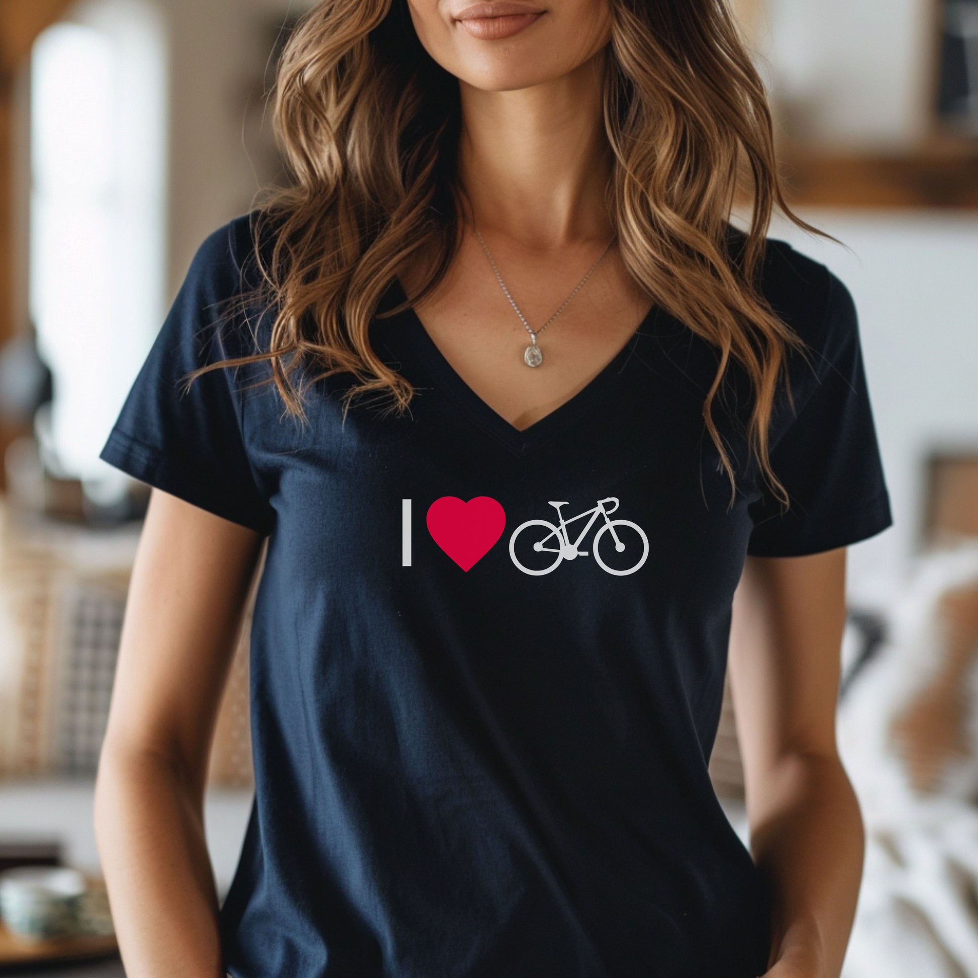 This stylish V-neck t-shirt is perfect for all women who love bikes and cycling. Featuring a cute heart bike graphic, "I love Bikes" it's a must-have for biking enthusiasts. Ideal for casual wear or as a thoughtful gift for bike lovers. Stay comfortable and trendy with this bike lover top.