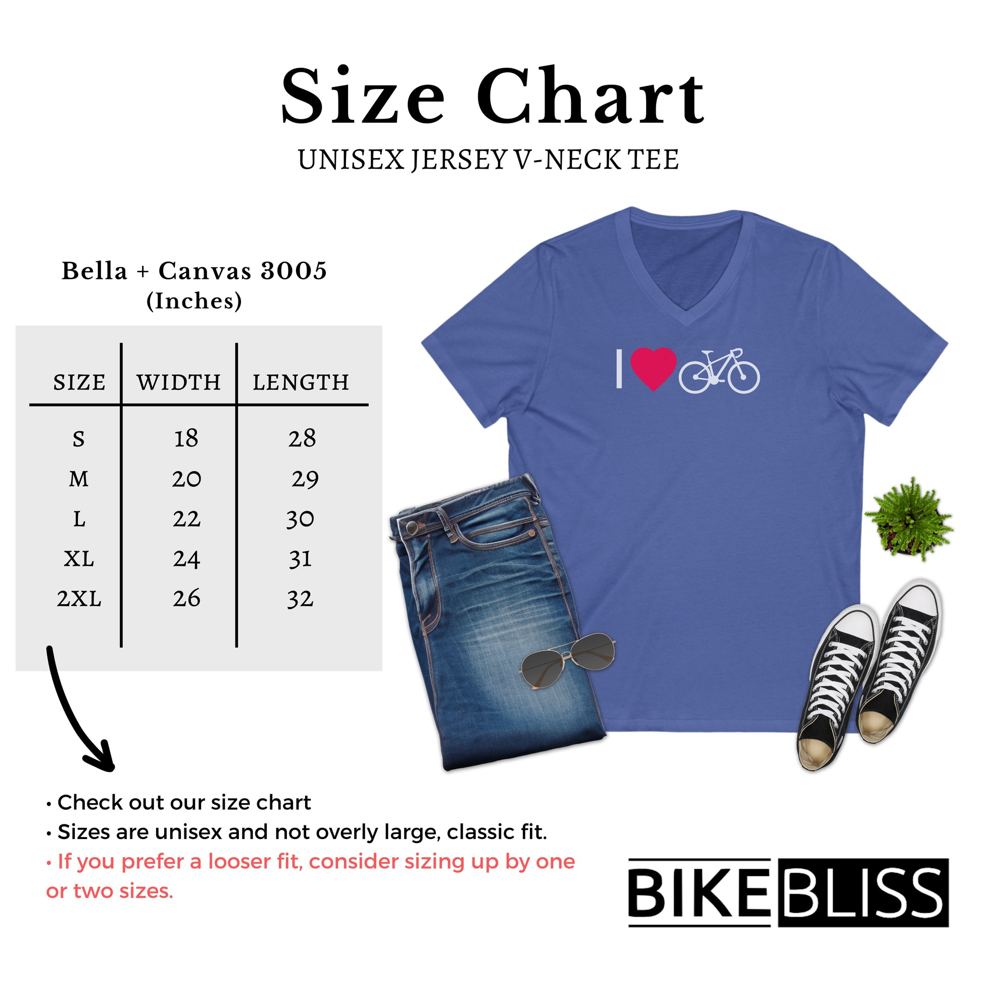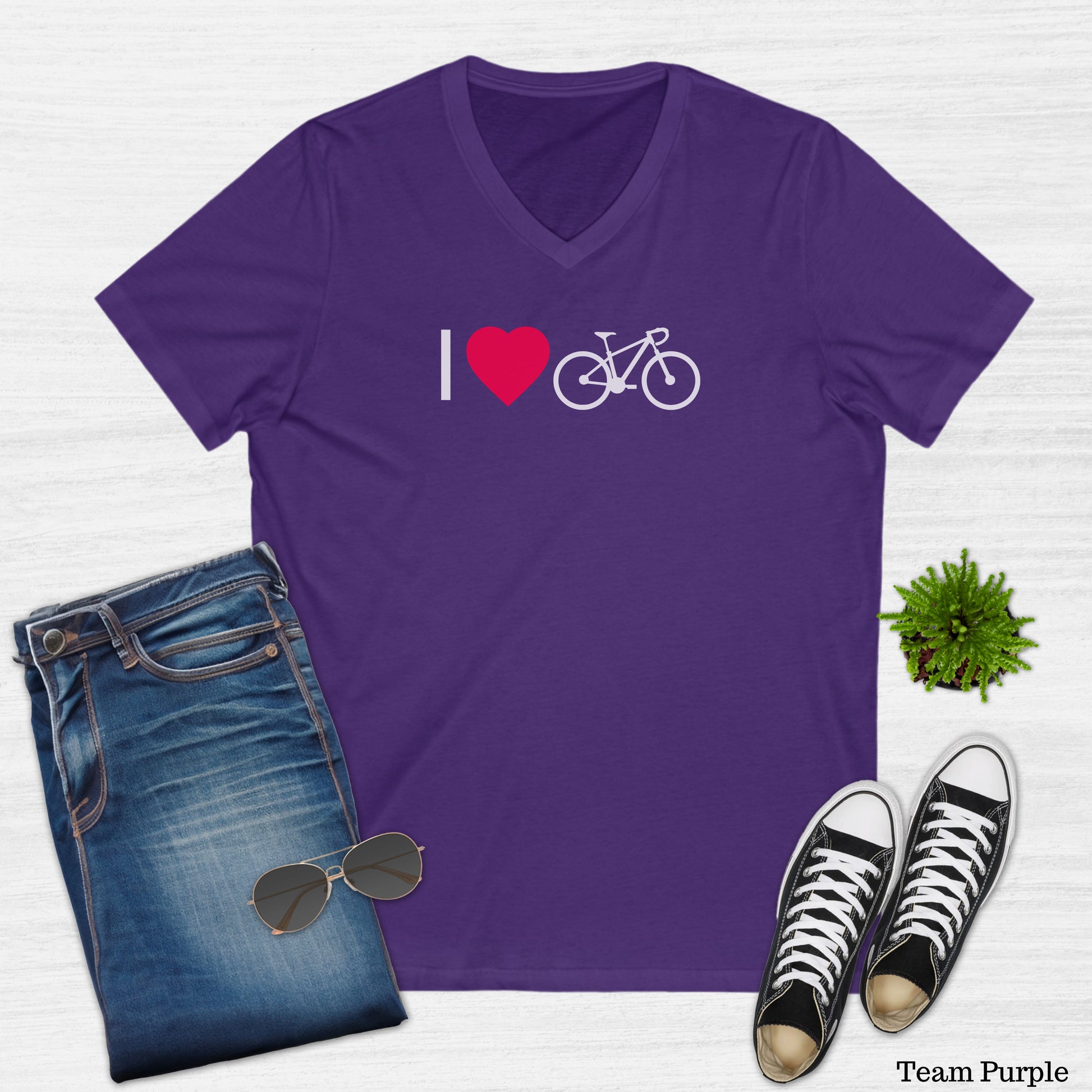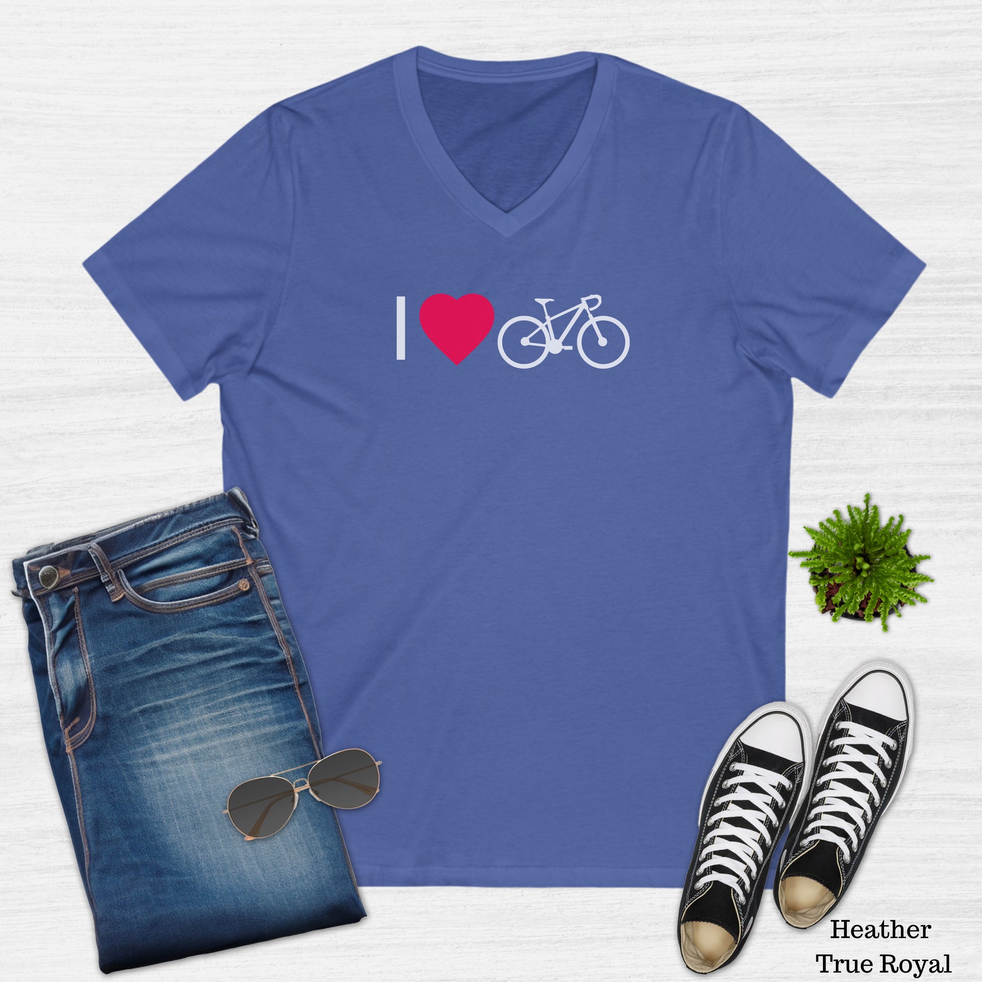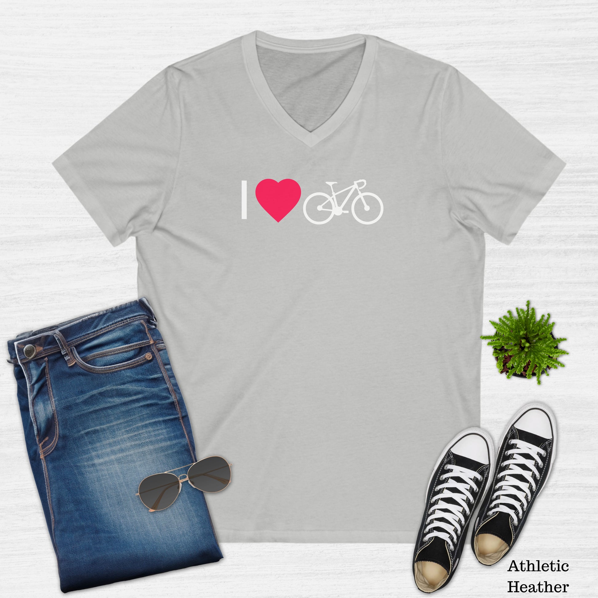 This stylish V-neck t-shirt is perfect for all women who love bikes and cycling. Featuring a cute heart bike graphic, "I love Bikes" it's a must-have for biking enthusiasts. Ideal for casual wear or as a thoughtful gift for bike lovers. Stay comfortable and trendy with this bike lover top.