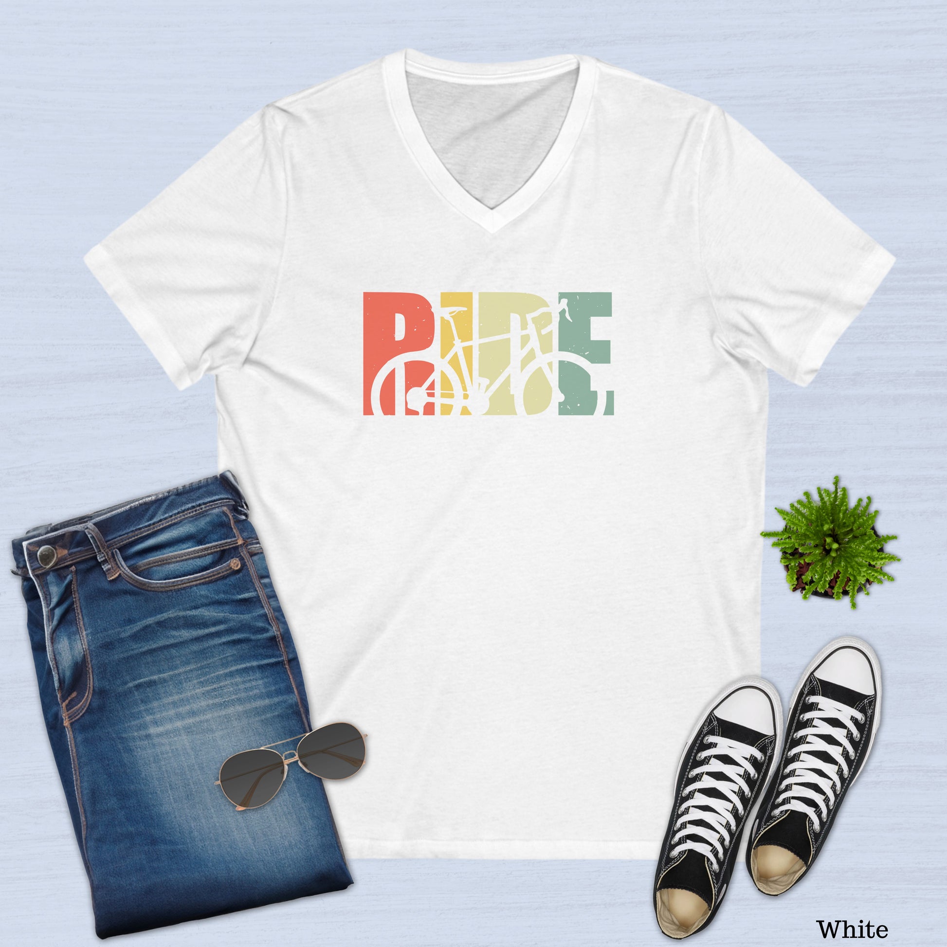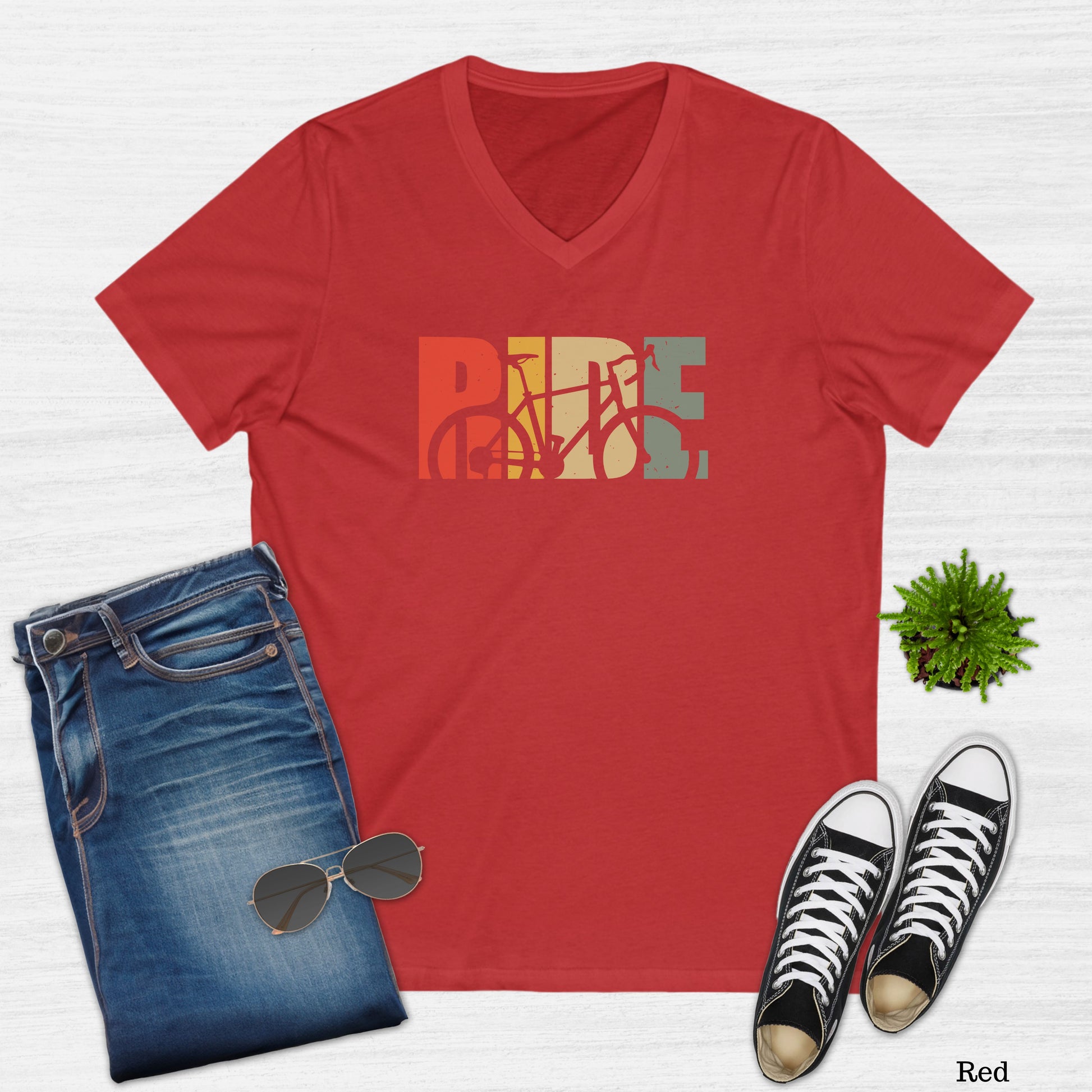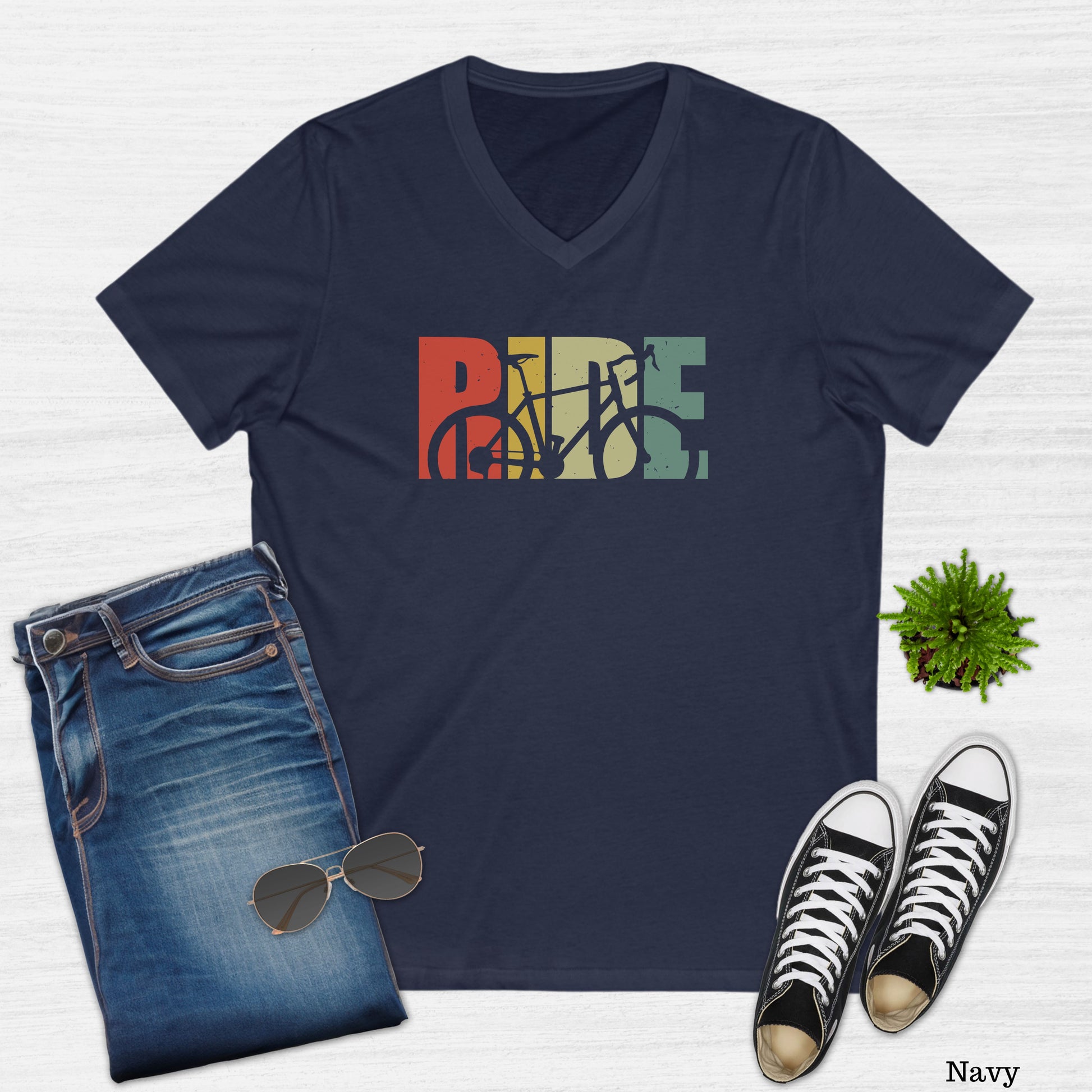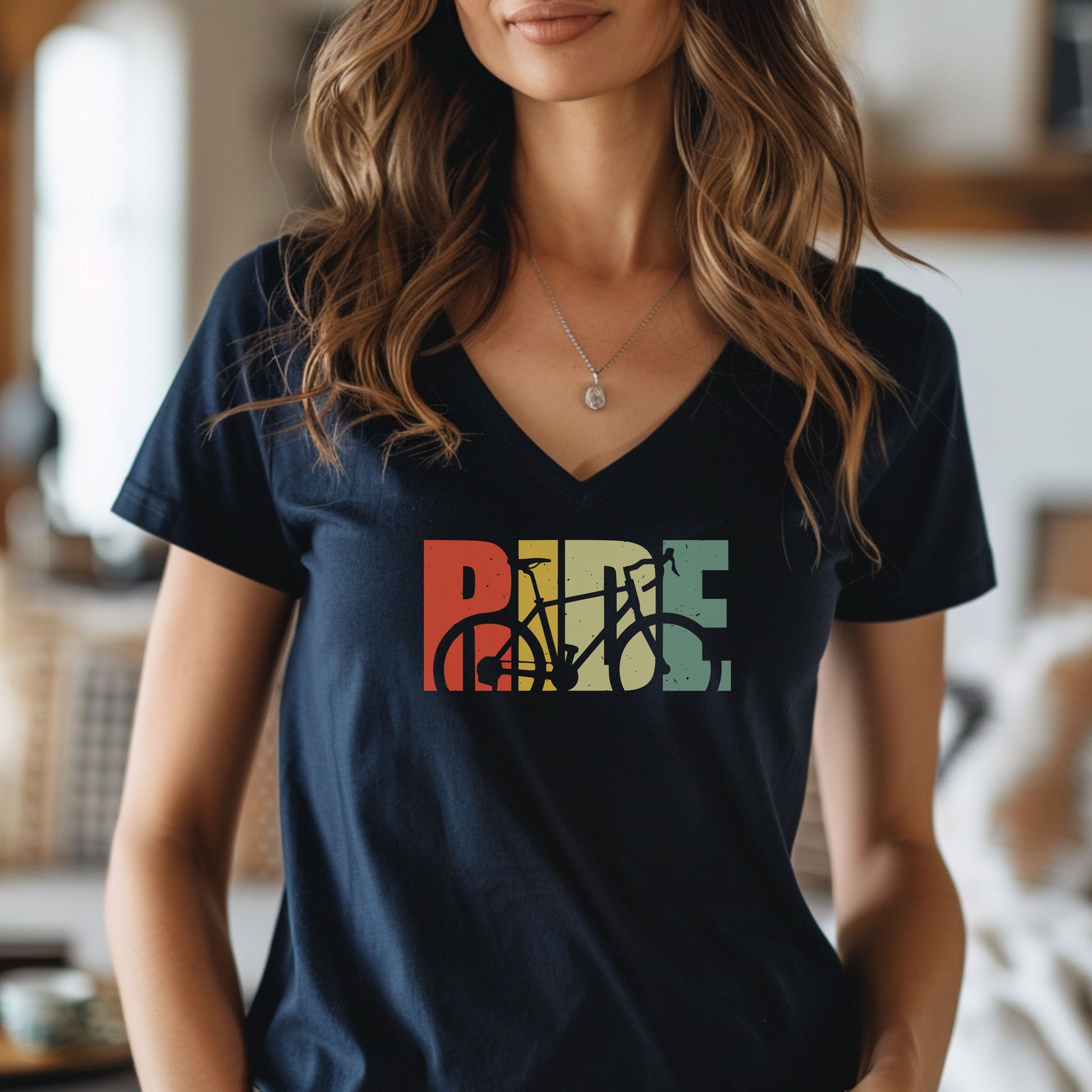 This vintage ride graphic t-shirt features a cool cycling design perfect for women who love bikes and outdoor adventure. Comfortable casual style with a retro bike theme, this women's v-neck tee is ideal for everyday wear or biking trips. Enjoy the perfect blend of style and comfort with this unique, eye-catching design.