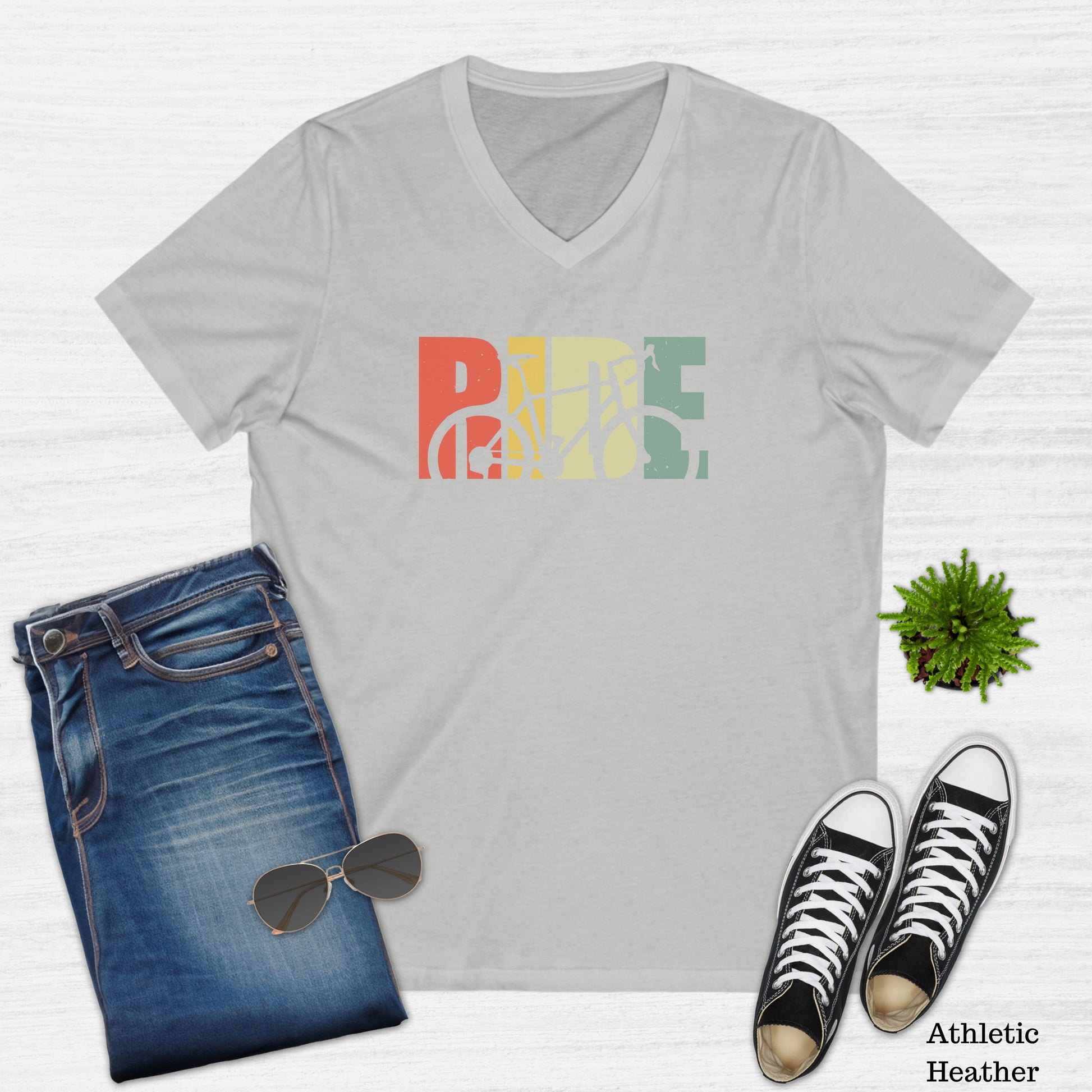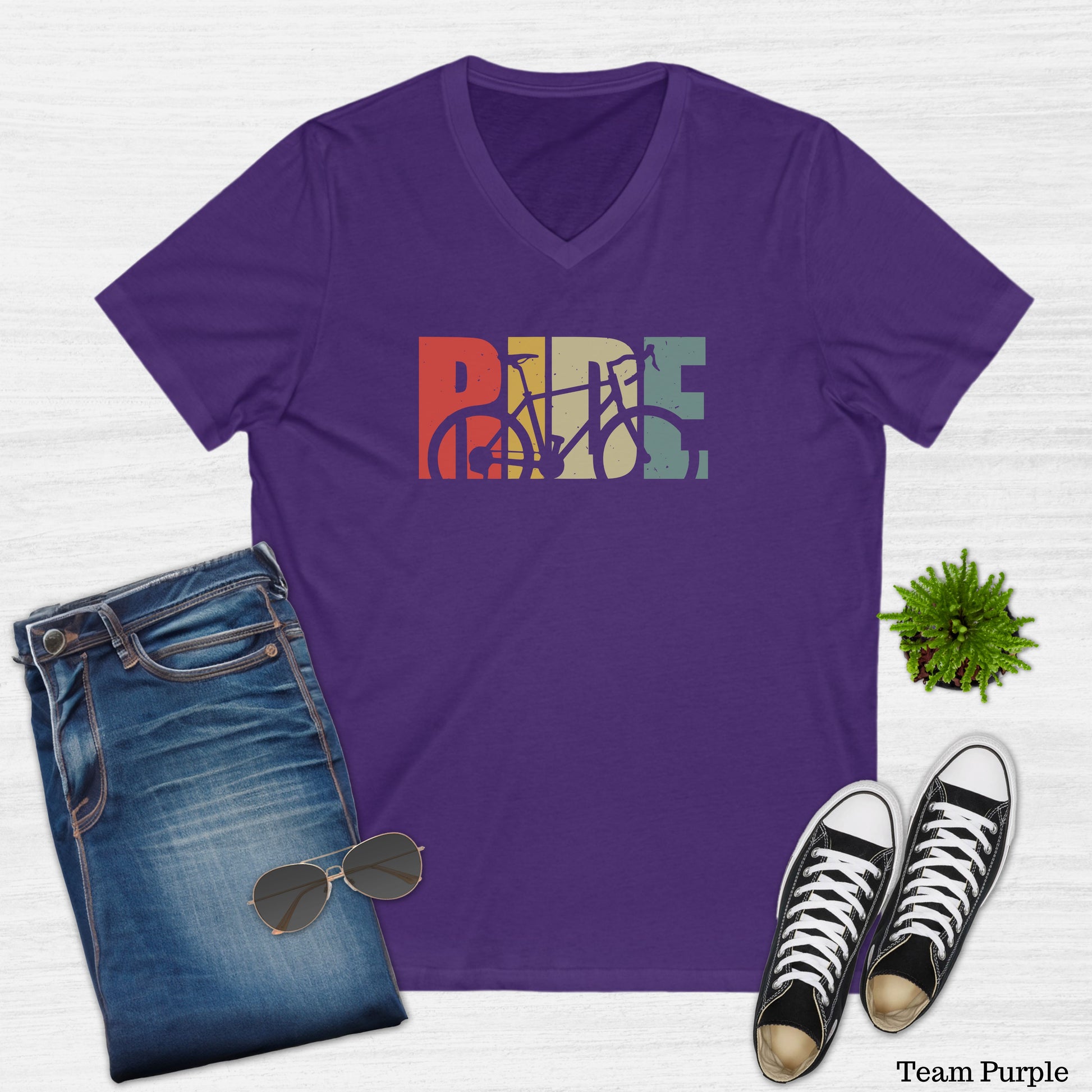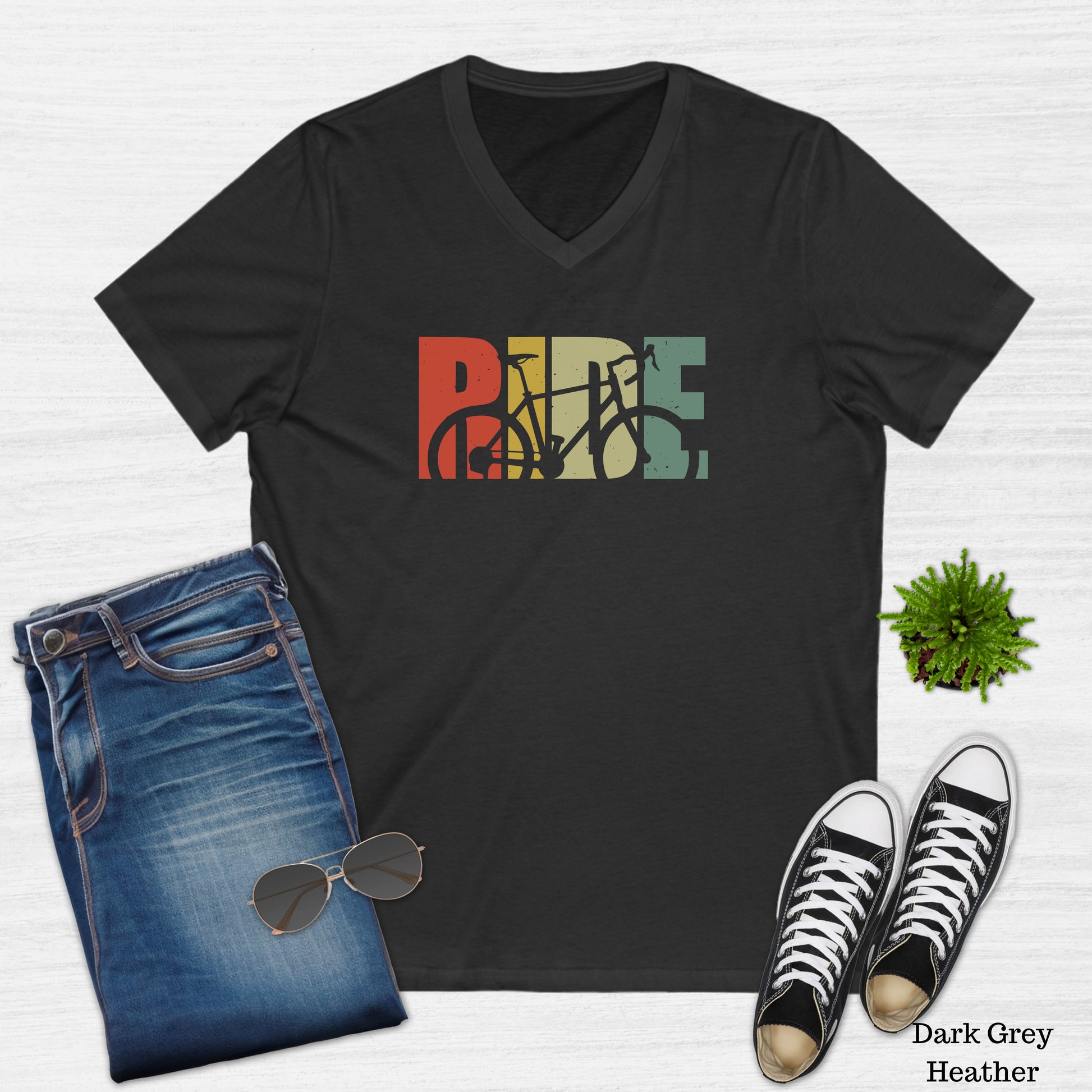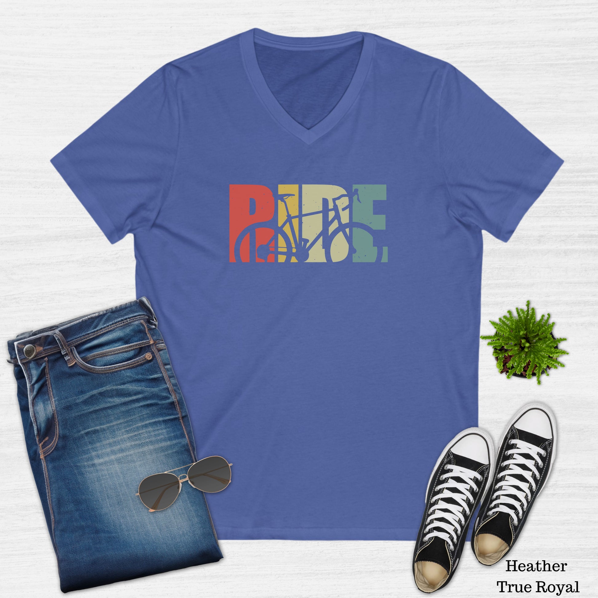 This vintage ride graphic t-shirt features a cool cycling design perfect for women who love bikes and outdoor adventure. Comfortable casual style with a retro bike theme, this women's v-neck tee is ideal for everyday wear or biking trips. Enjoy the perfect blend of style and comfort with this unique, eye-catching design.