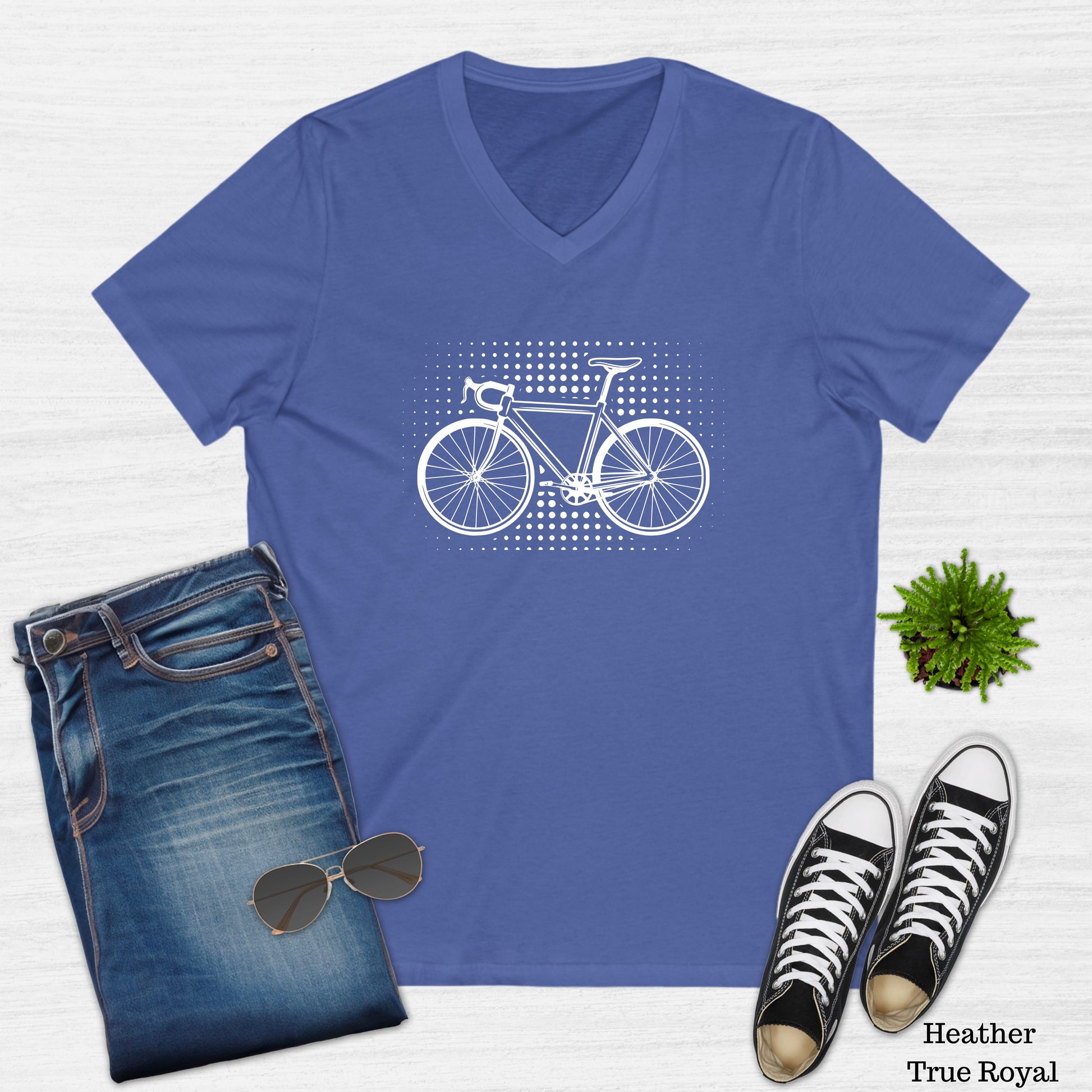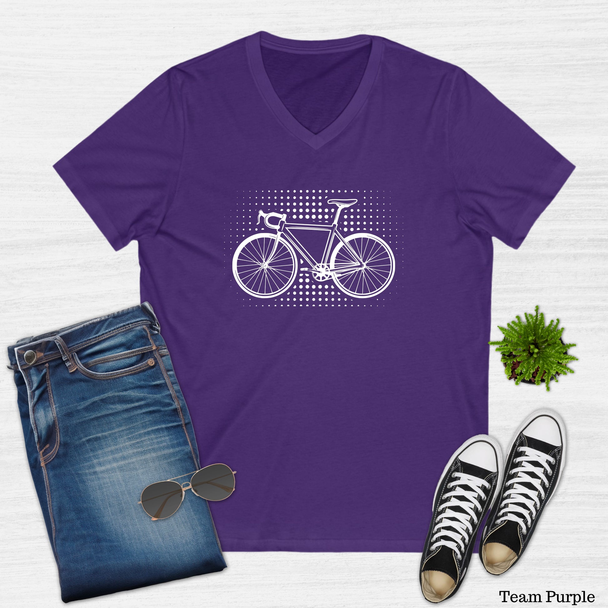 Express your love for cycling with our Vintage Bicycle Graphic Tee. Featuring a retro bike design with a distinctive dot pattern, this unisex v-neck t-shirt is perfect for casual wear. Fit to size and designed for comfort. Perfect for any cycling enthusiast, our Vintage Bicycle v-neck tee makes a great gift or a stylish addition to your own collection.