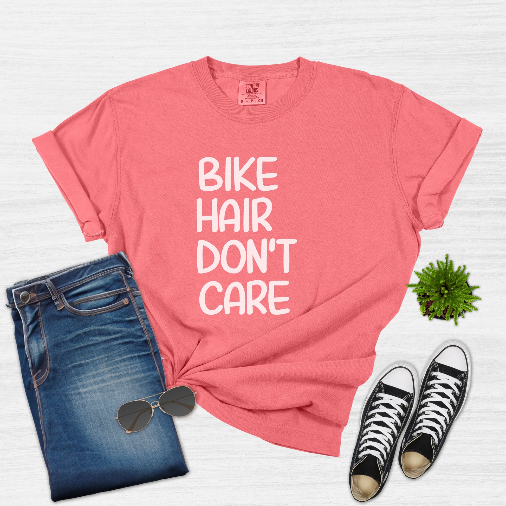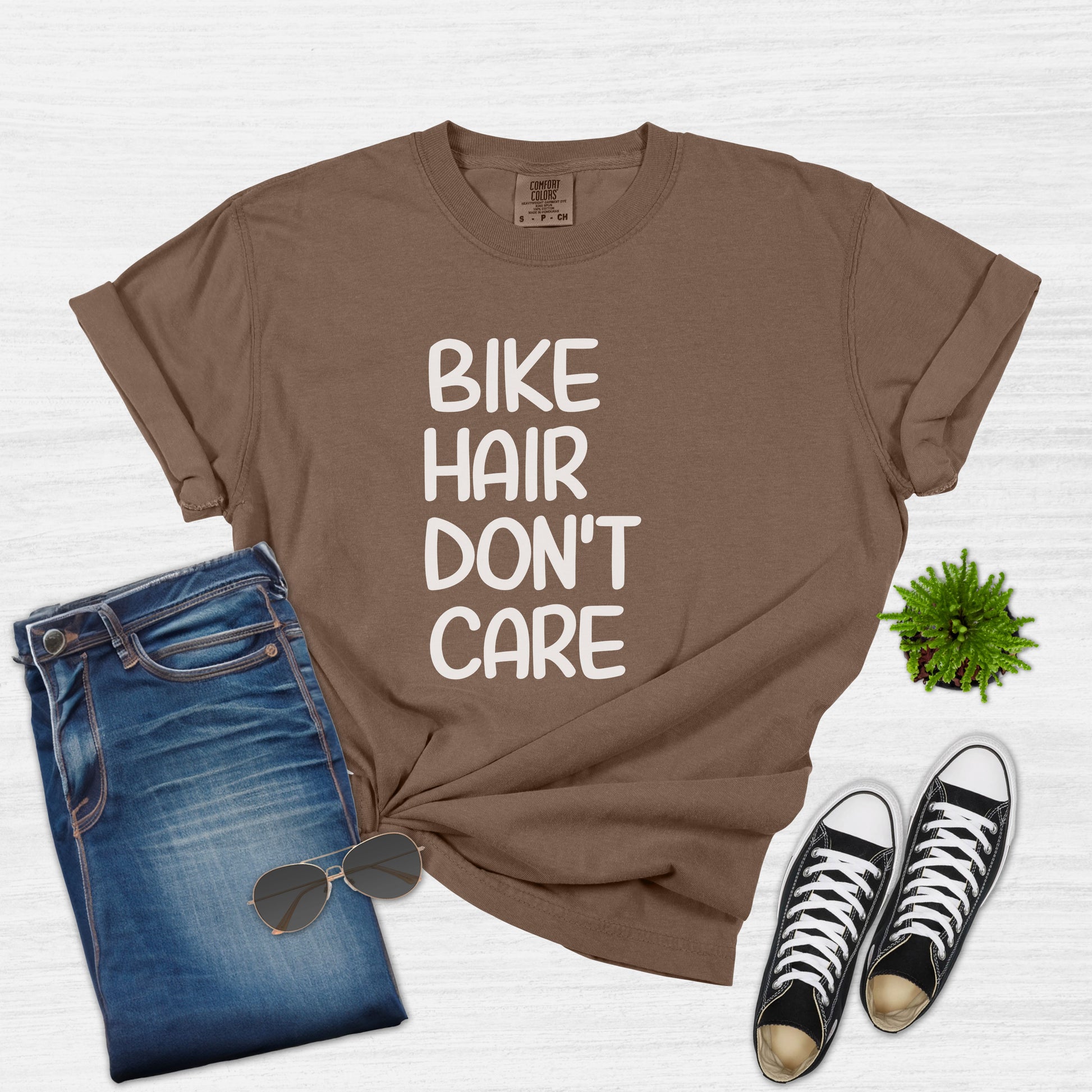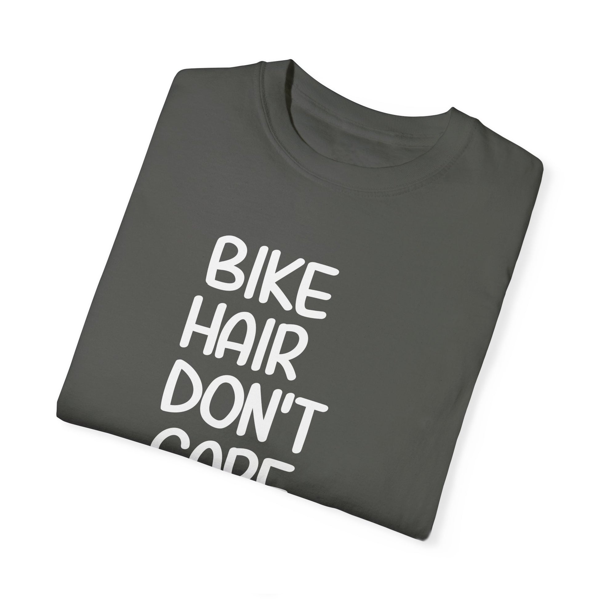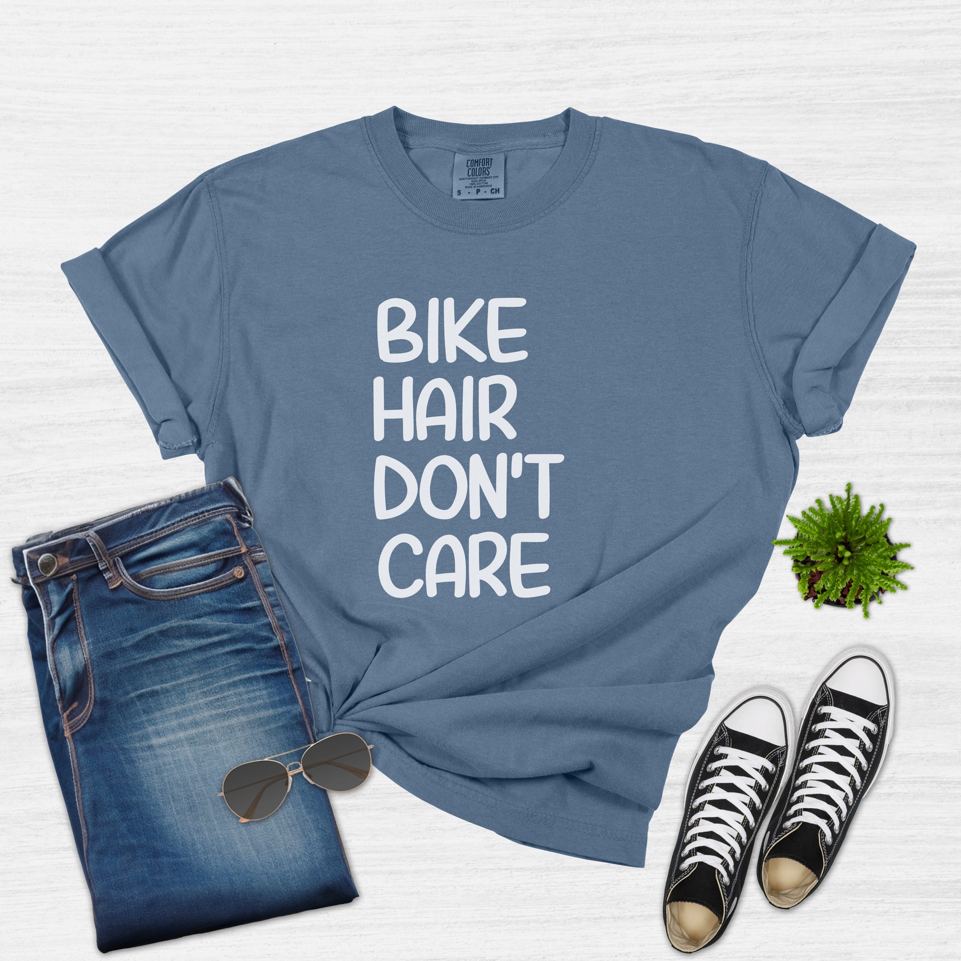 Embrace the cyclist in you with this comfortable and stylish 'Bike Hair Don't Care' t-shirt, perfect for any woman who loves cycling. Whether you're hitting the trails, cruising the city streets, or simply running errands, this tee will keep you feeling cool and looking great. Made with high-quality materials, it's a perfect gift for your mom, wife, daughter, or friend on their birthday, Christmas, Mother's Day, or just because. Celebrate the bike enthusiast in your life with this fun and casual top!