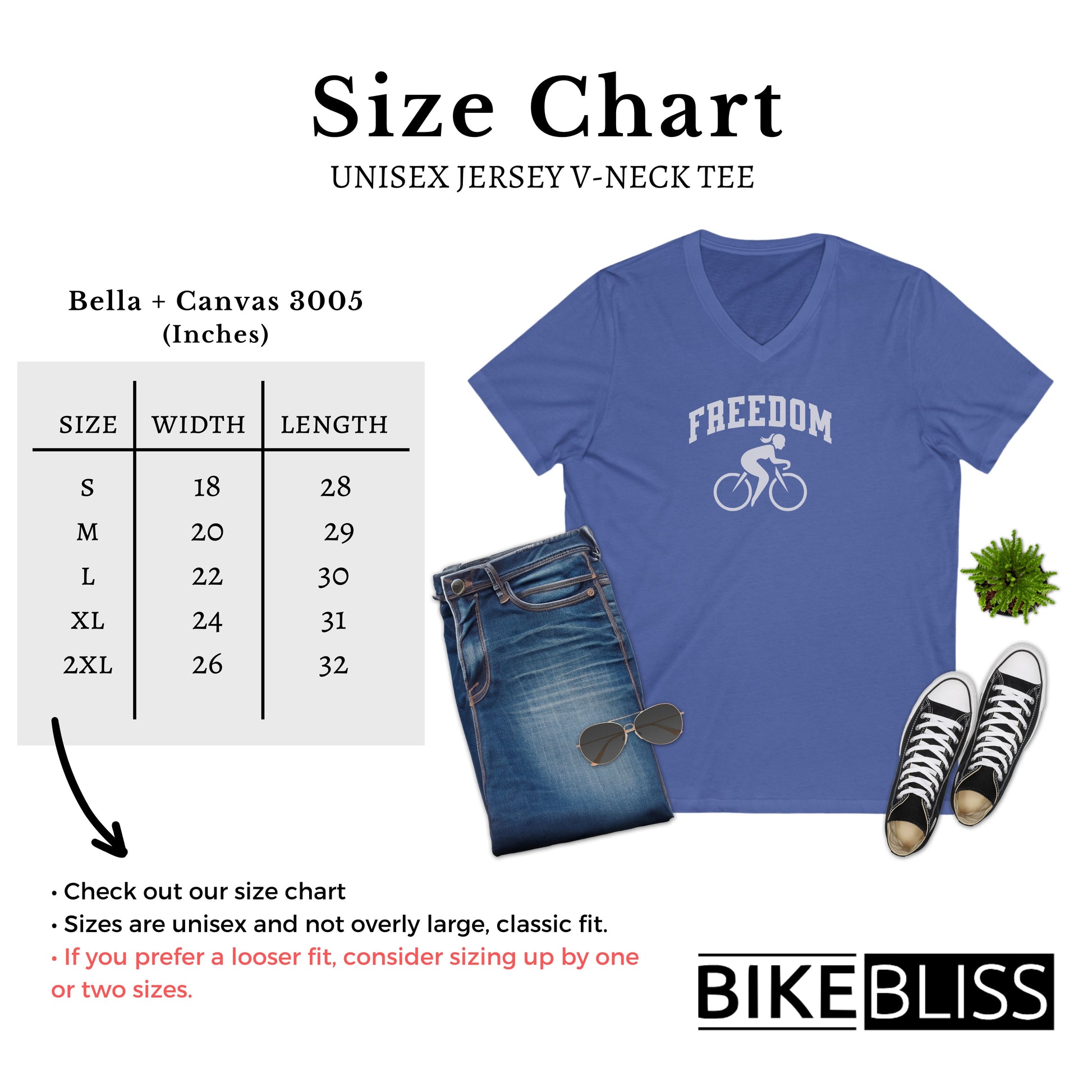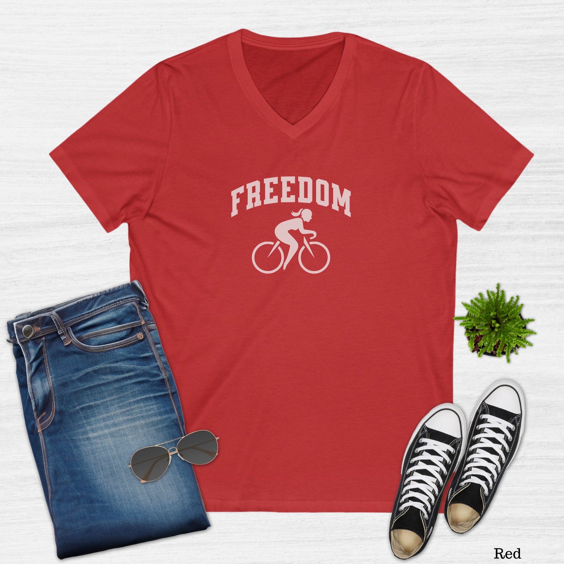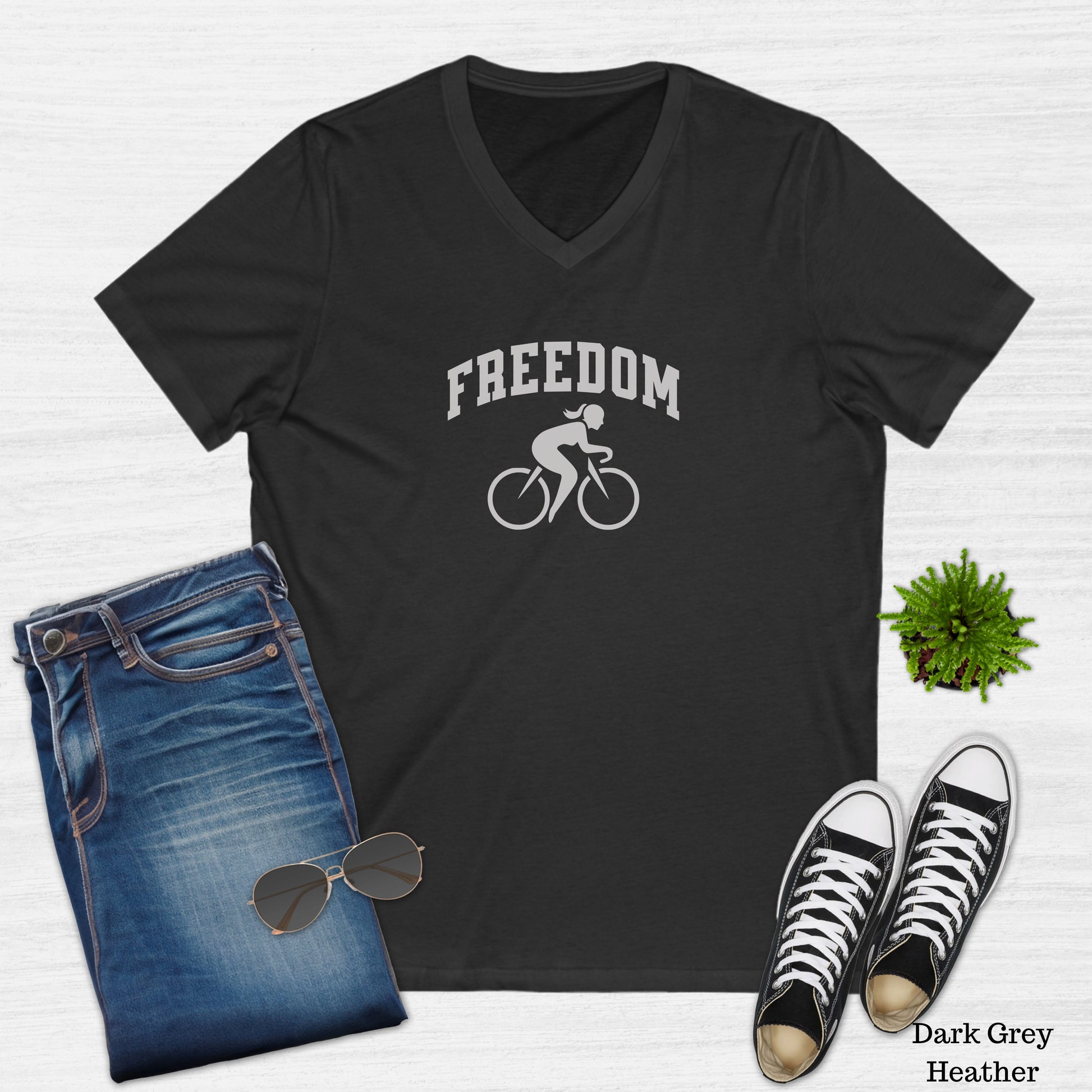 Embrace your love for cycling with this Women's Freedom Bike Graphic V-Neck T-Shirt. Perfect for any cycling enthusiast, this tee showcases a sleek bicycle rider and motivational "Freedom" message, making it a must-have for your casual wardrobe.